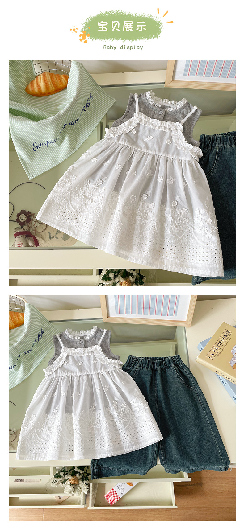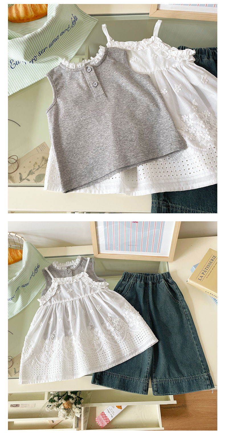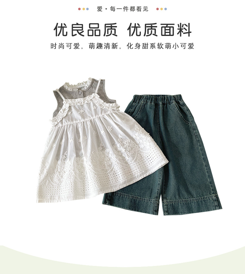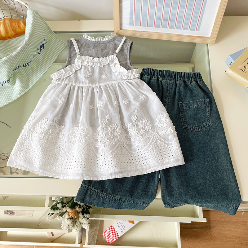 여아 아동복 2025 여름 신작 민소매 조끼 세련된 레이스 스타일 서스펜더 바지 3 피스 세트