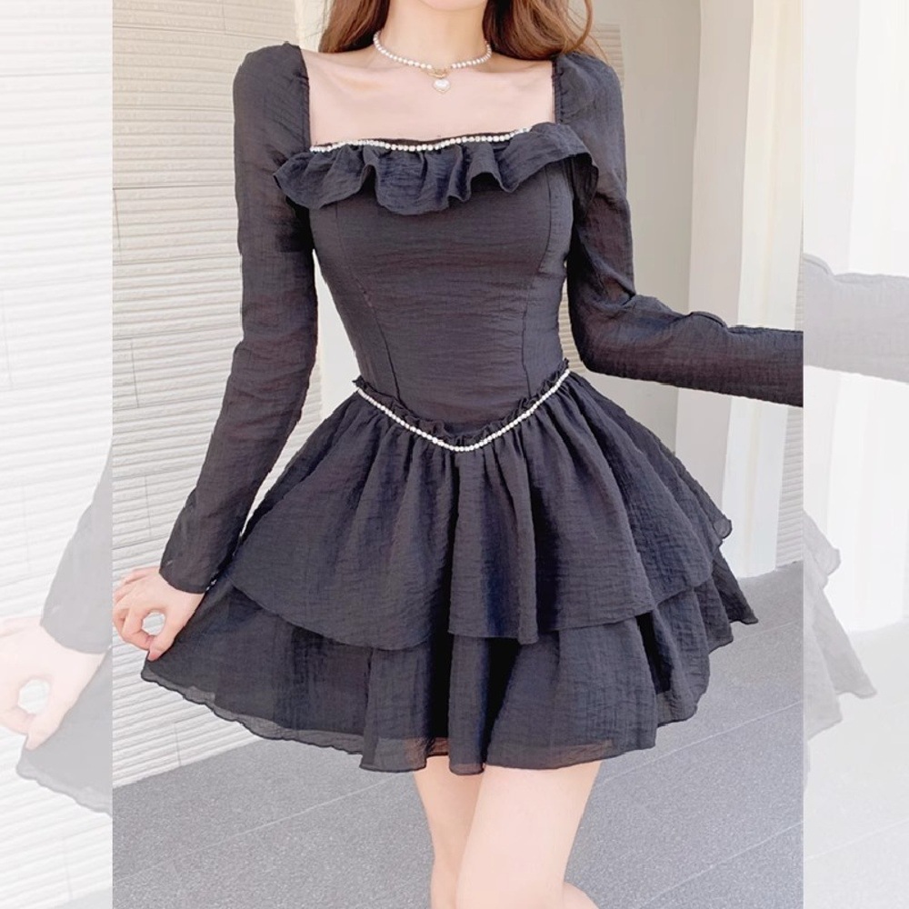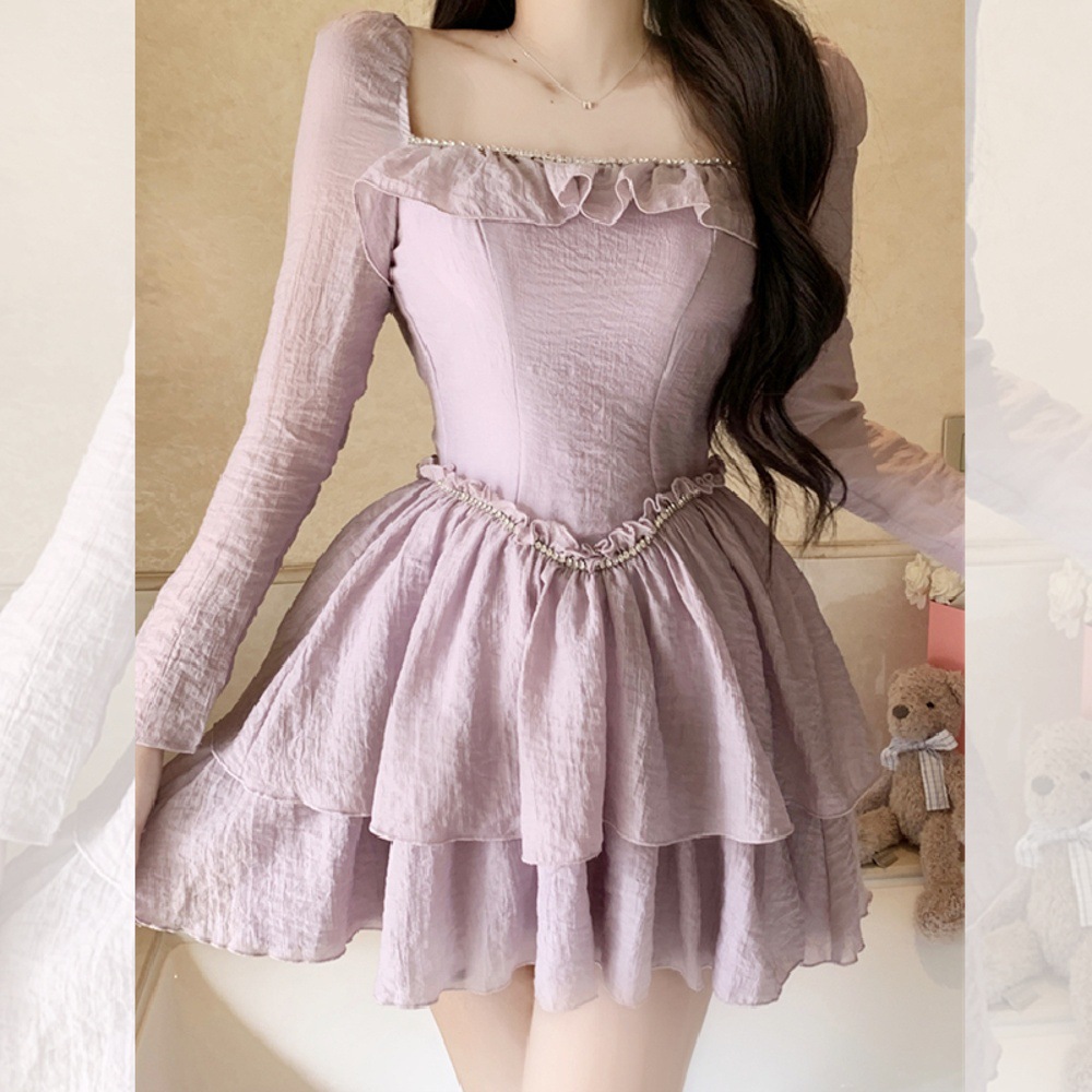 法式荷叶边长袖连衣裙女秋季高级感气质蓬蓬公主裙收腰小个子短裙스토어 가기