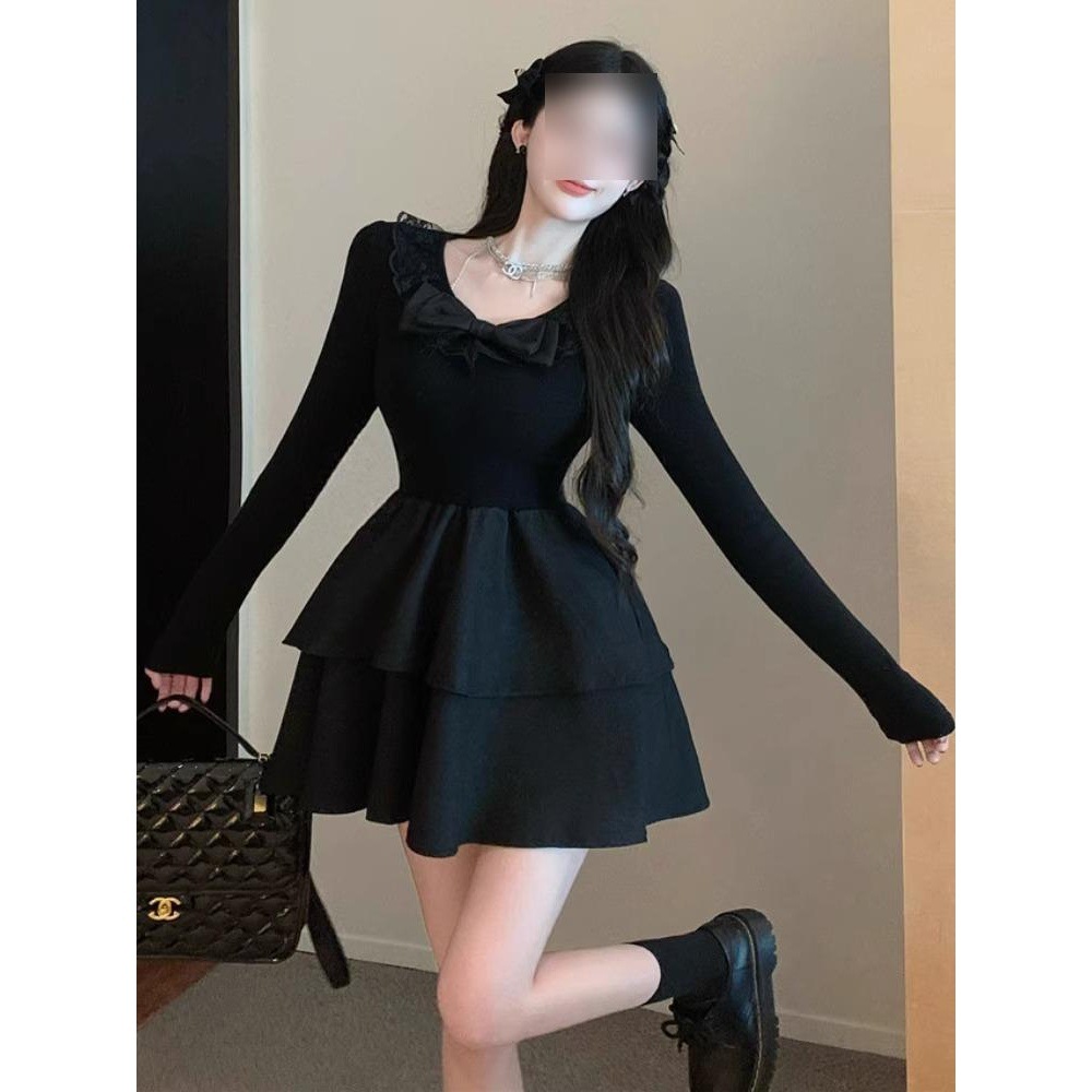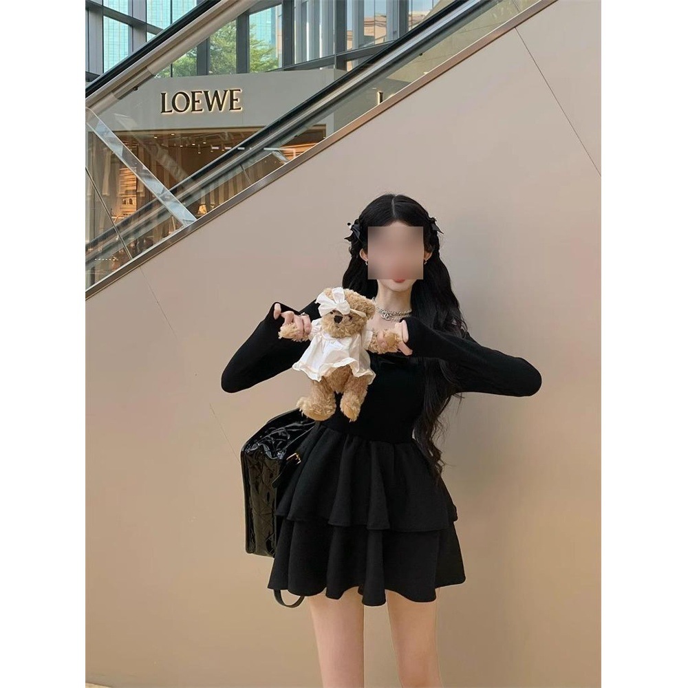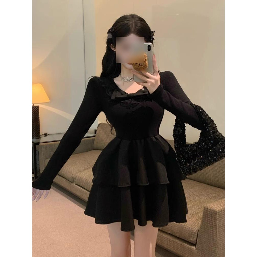 法式赫本风黑色连衣裙女秋冬新款高级感内搭打底蓬蓬短裙生日礼裙