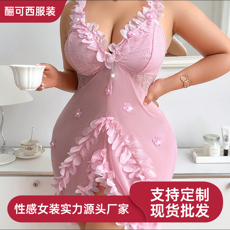 국경 간 대외 무역 새로운 스타일 v 넥 서스펜더 플러스 사이즈 드레스 섹시한 백리스 프릴 레이스 잠옷 여성용 홈웨어스토어 가기