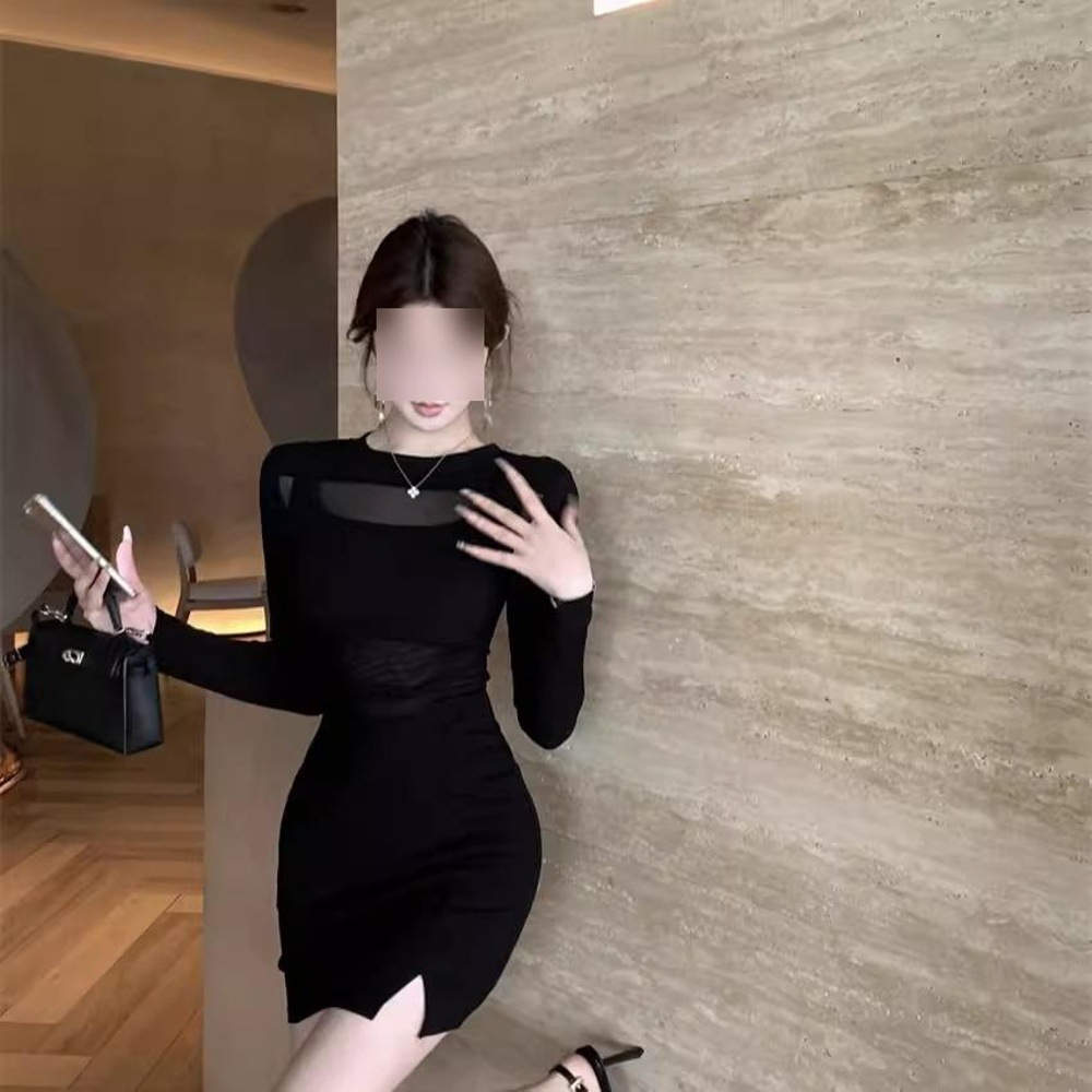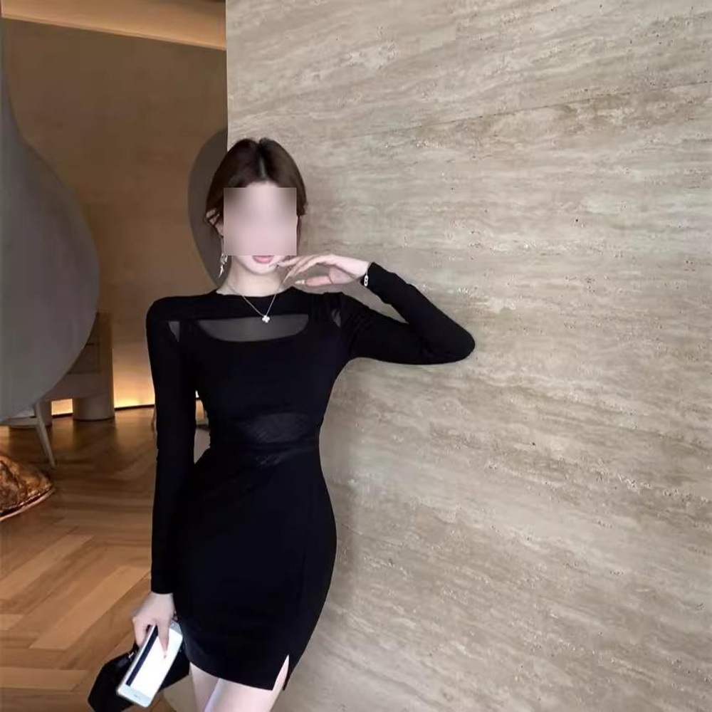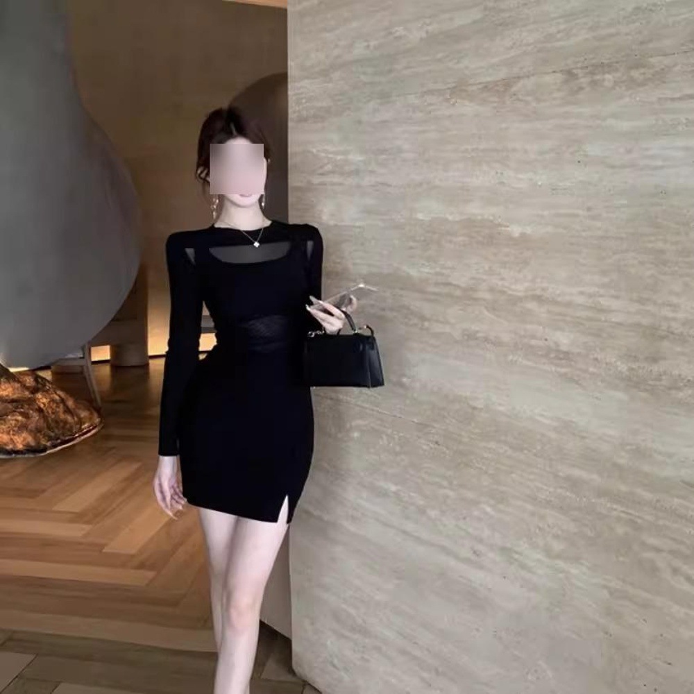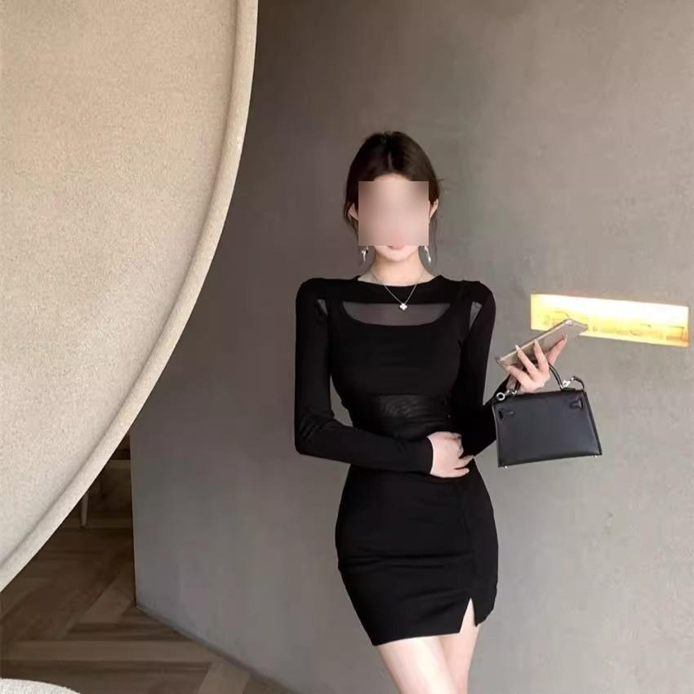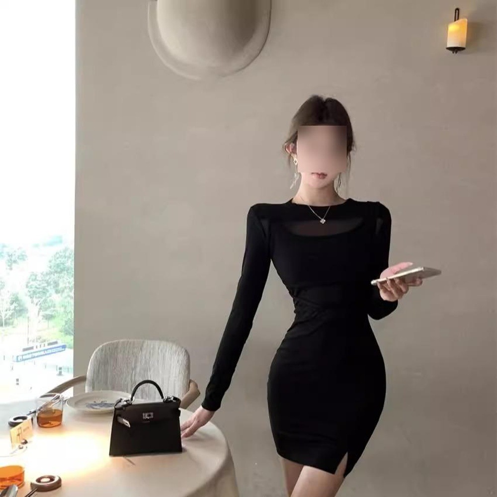 黑色拼接网纱长袖连衣裙女春季配大衣内搭紧身高级打底包臀短裙子스토어 가기