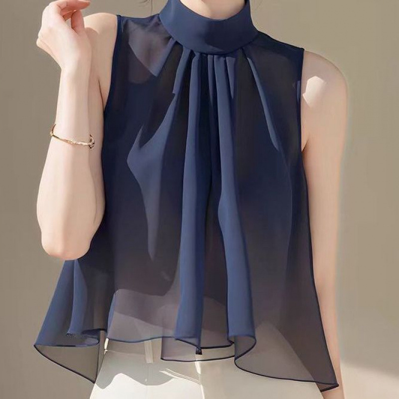 여름 여성을 위한 프렌치 민소매 홀터넥 레드 쉬폰 셔츠, 새로운 스타일, 슈퍼 요정 스타일, 배를 커버하고 슬리밍 탑스토어 가기