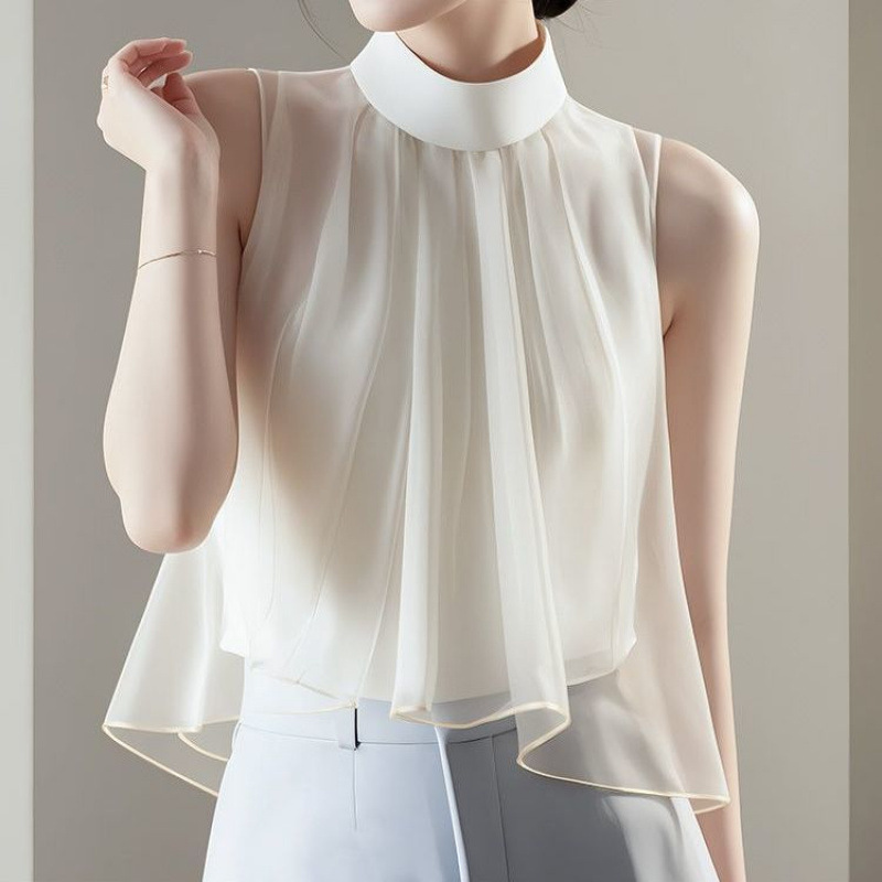 여름 여성을 위한 프렌치 민소매 홀터넥 레드 쉬폰 셔츠, 새로운 스타일, 슈퍼 요정 스타일, 배를 커버하고 슬리밍 탑