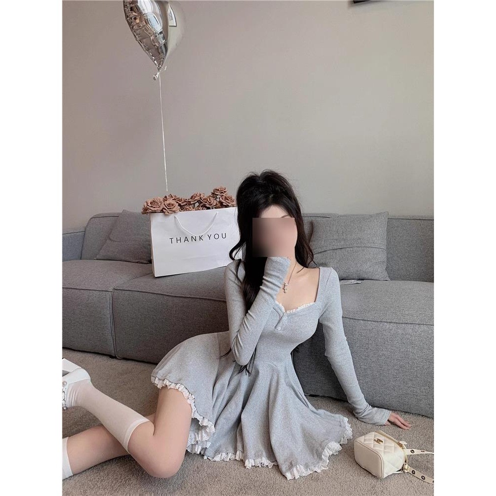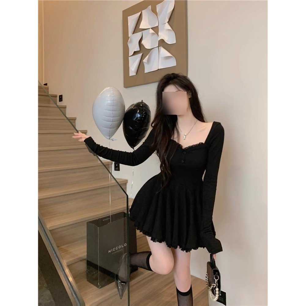 纯欲系韩版拼接蕾丝连衣裙女大裙摆长袖收腰气质辣妹百褶A字短裙스토어 가기