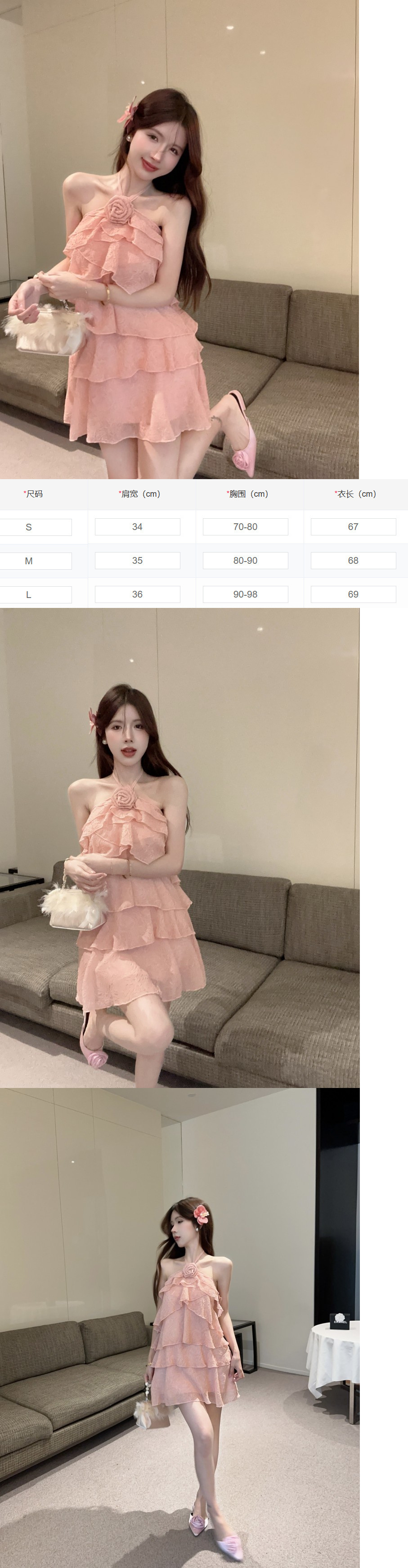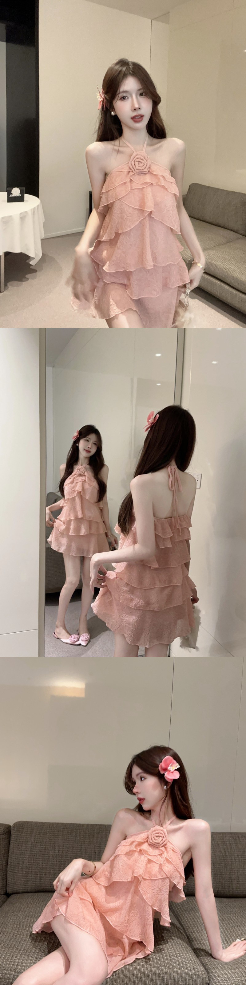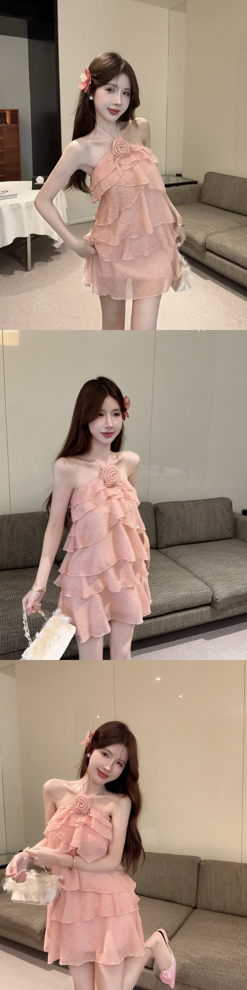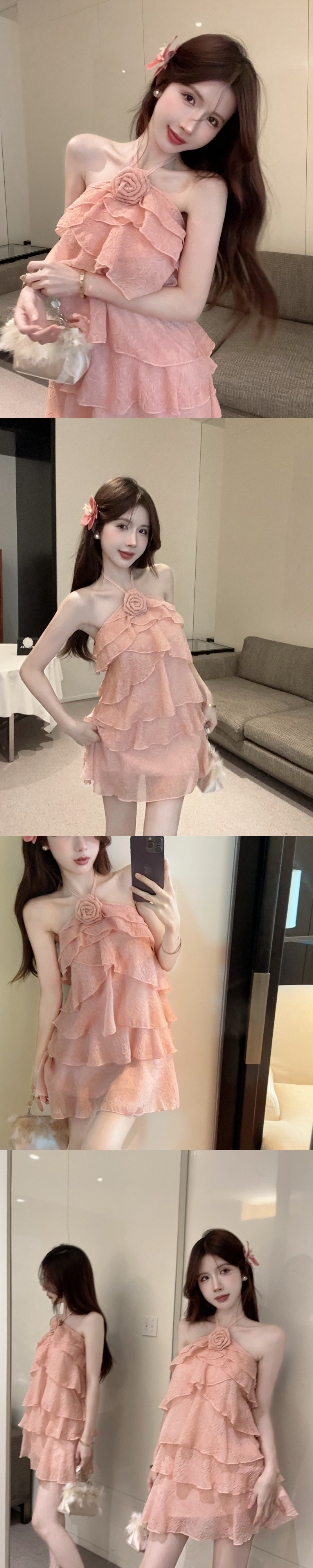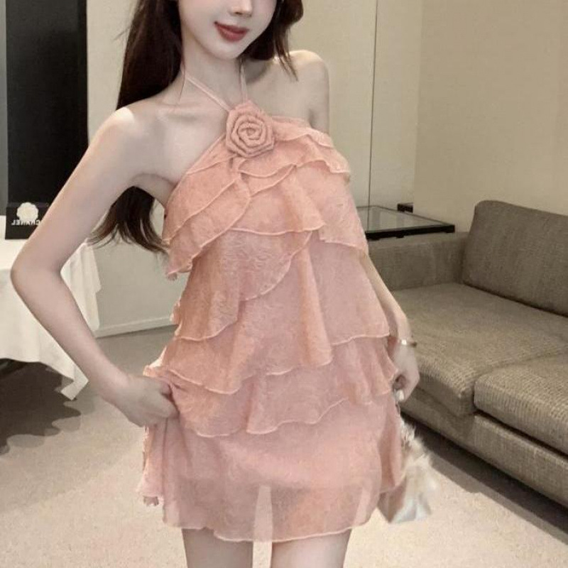 인터넷 연예인 뜨거운 소녀 달콤한 순수한 욕망 프릴 백리스 서스펜더 홀터넥 입체 꽃 다층 케이크 드레스 여성용