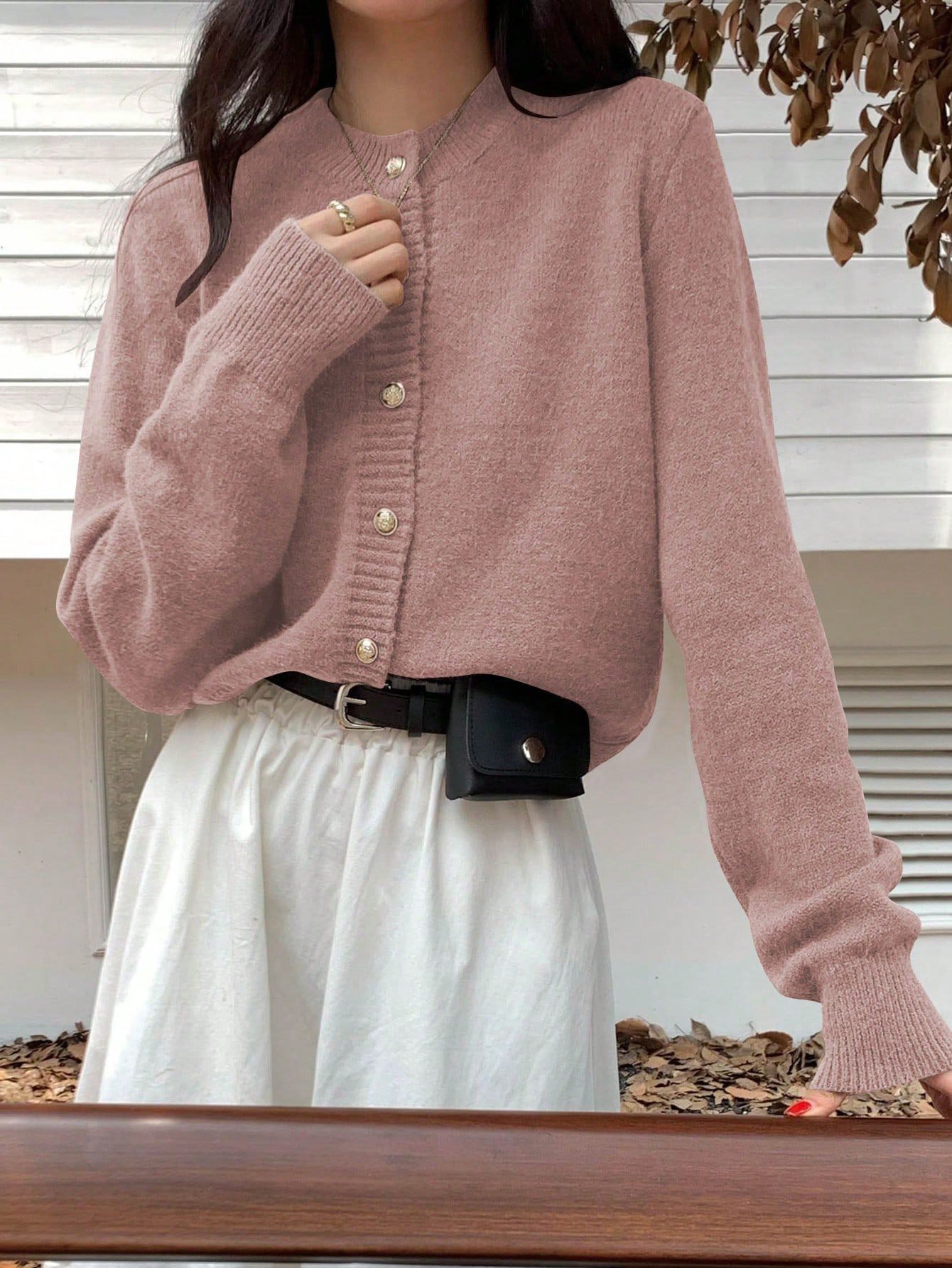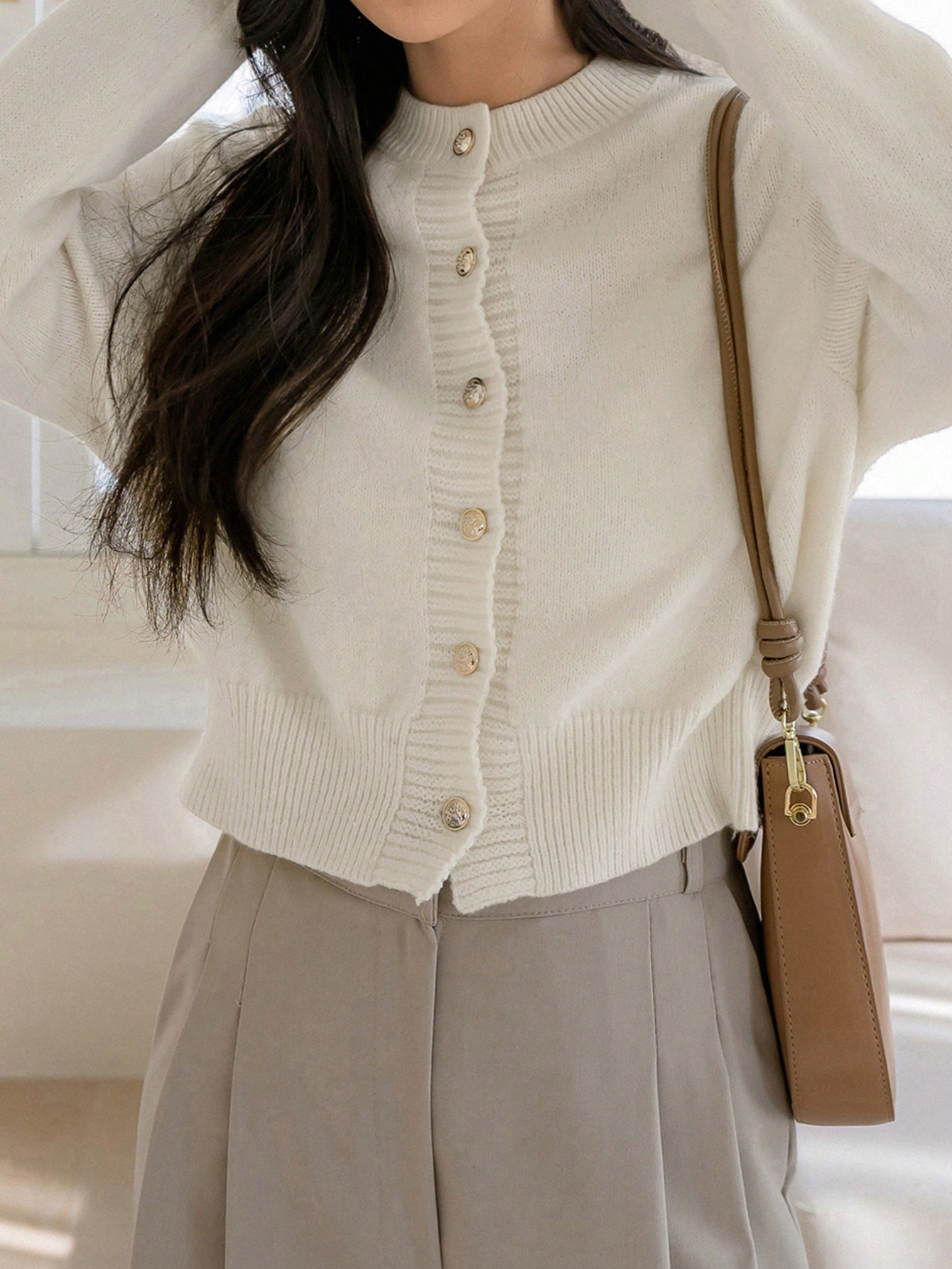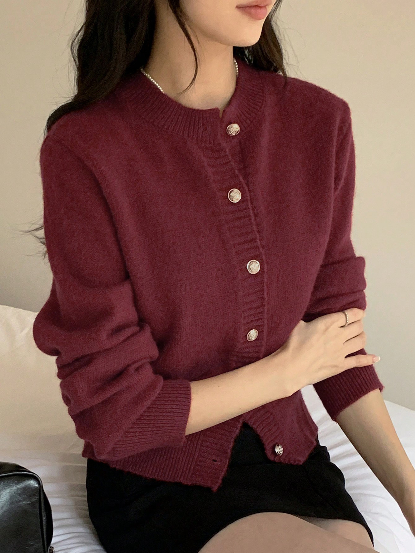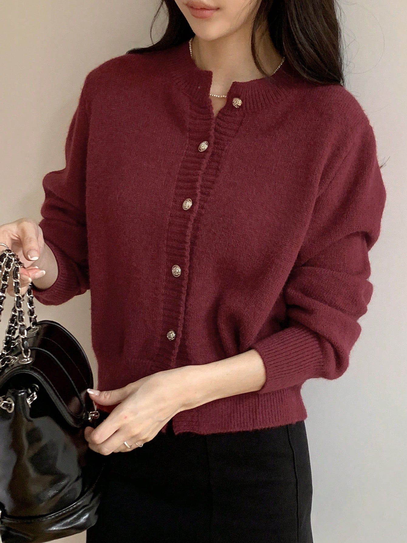 한국식 틈새 세련된 단색 카디건 금속 버클 내부 라운드 넥 따뜻한 니트웨어 스웨터 작은 코트 여성