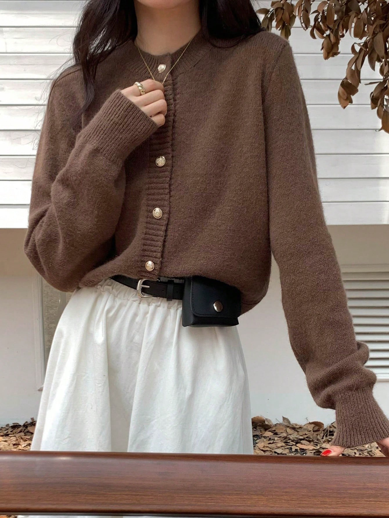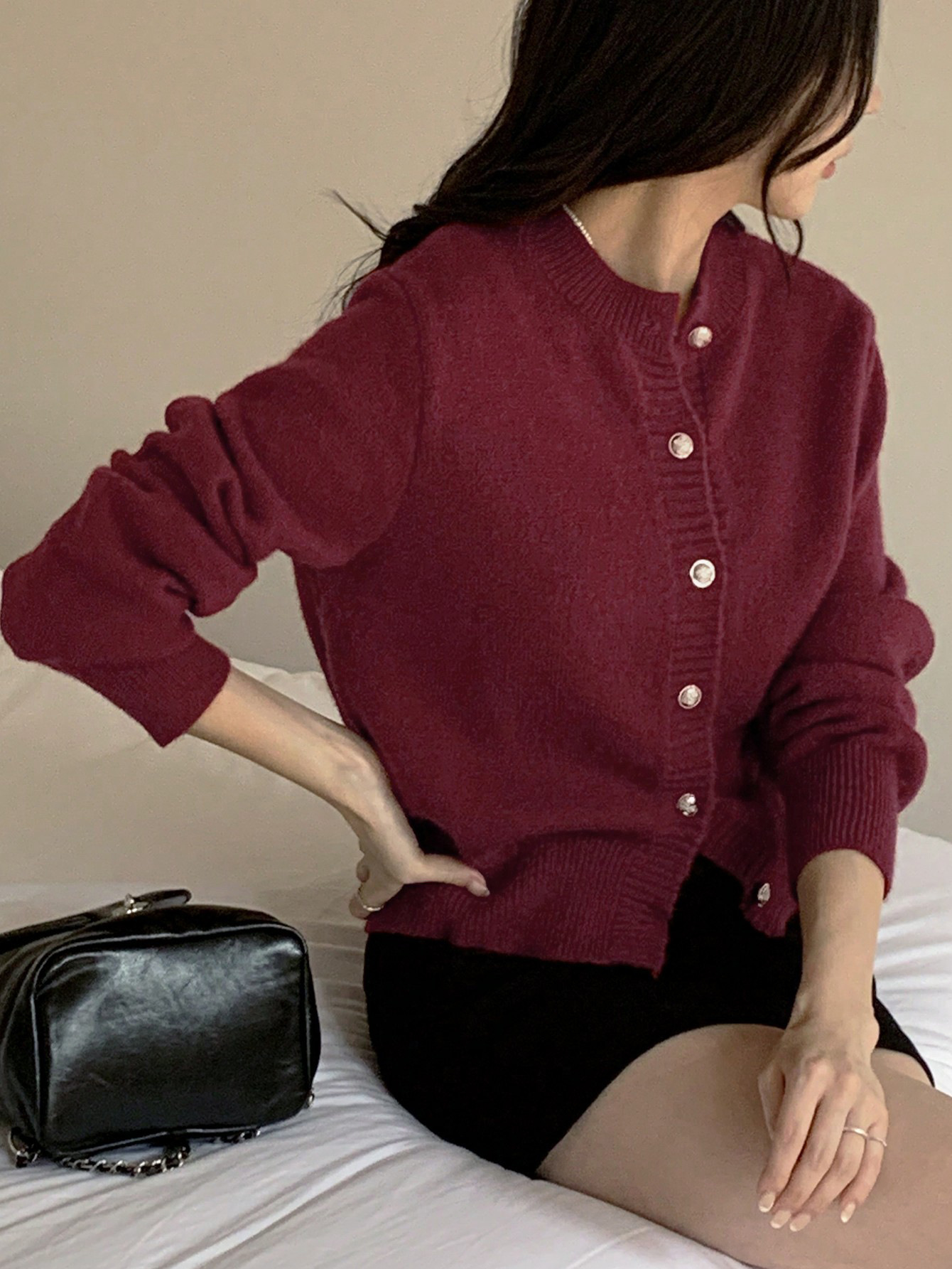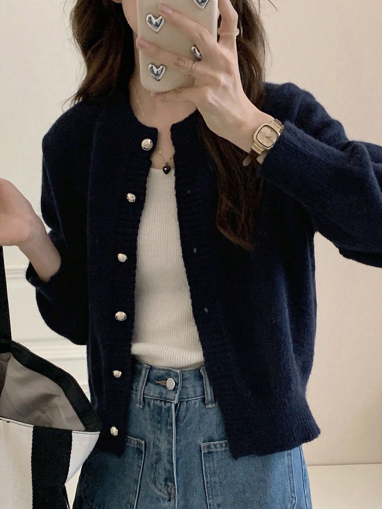 한국식 틈새 세련된 단색 카디건 금속 버클 내부 라운드 넥 따뜻한 니트웨어 스웨터 작은 코트 여성
