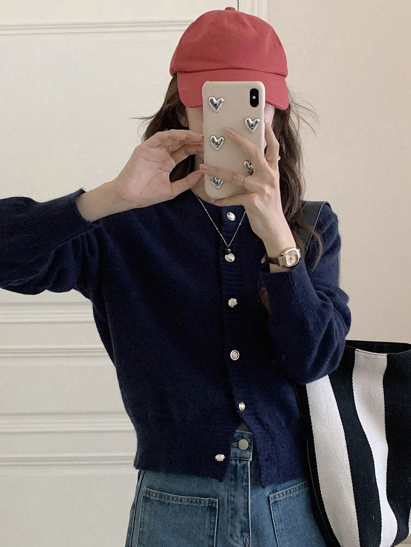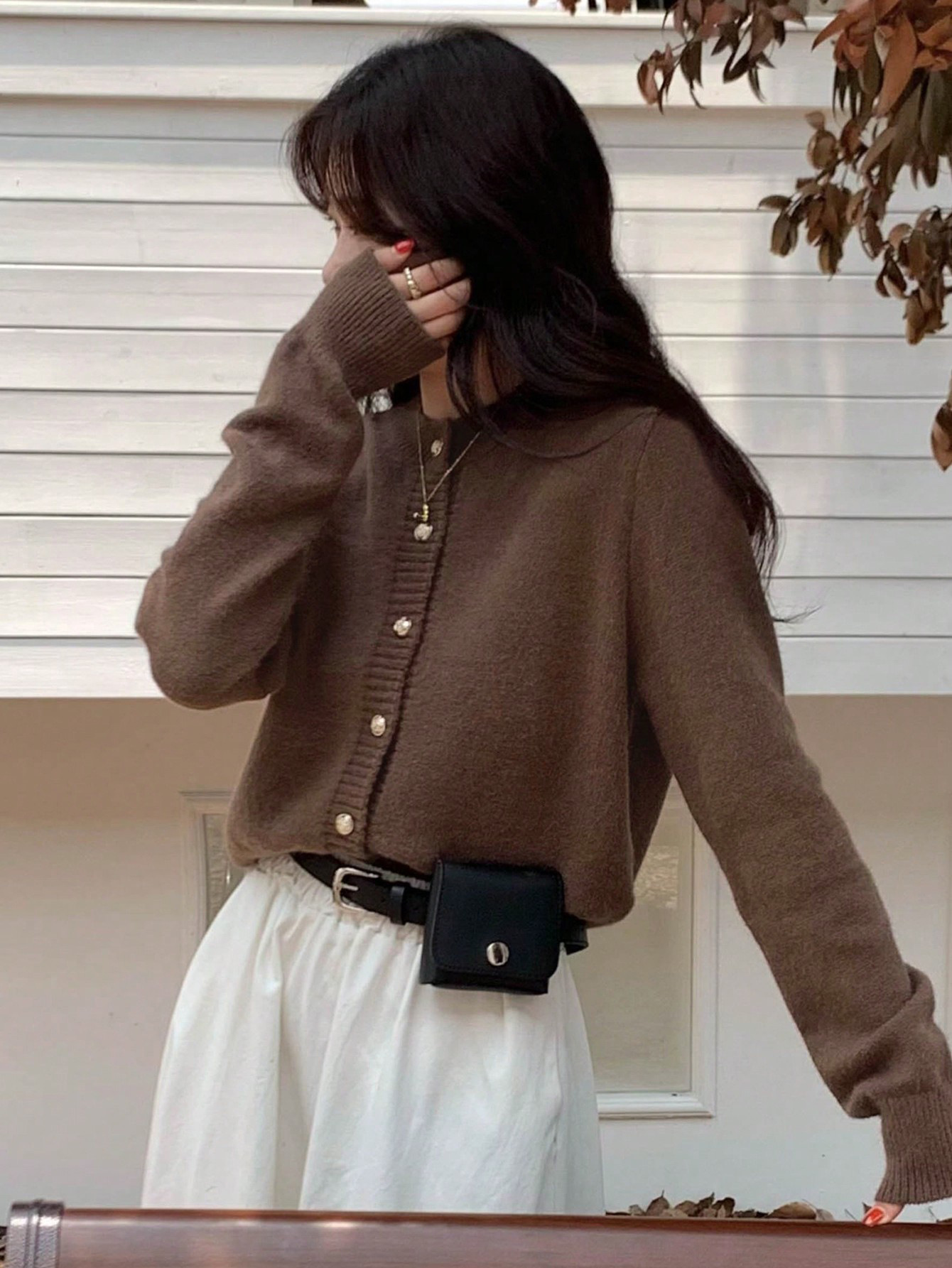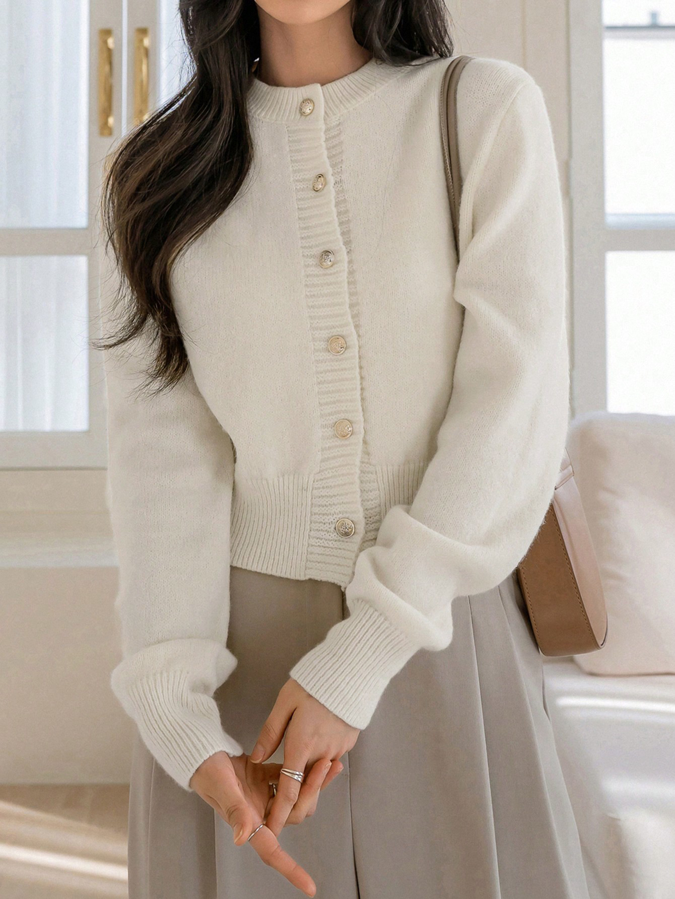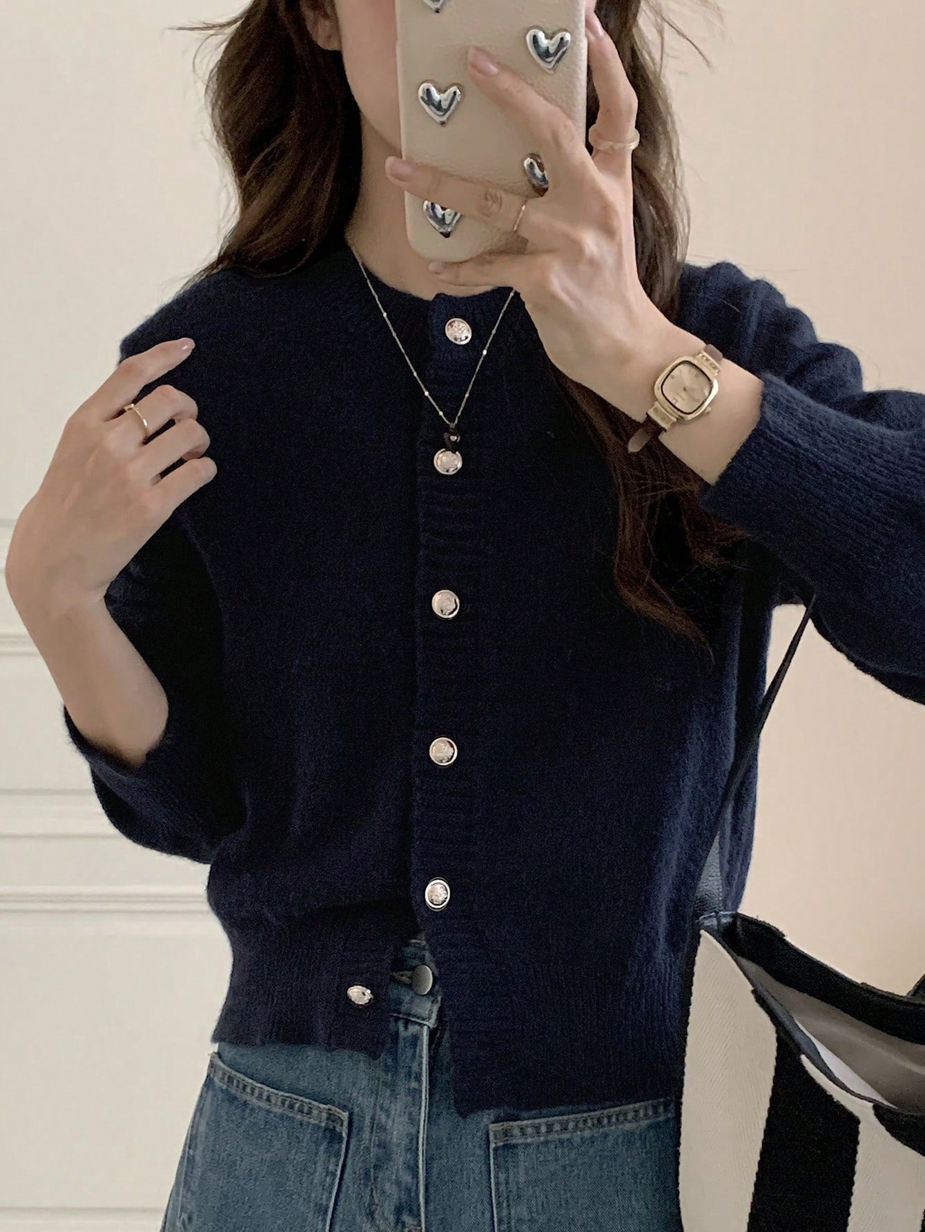 한국식 틈새 세련된 단색 카디건 금속 버클 내부 라운드 넥 따뜻한 니트웨어 스웨터 작은 코트 여성