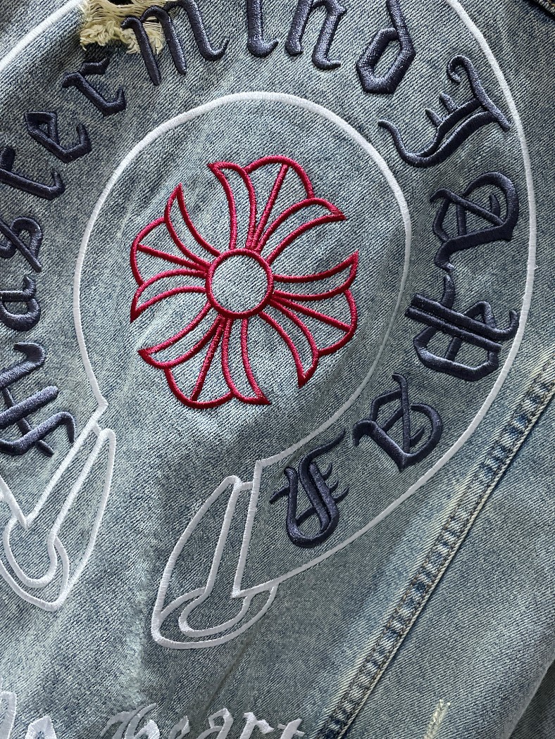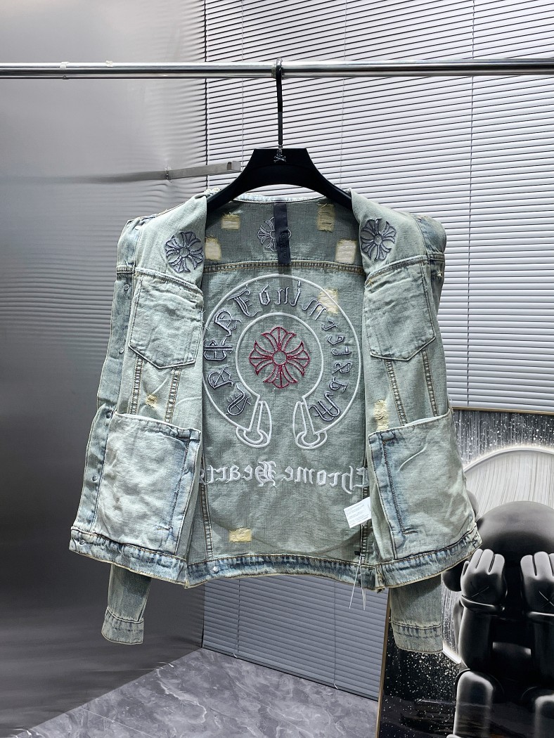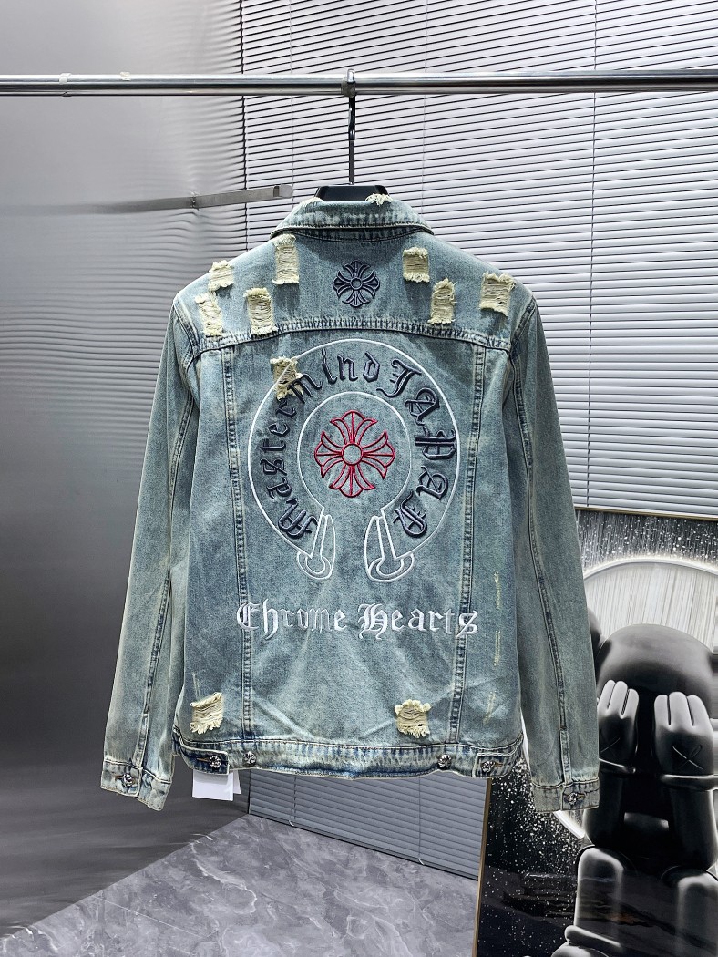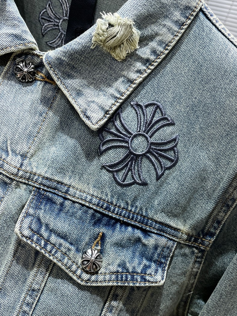 ChromeHearts 크로우의 새로운 자수 로고 찢어진 복고풍 남성용 카디건 데님 재킷의 올바른 버전
