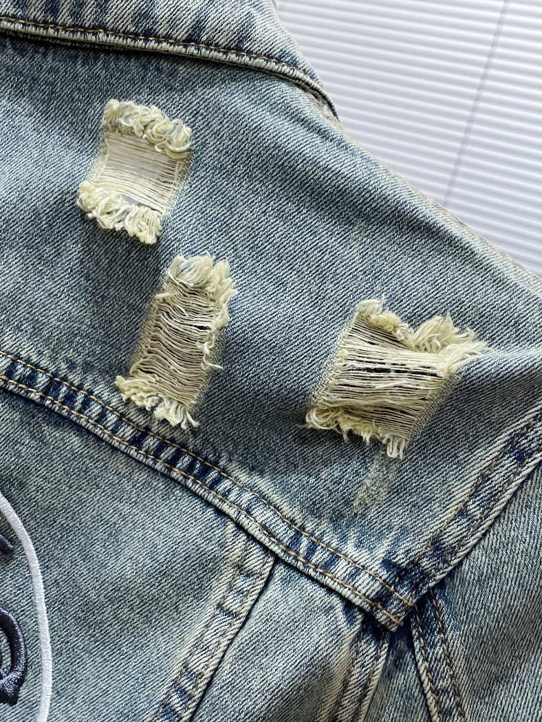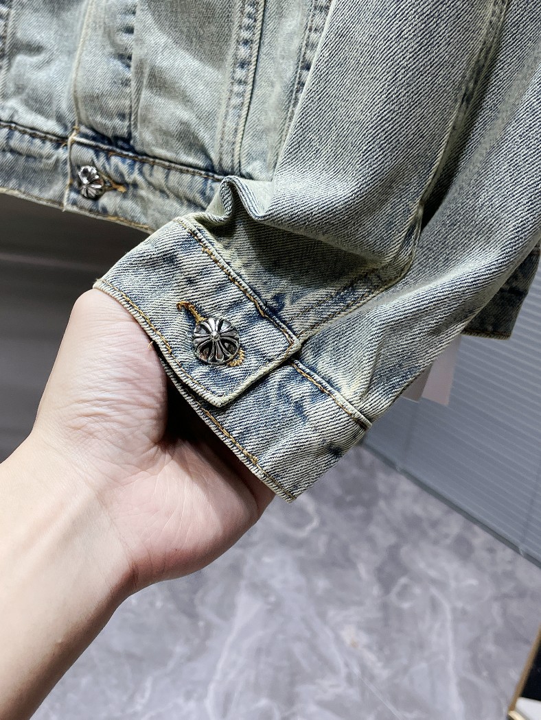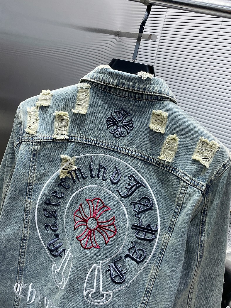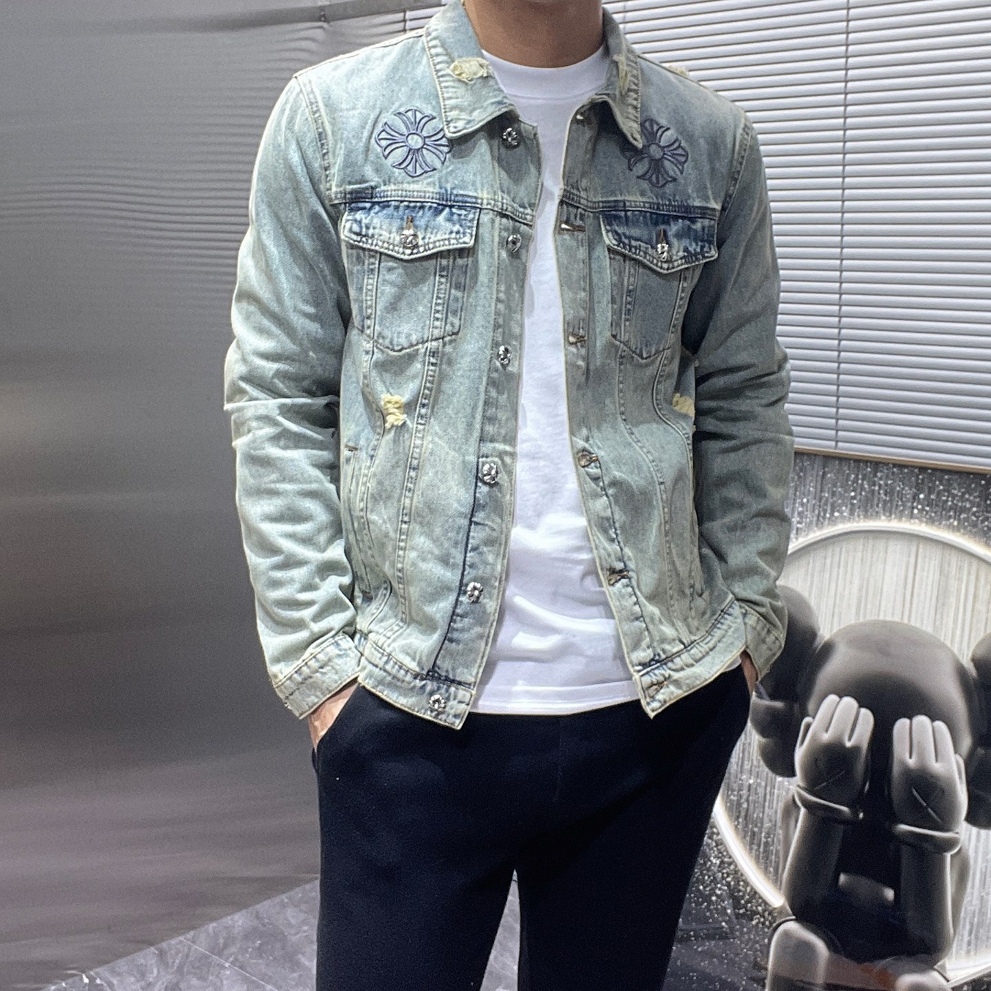ChromeHearts 크로우의 새로운 자수 로고 찢어진 복고풍 남성용 카디건 데님 재킷의 올바른 버전