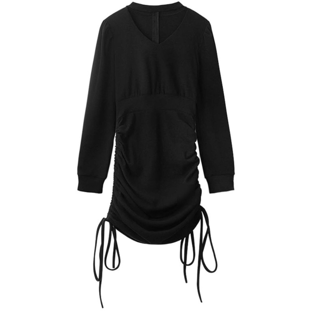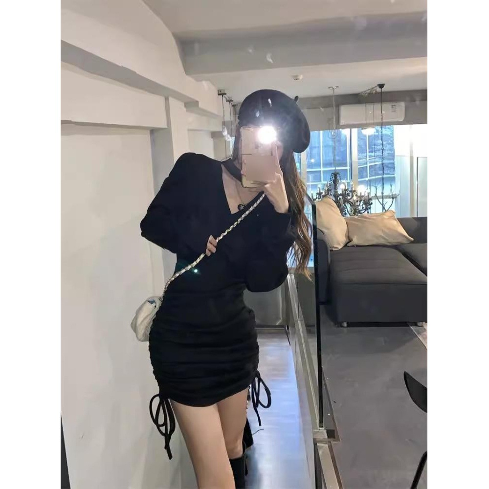 봄 여성용 순수한 욕망 기질 브이넥 홀터넥 니트 드레스, 베이스 레이어드 드로스트링, 슬림핏 허리라인, 힙 커버 스커트스토어 가기