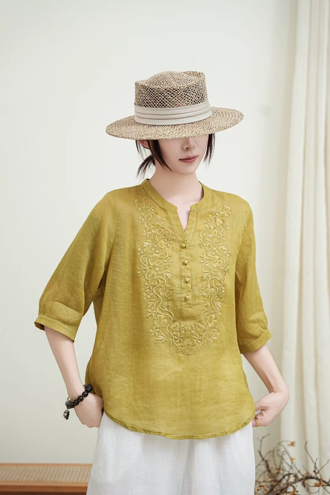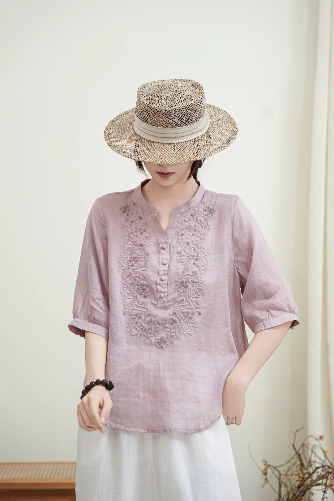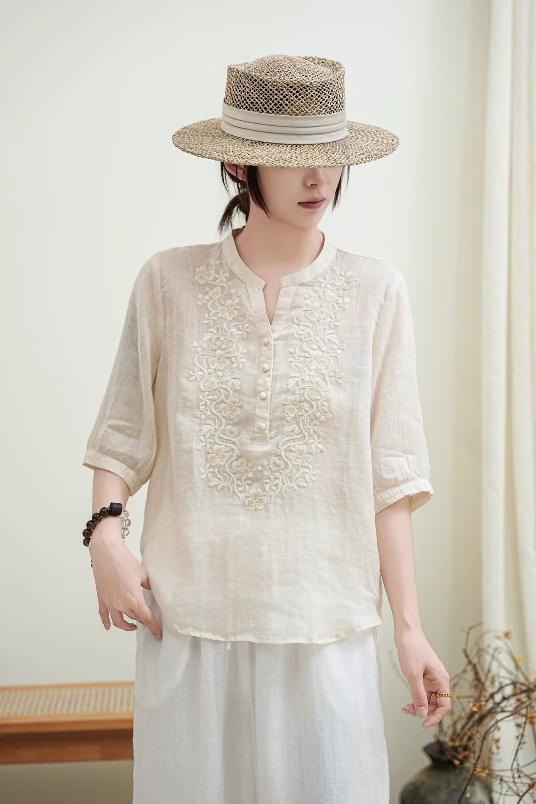 2025 여름 루즈한 예술적 복고풍 셔츠 자수 7부 소매 탑 작은 V 넥 버튼 하프 가디건 셔츠