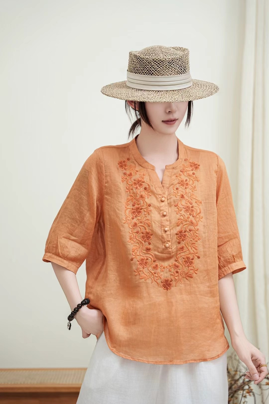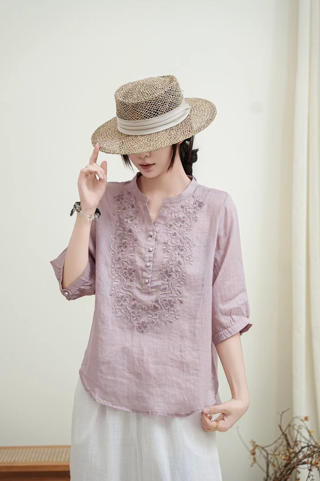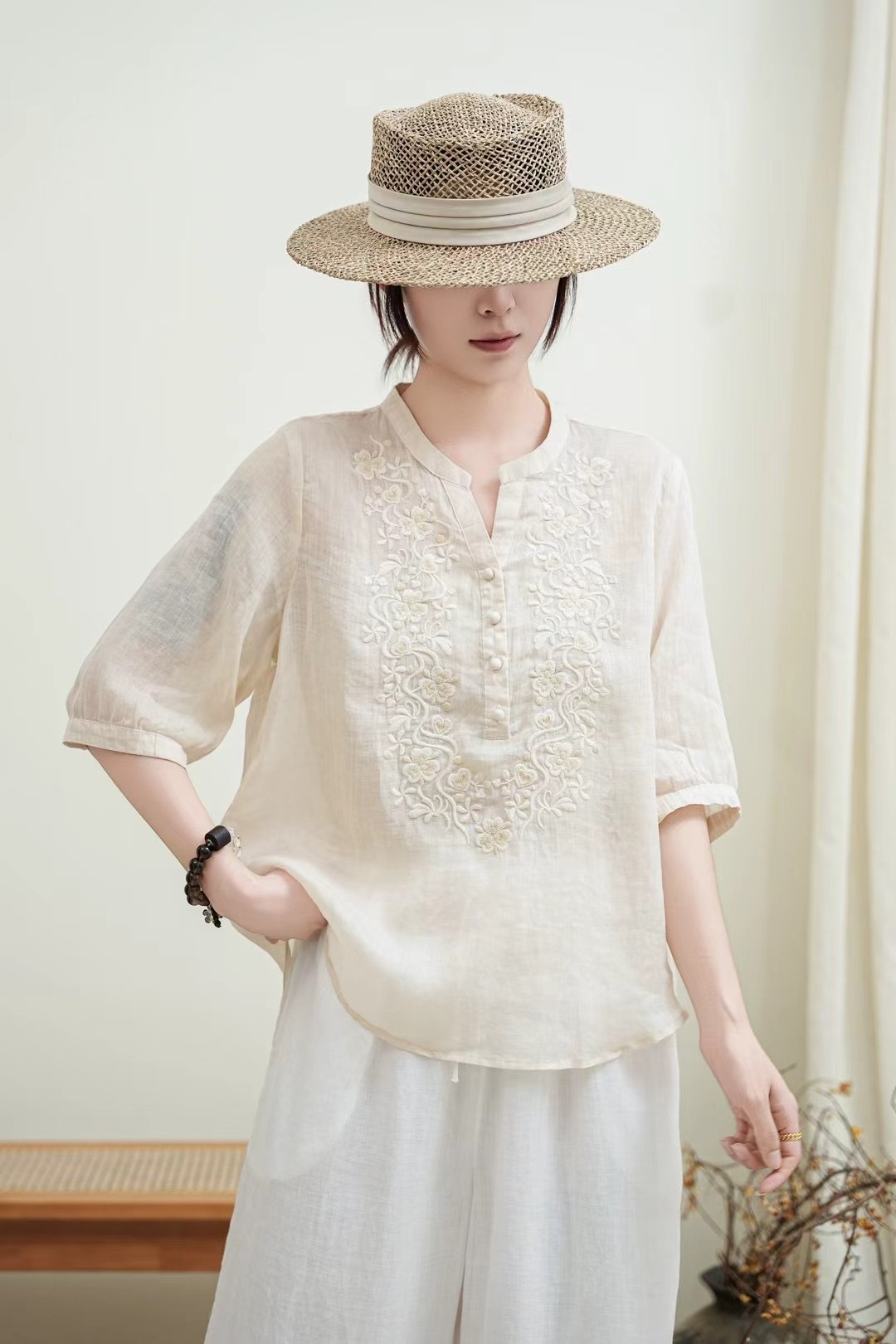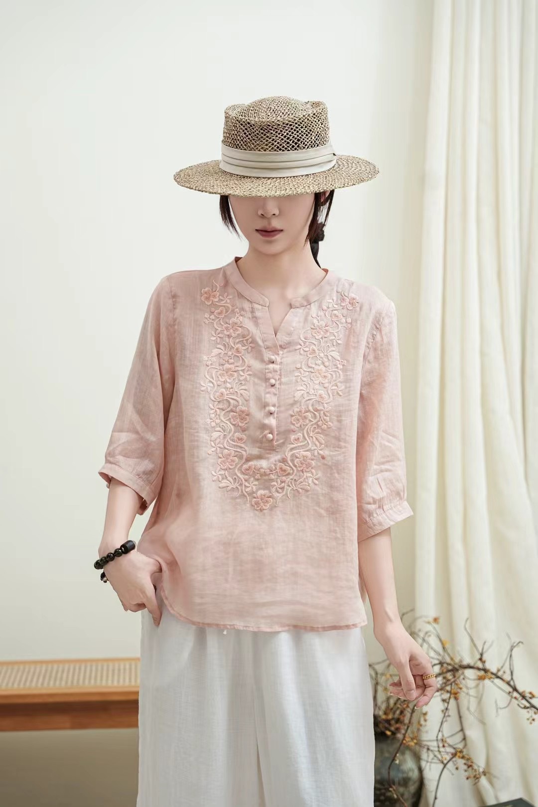 2025 여름 루즈한 예술적 복고풍 셔츠 자수 7부 소매 탑 작은 V 넥 버튼 하프 가디건 셔츠