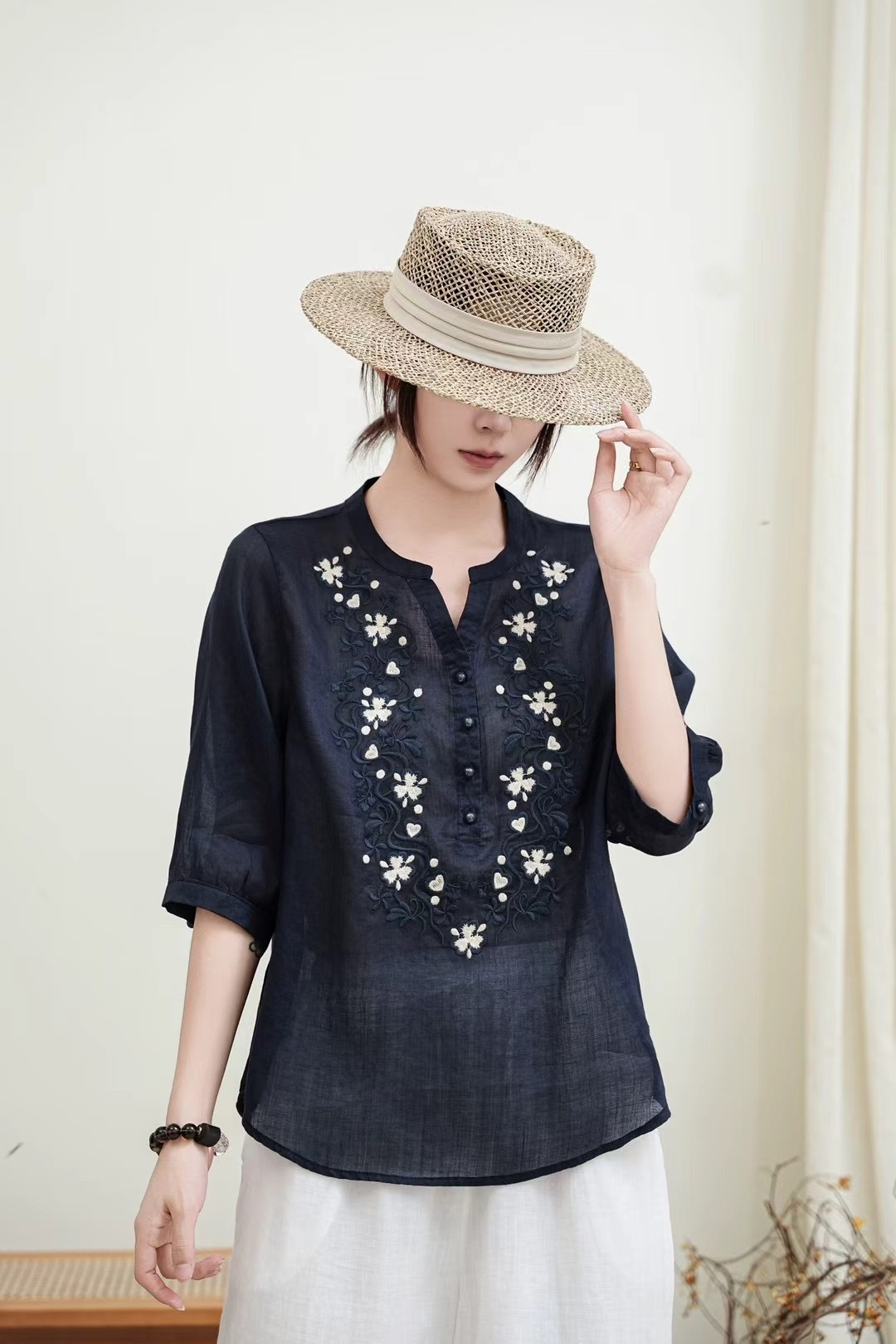 2025 여름 루즈한 예술적 복고풍 셔츠 자수 7부 소매 탑 작은 V 넥 버튼 하프 가디건 셔츠스토어 가기