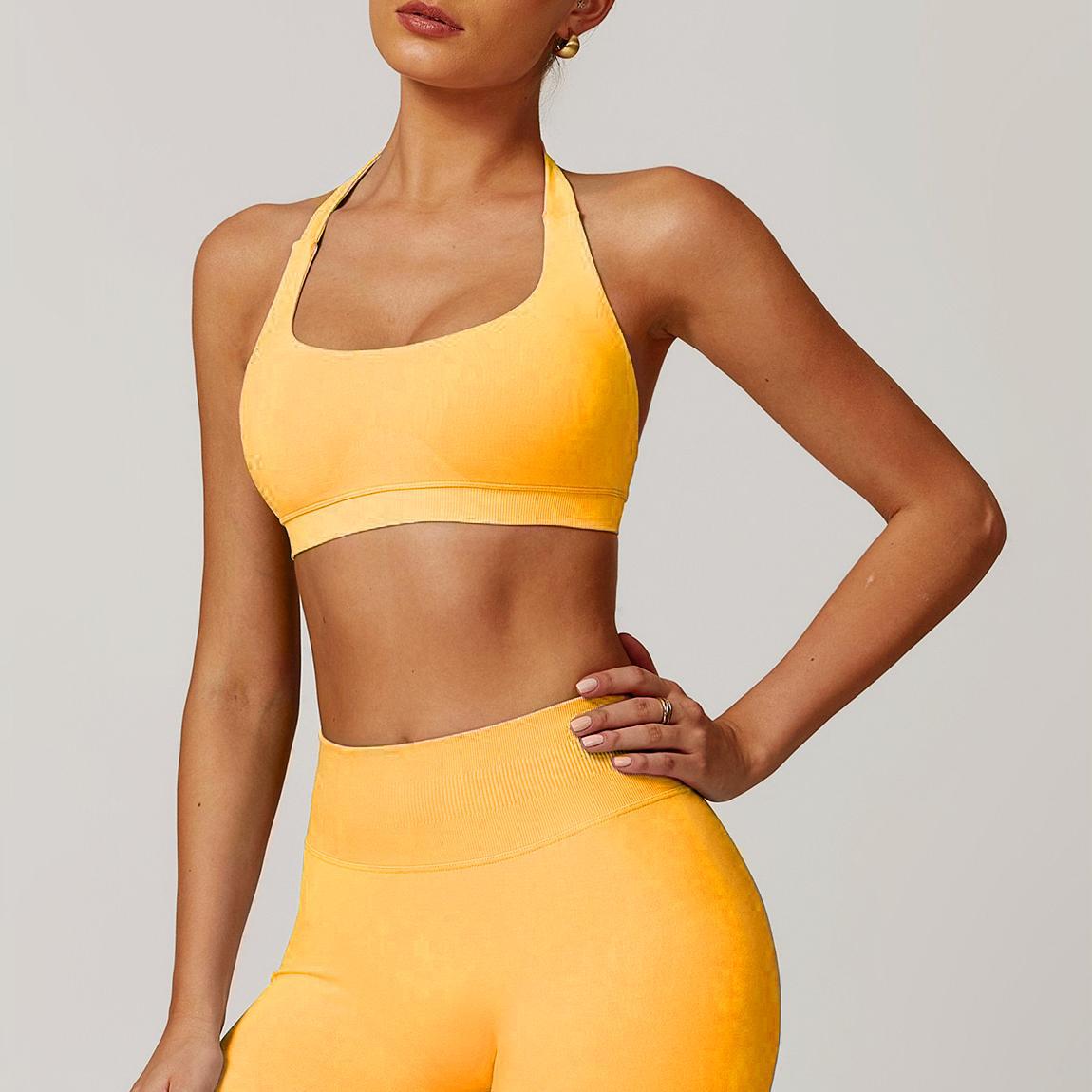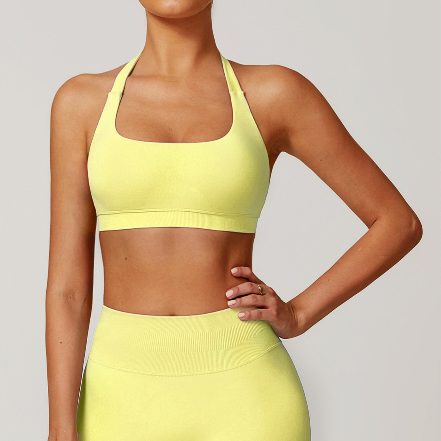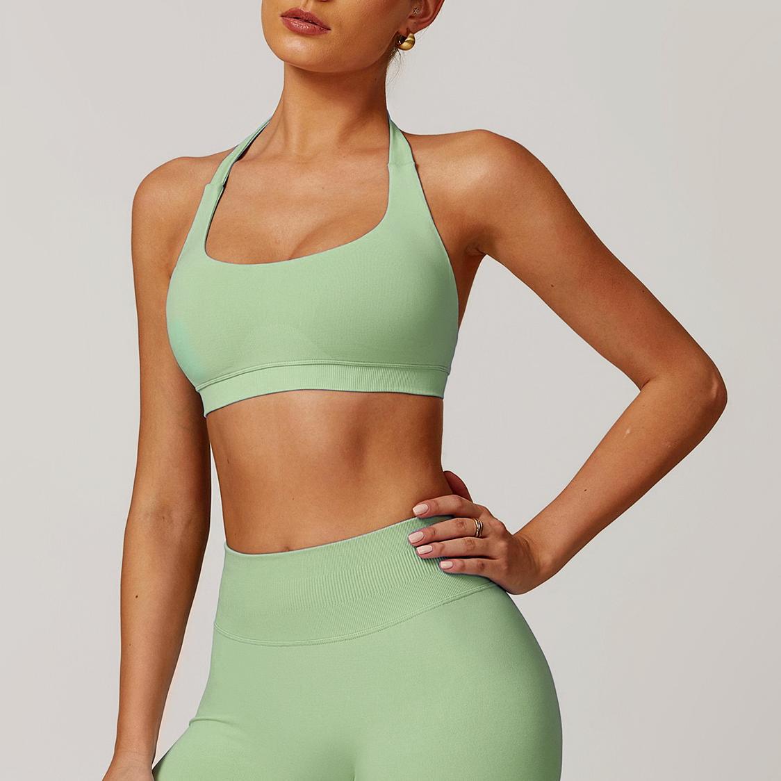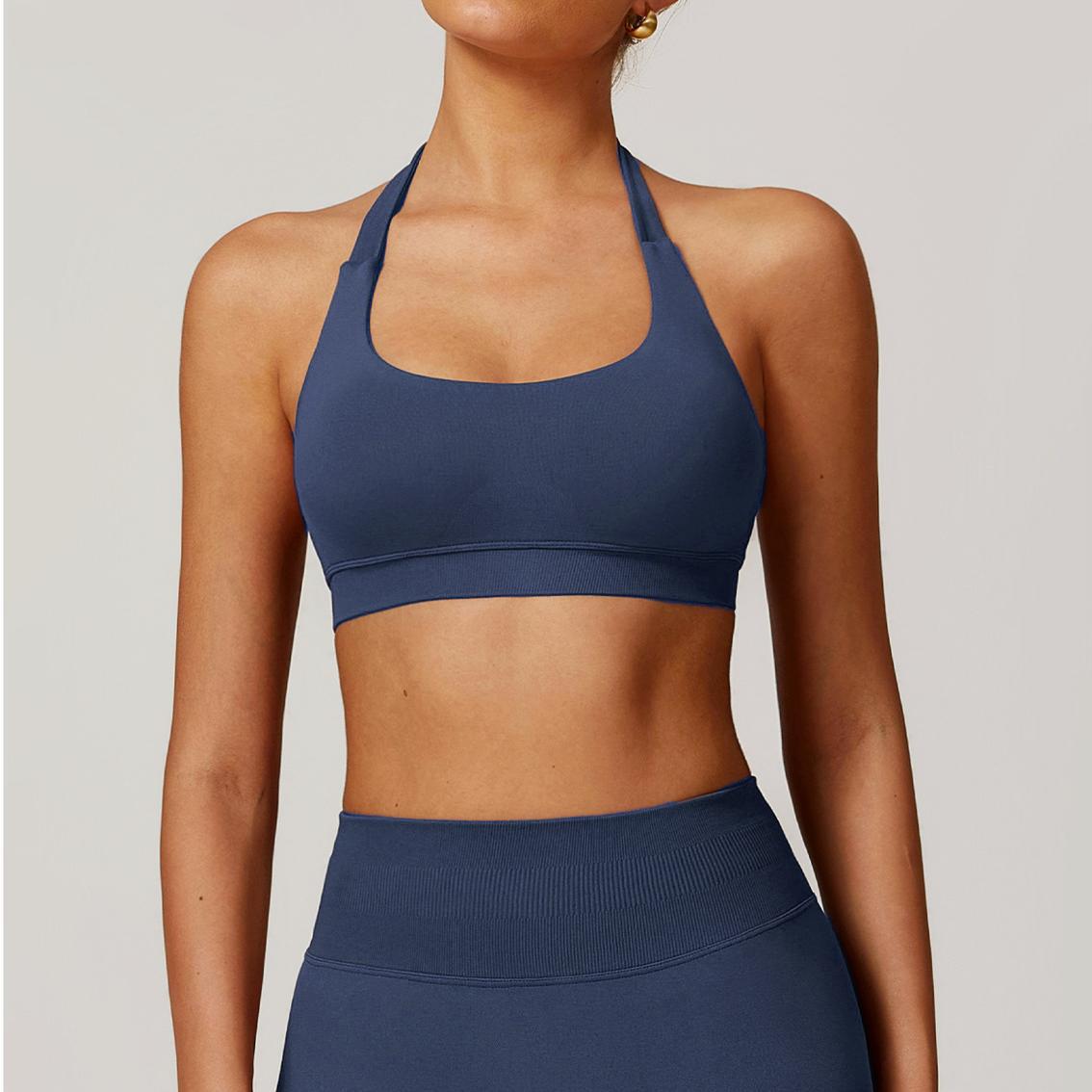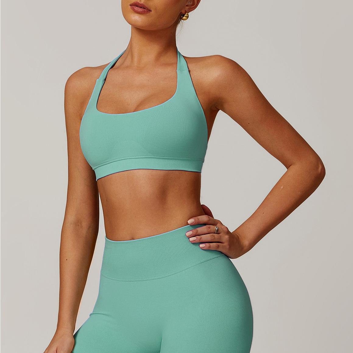 홀터넥 스포츠 브라, 고탄성, 초미세 무광택, 심리스 요가, 아름다운 등, 여름 충격 방지 피트니스 올인원 스포츠 브라
