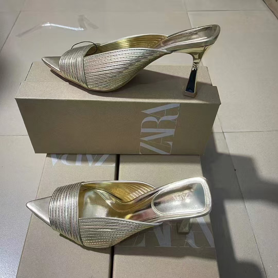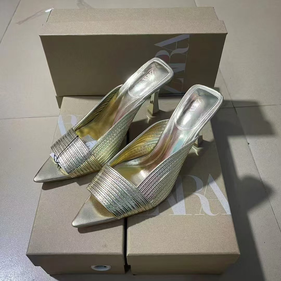 ZA2025 여성을위한 새로운 여름 황금 물고기 입 하이힐 여성 패션 다목적 뾰족한 발가락 복고풍 뒤로 빈 여성용 신발