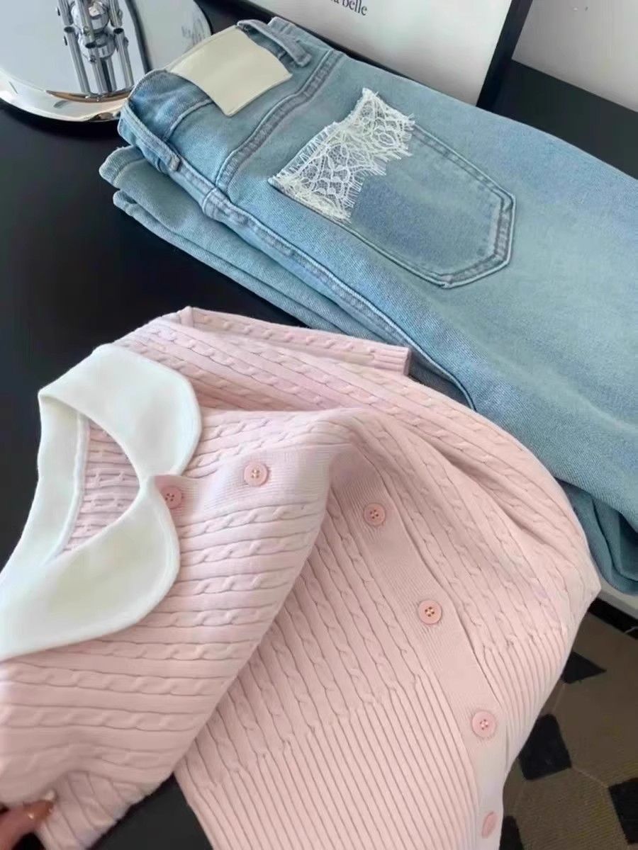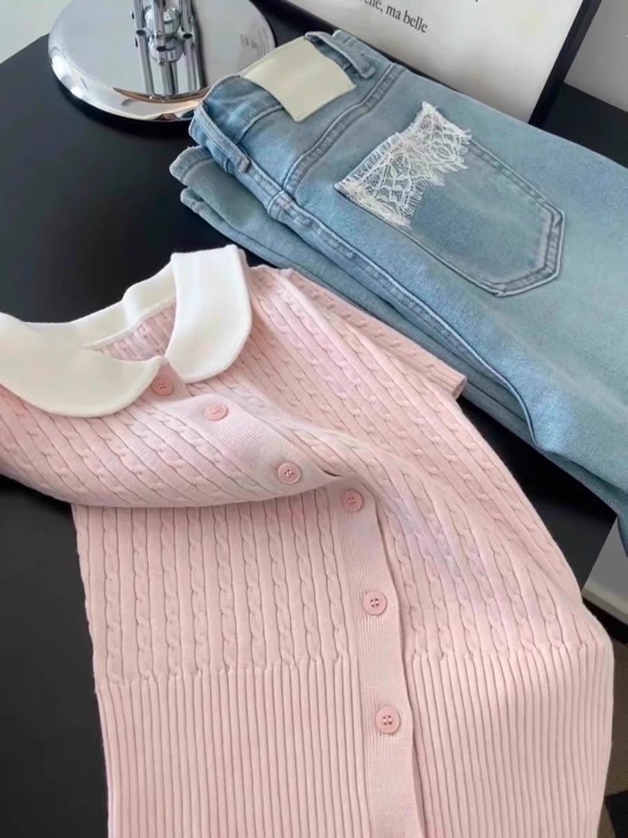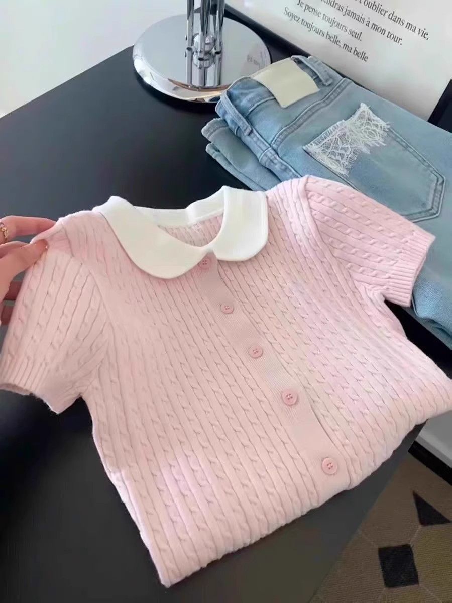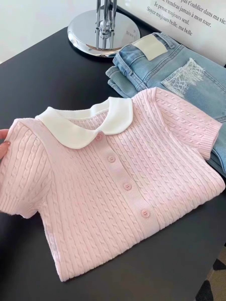 프렌치 달콤하고 부드러운 스타일 핑크 인형 칼라 니트 반팔 여성 여름 2025 새로운 슬림핏 탑스토어 가기