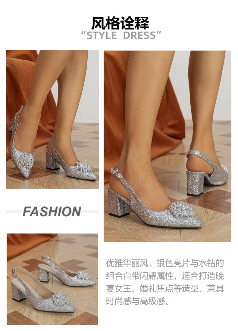 공장 도매 국경 간 유럽과 미국 여성의 글리터 진주 꽃 머리 뾰족한 두꺼운 굽 샌들 가을 신발 실버 하이힐