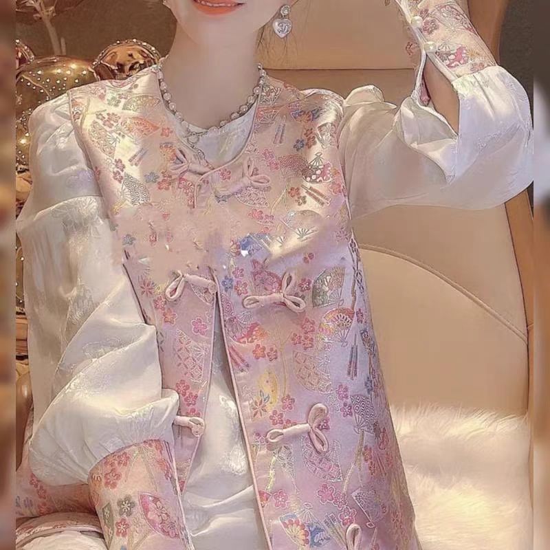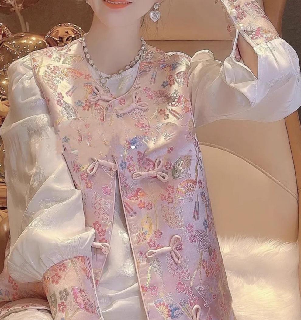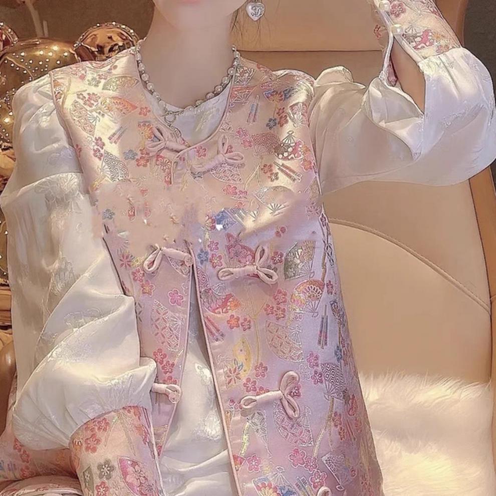 여성을위한 새로운 중국 스타일 중국 스타일 스플 라이스 자수 버튼 셔츠 2025 봄 새로운 당나라 양복 조끼 셔츠 투피스 세트