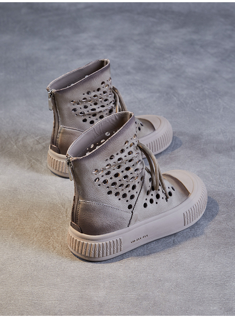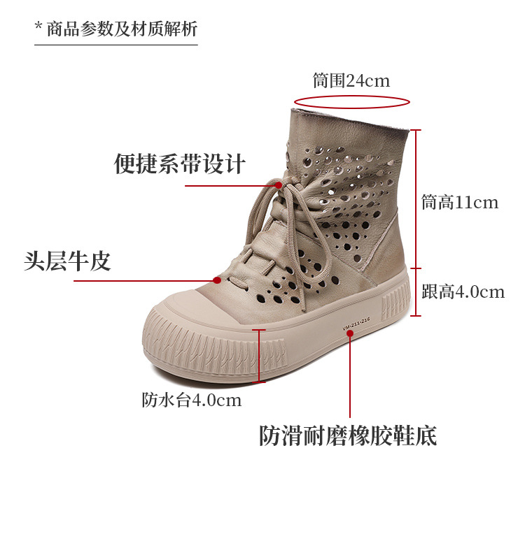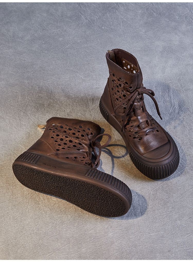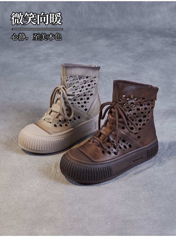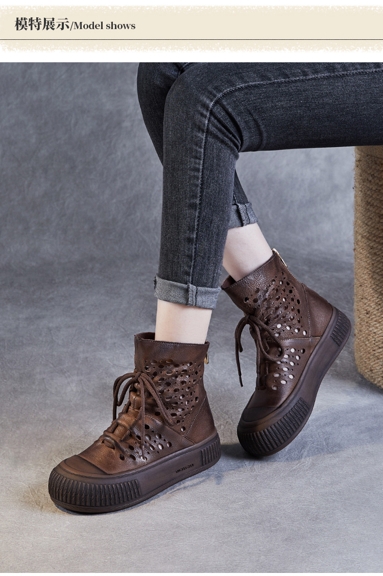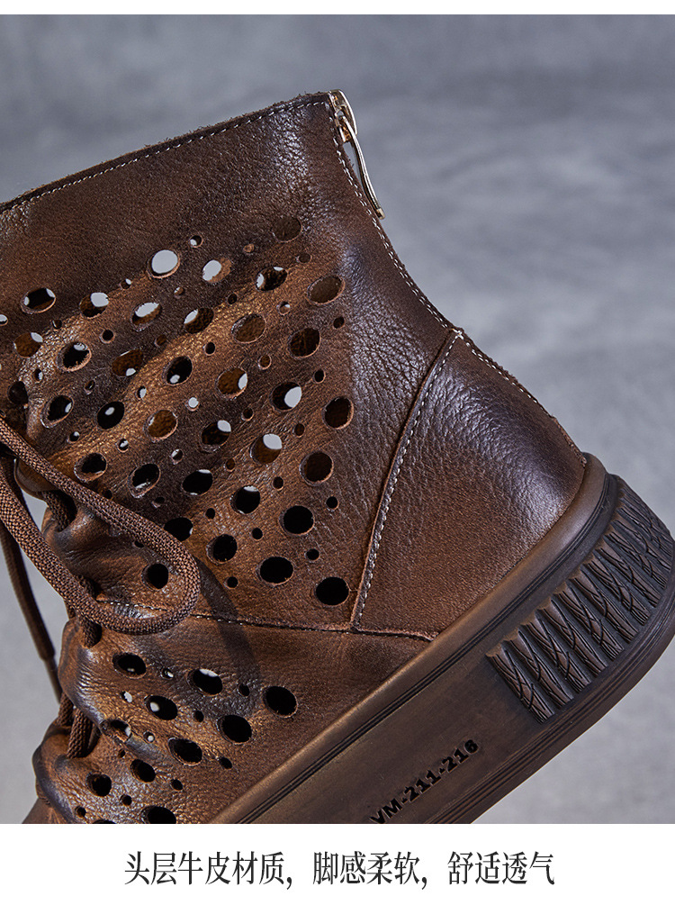 하이 퀄리티 탑 레이어 소 가죽 홀드 샌들 여성 2025 년 여름 통기성 중공 레이스 업 캐주얼 복고풍 두꺼운 밑창 샌들