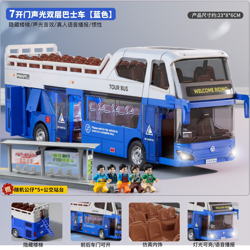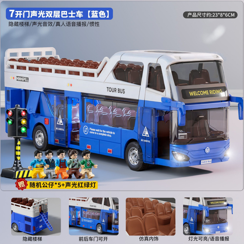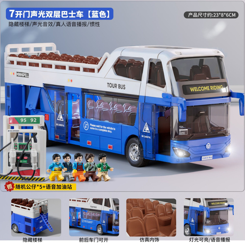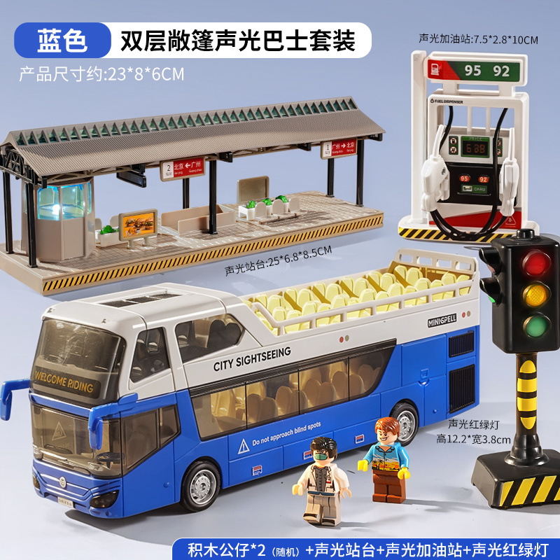 • 소리와 빛의 이층버스 - 사파이어 블루 - [업그레이드된 플랫폼 + 피규어 2개 + 신호등 + 주유소] 대형 세트