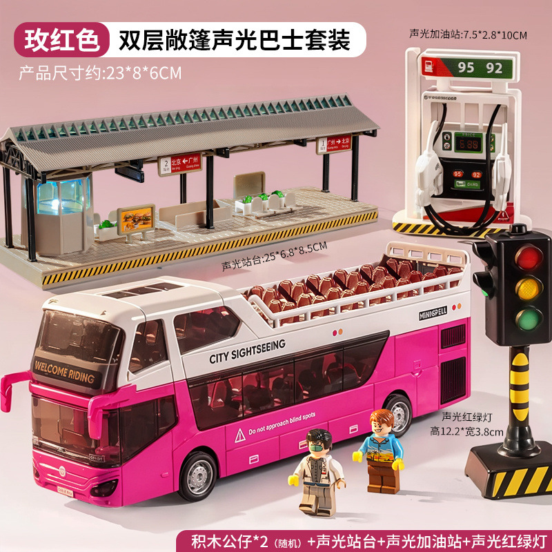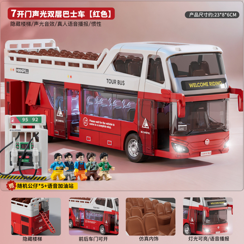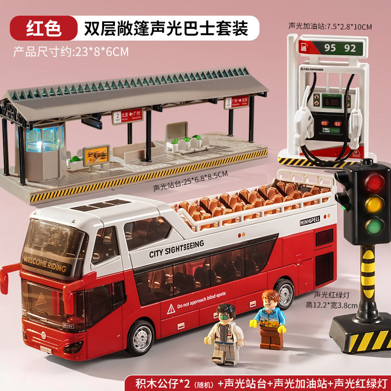 • 소리와 빛의 이층버스 - 밝은 빨간색 - [업그레이드된 플랫폼 + 피규어 2개 + 신호등 + 주유소] 대형 세트
