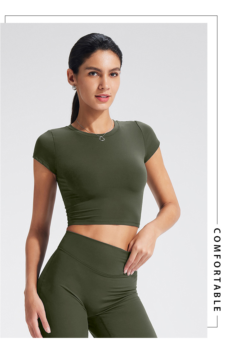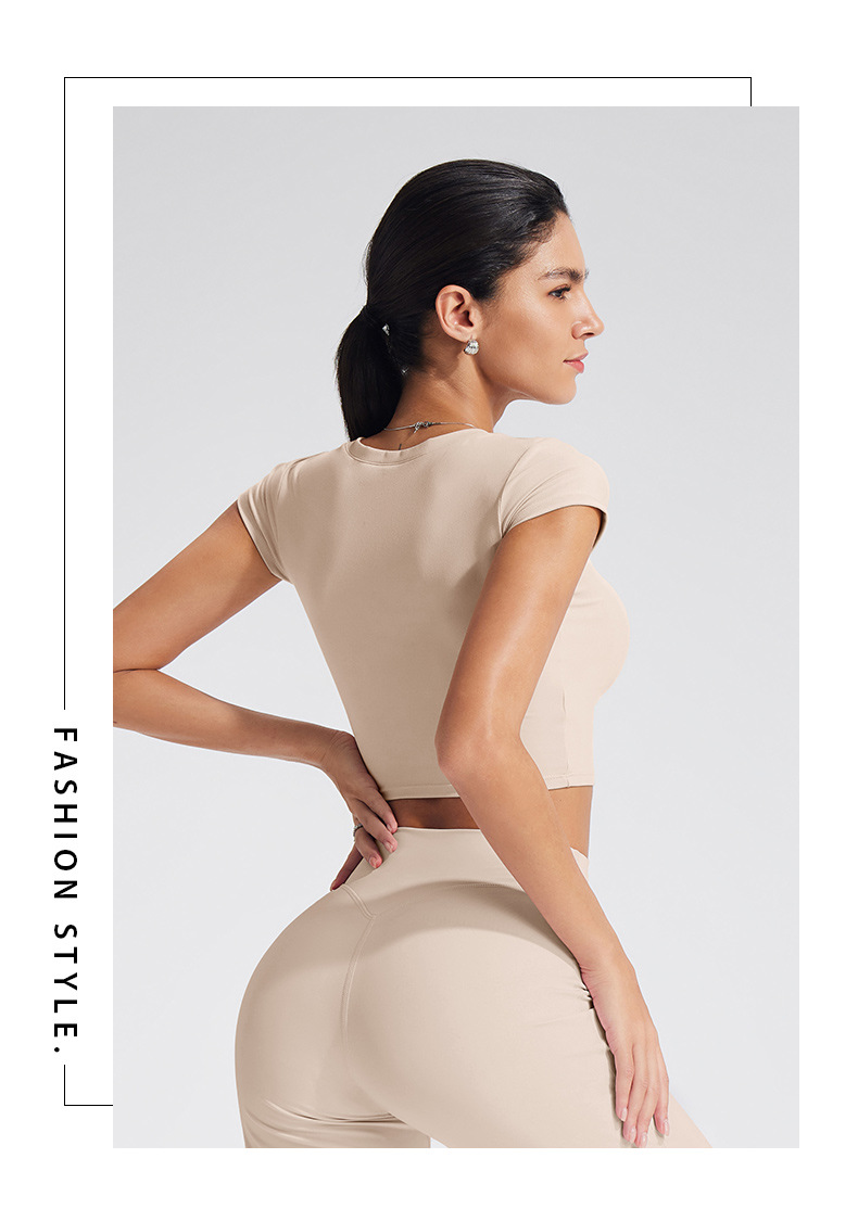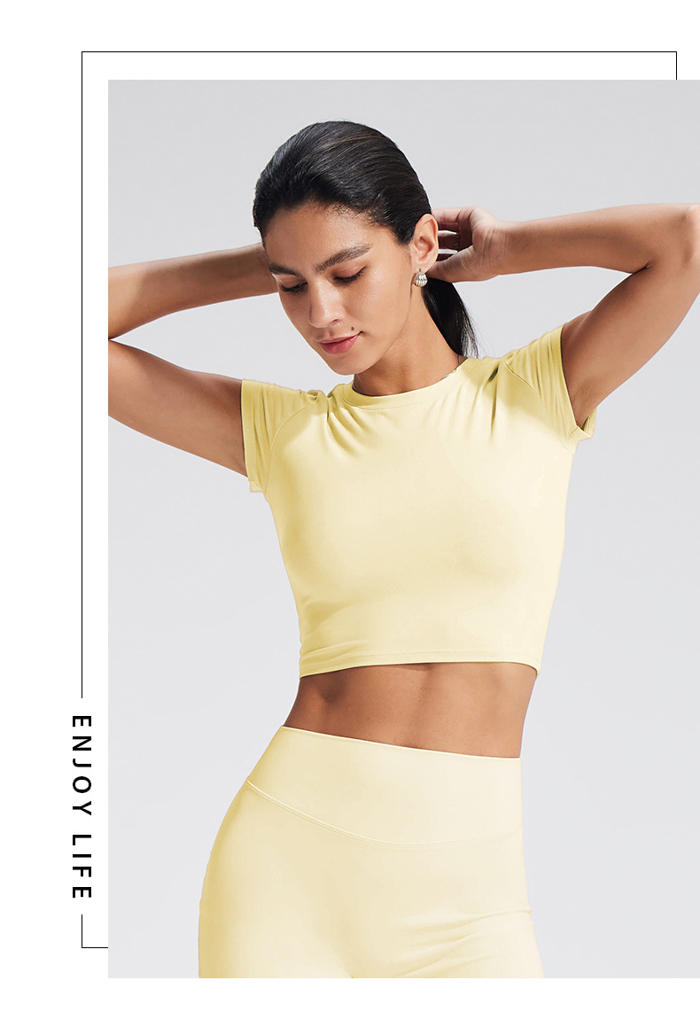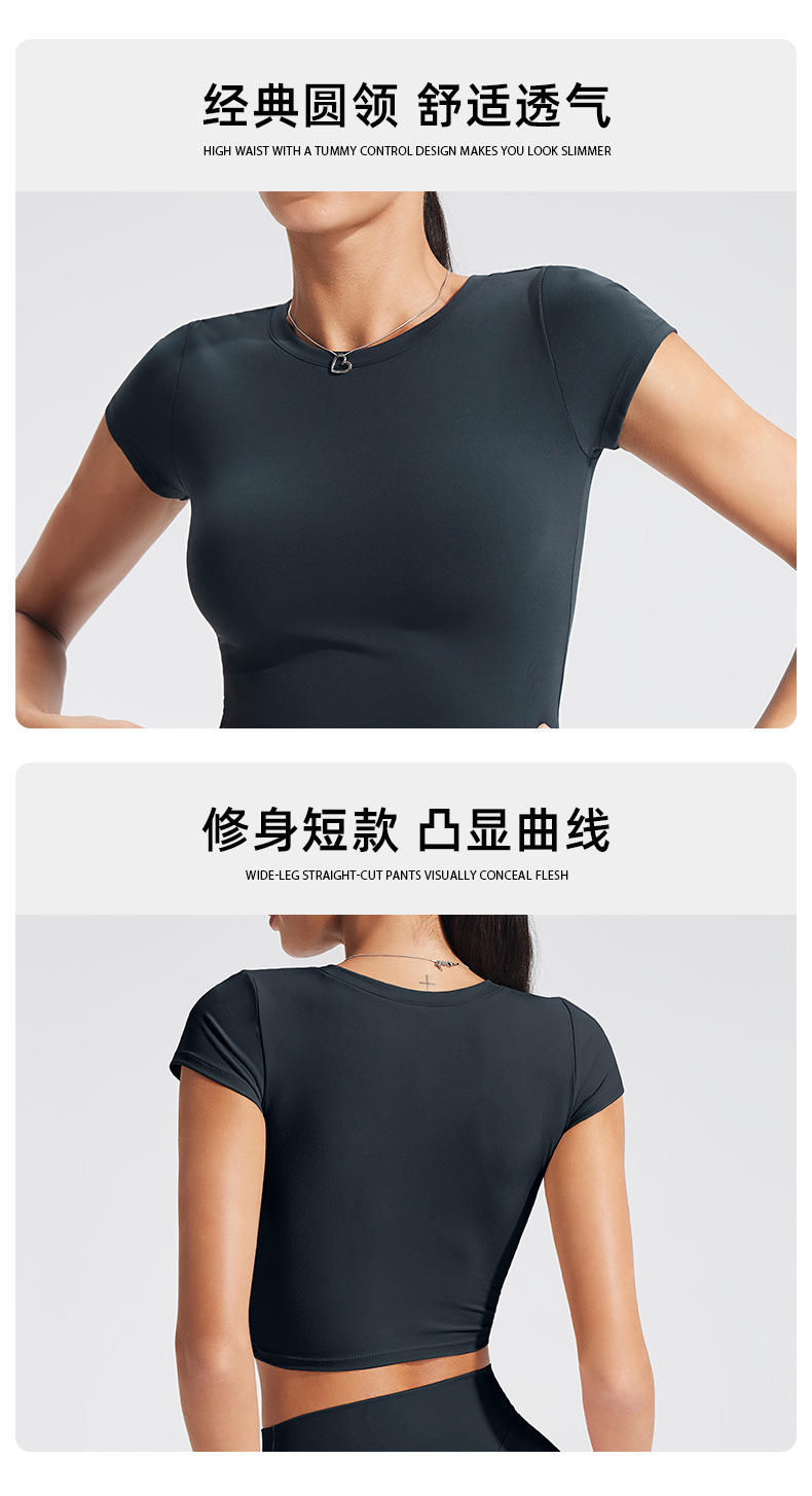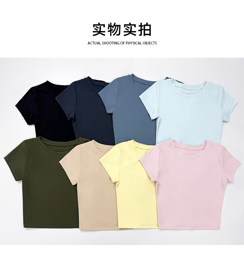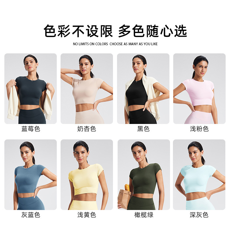 유럽과 미국의 크로스보더 요가복 여성용 스포츠 상의, 어깨가 타이트한 솔리드 컬러 피트니스 짧은 배꼽 노출 캐주얼 반팔 티셔츠스토어 가기