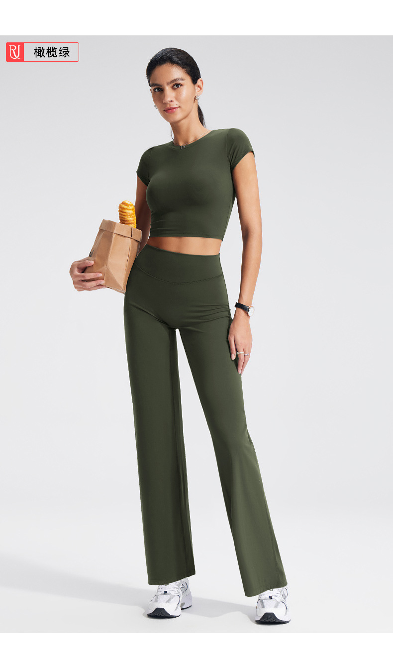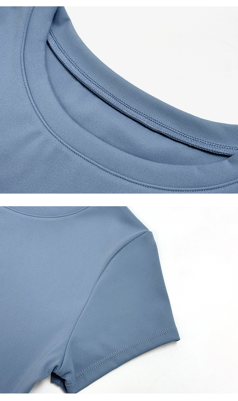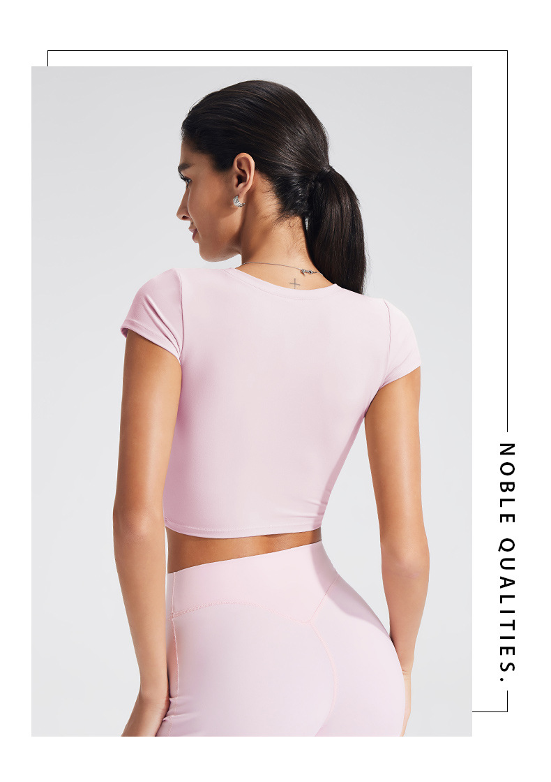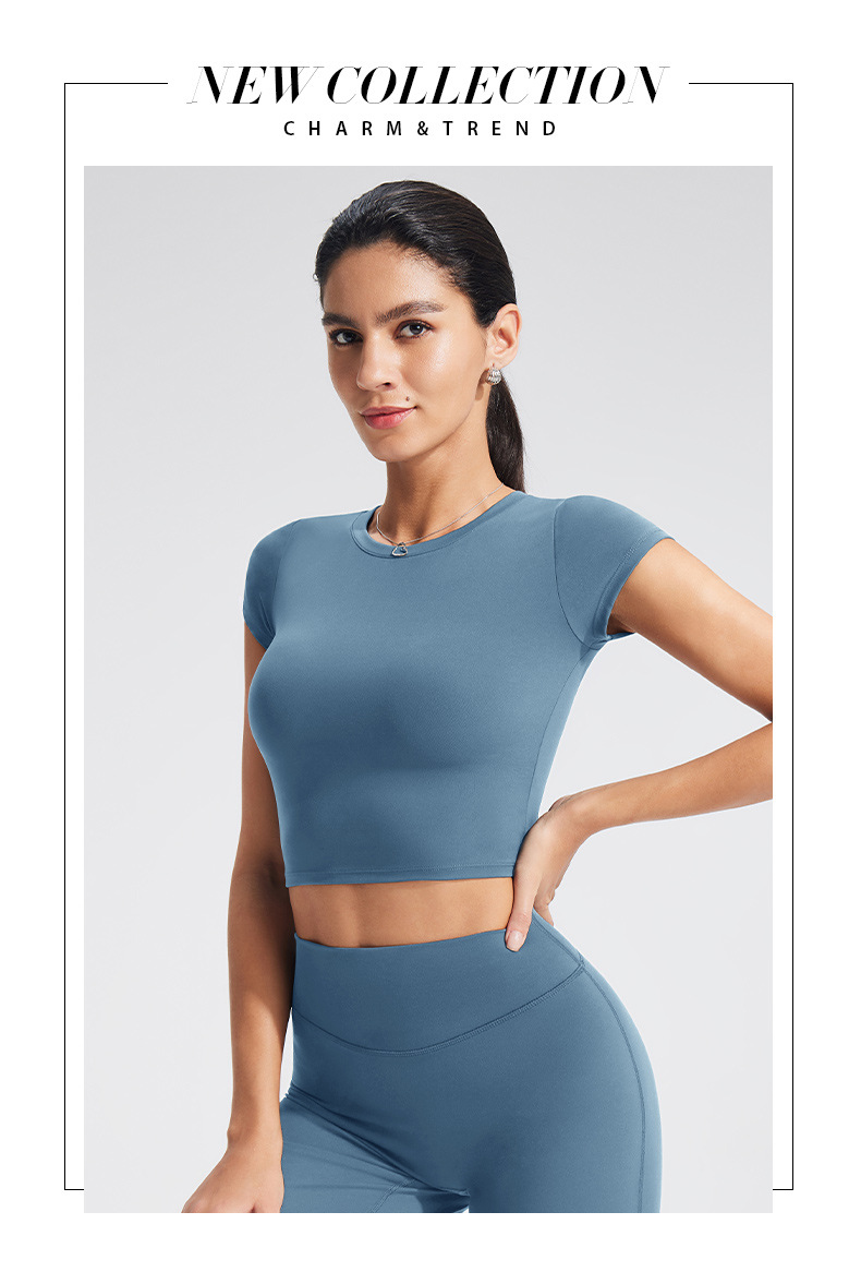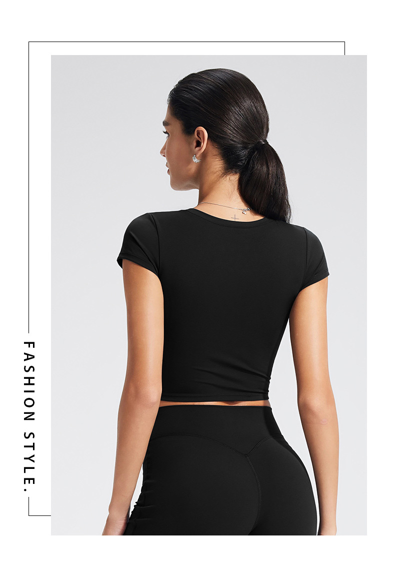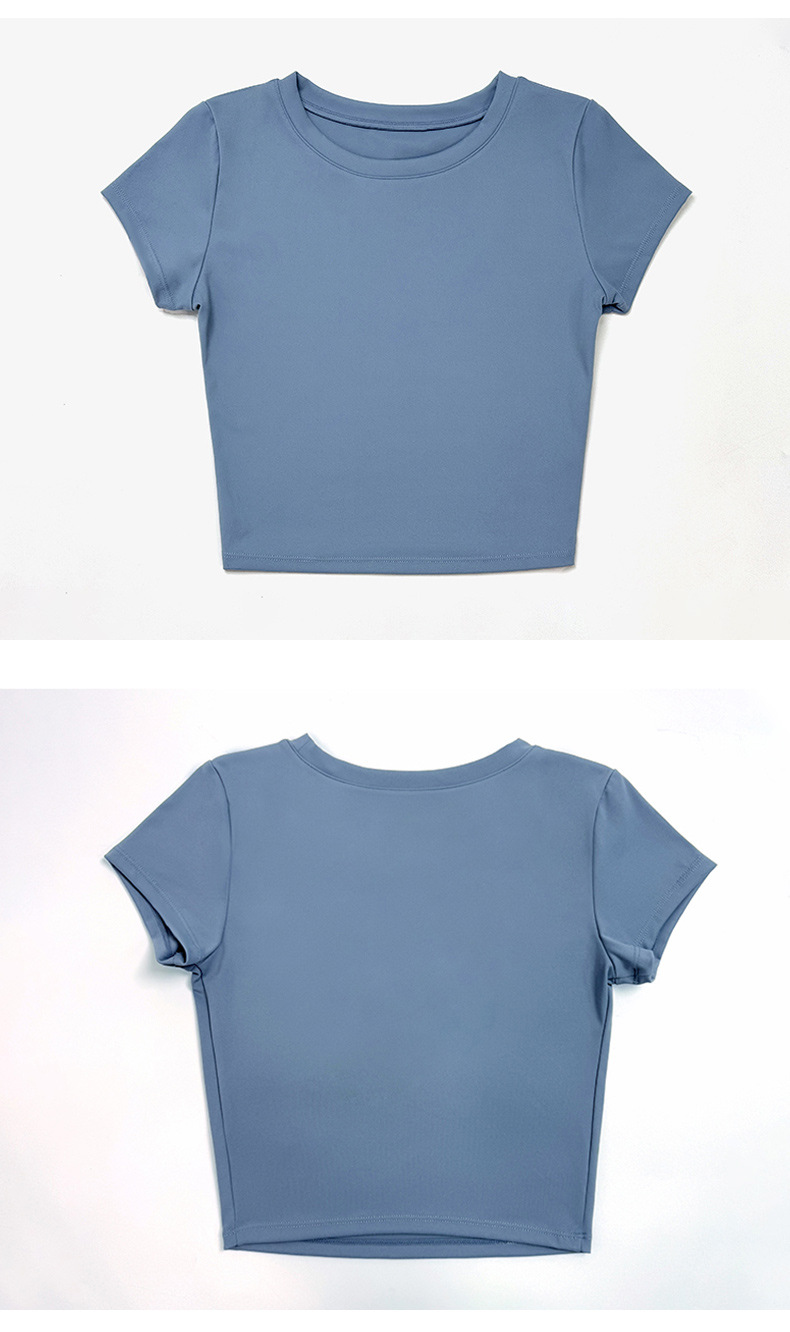 유럽과 미국의 크로스보더 요가복 여성용 스포츠 상의, 어깨가 타이트한 솔리드 컬러 피트니스 짧은 배꼽 노출 캐주얼 반팔 티셔츠스토어 가기