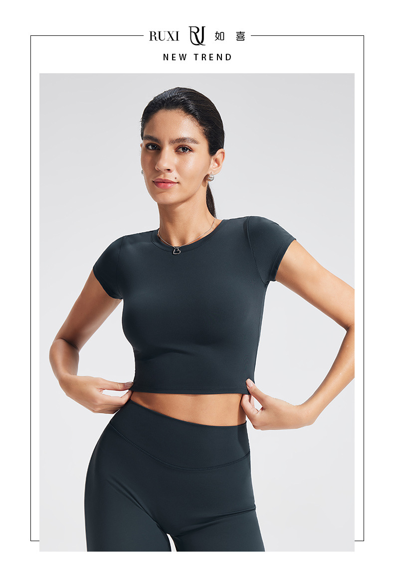 유럽과 미국의 크로스보더 요가복 여성용 스포츠 상의, 어깨가 타이트한 솔리드 컬러 피트니스 짧은 배꼽 노출 캐주얼 반팔 티셔츠