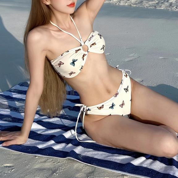 Ins 스타일 새로운 나비 프린트 비키니 튜브 탑 홀터넥 스트랩 섹시한 뜨거운 소녀 순수한 욕망 스타일 수영복 섬 여름