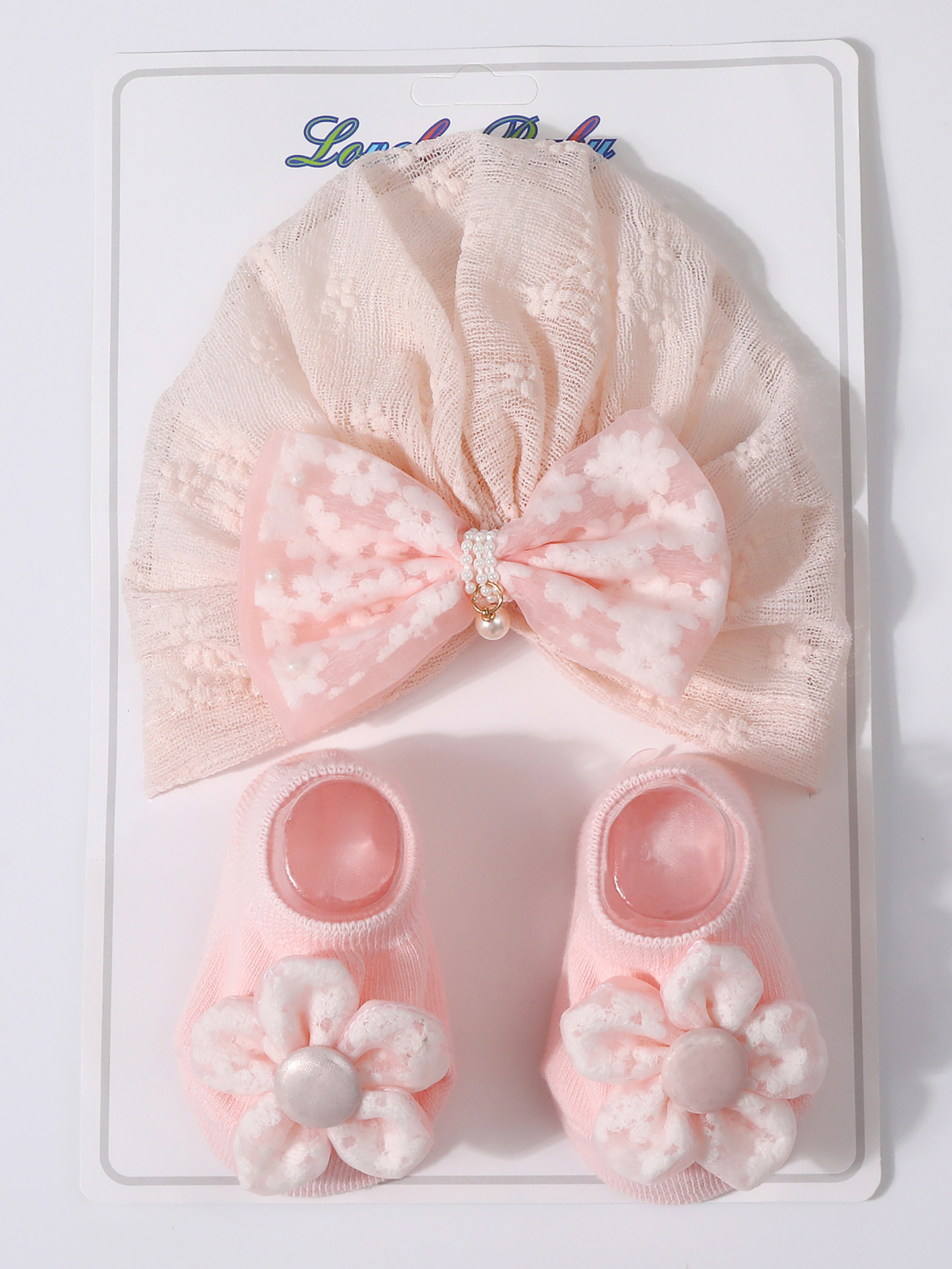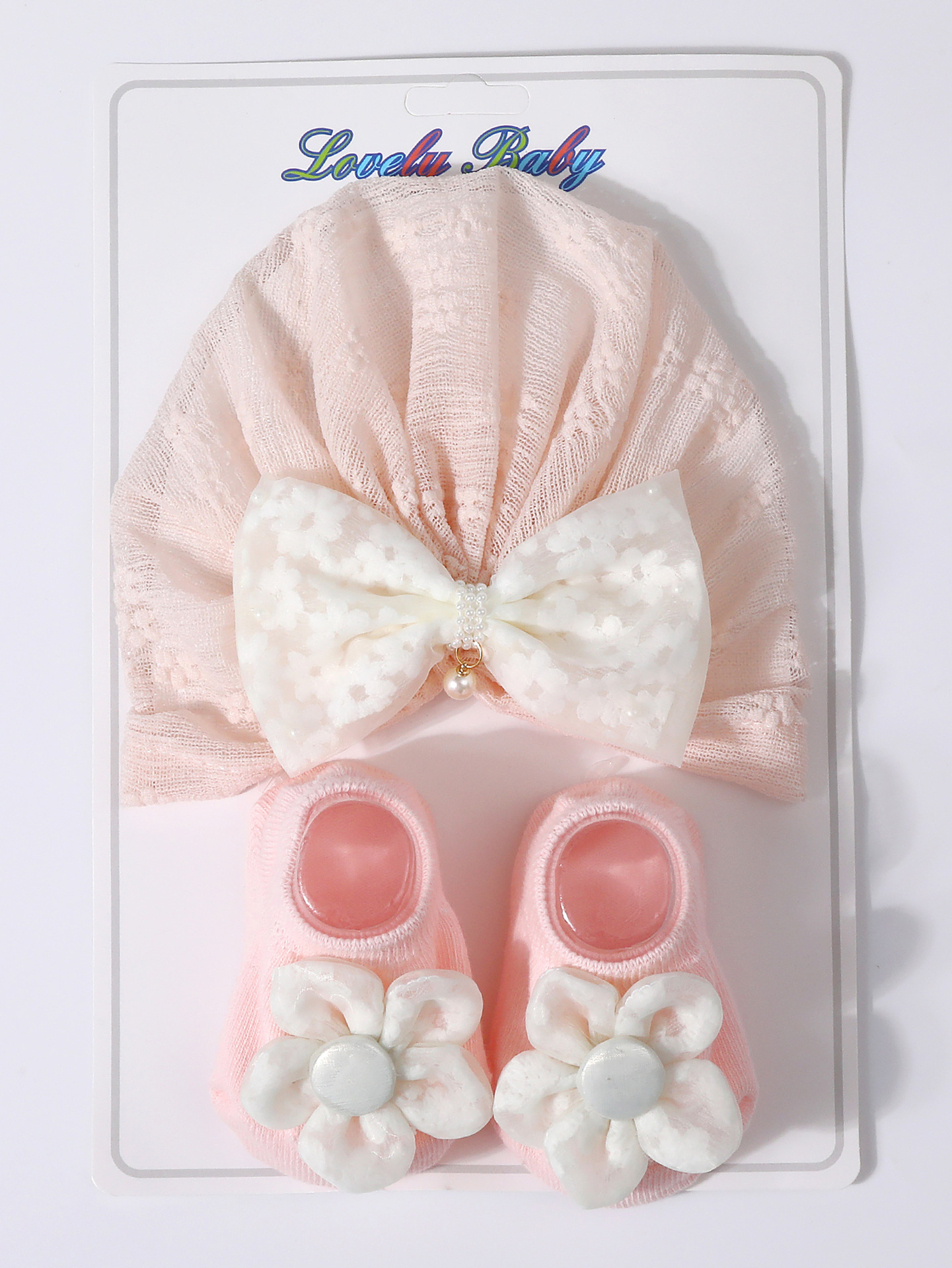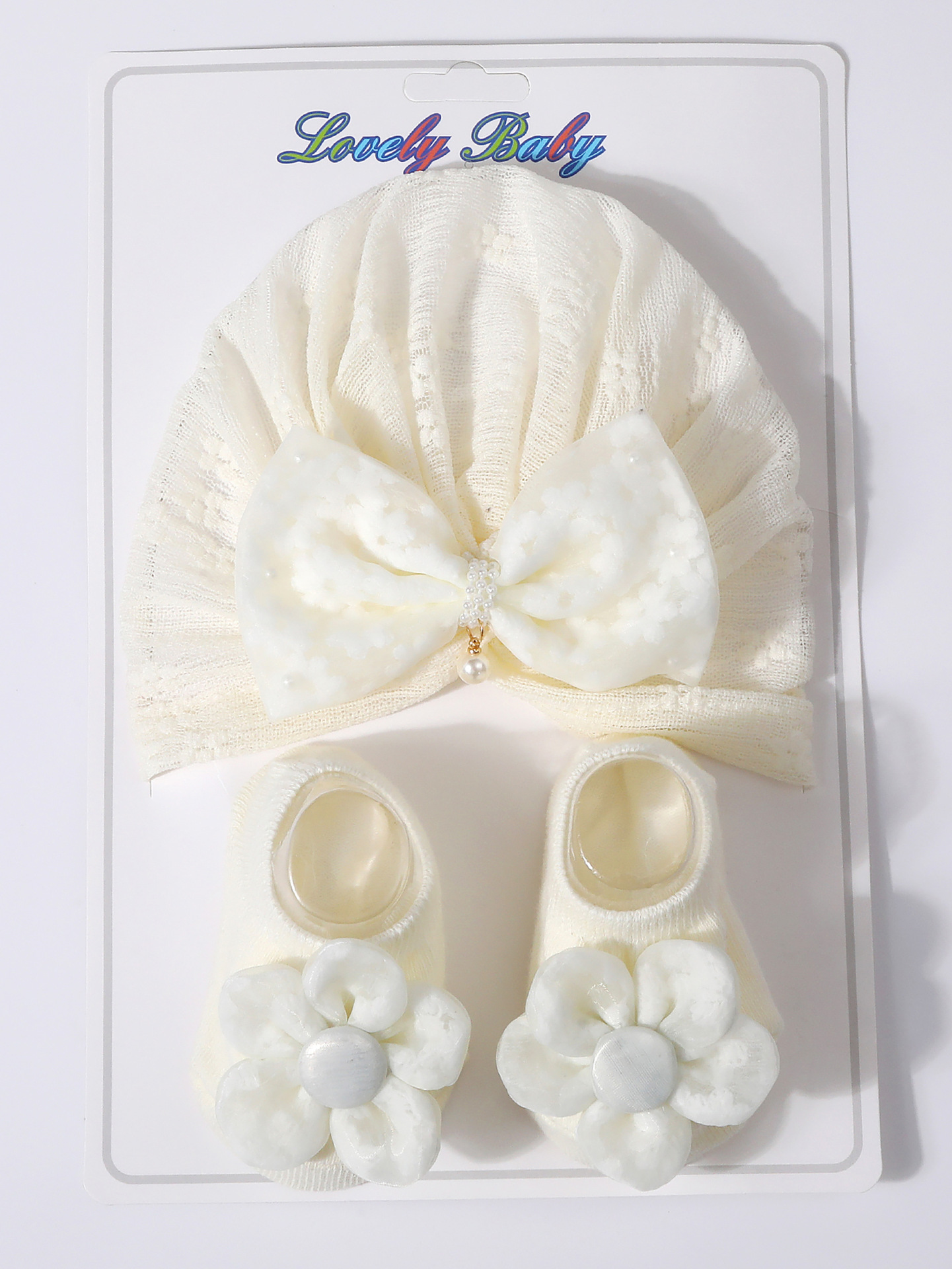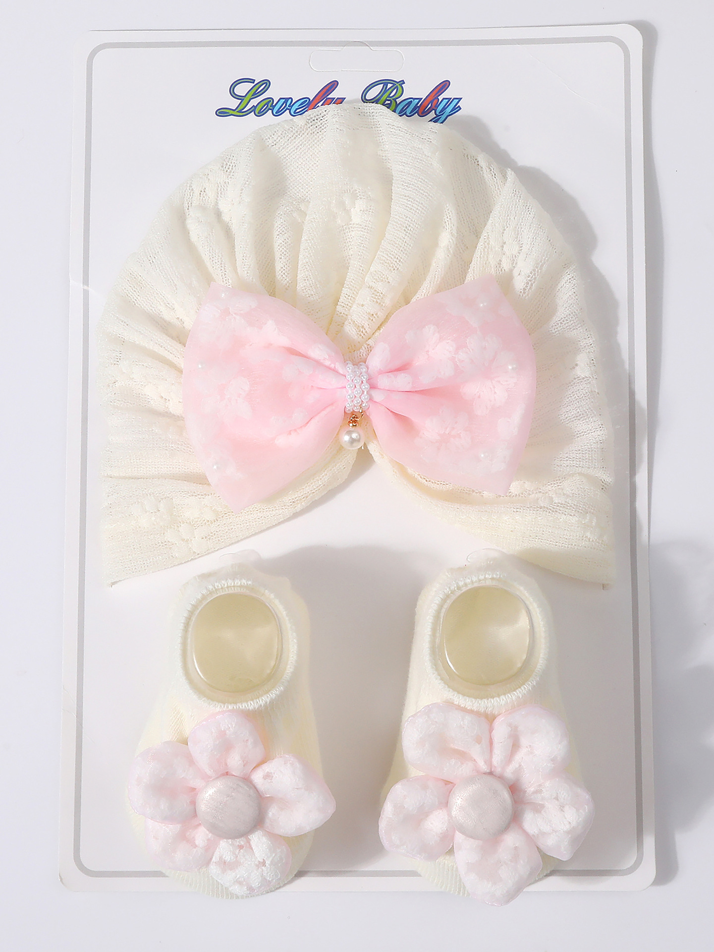 국경을 넘는 새로운 아기 레이스 보우 진주 중공 풀오버 모자 + 양말 세트 통기성 아기 터번 모자