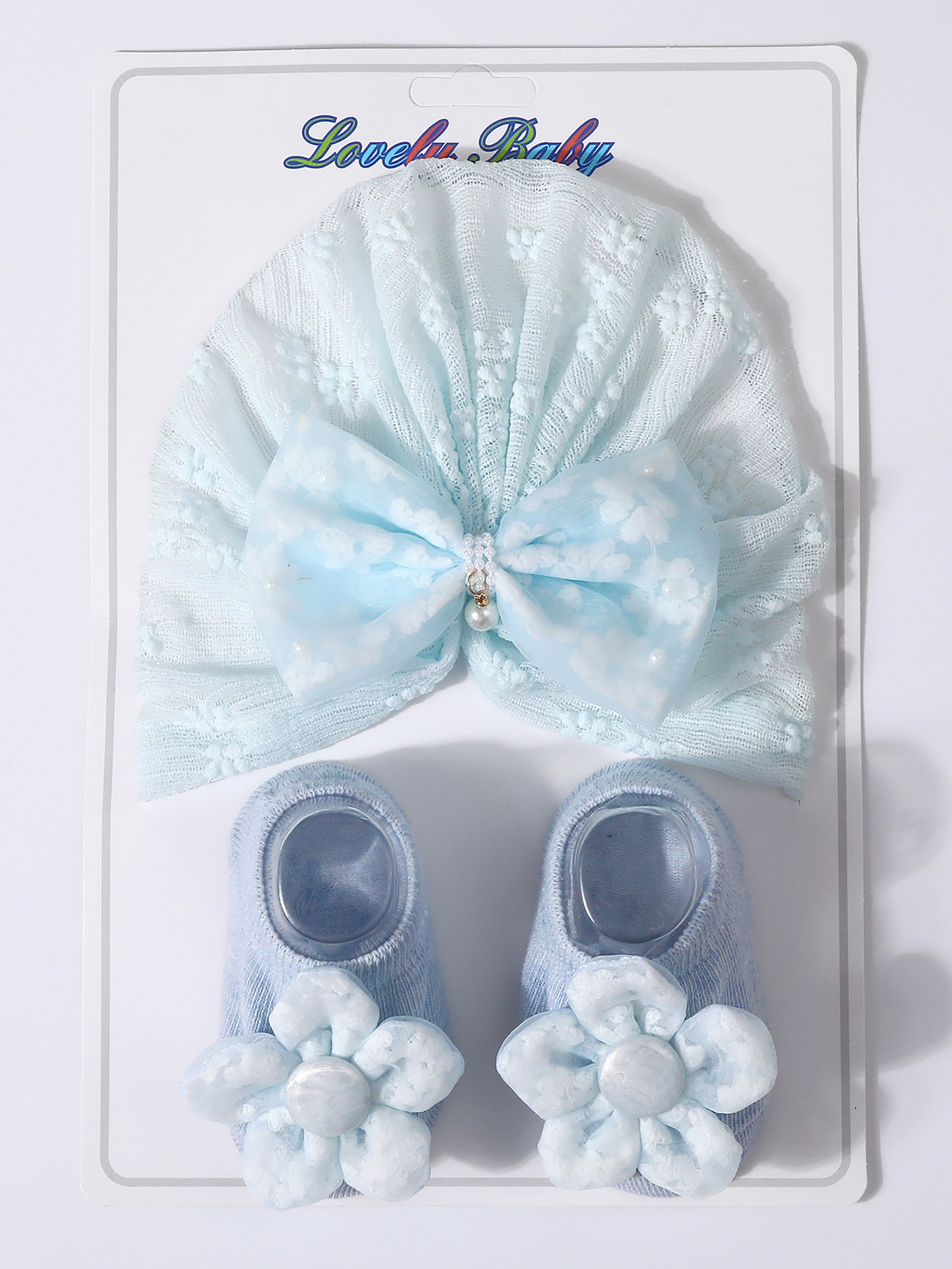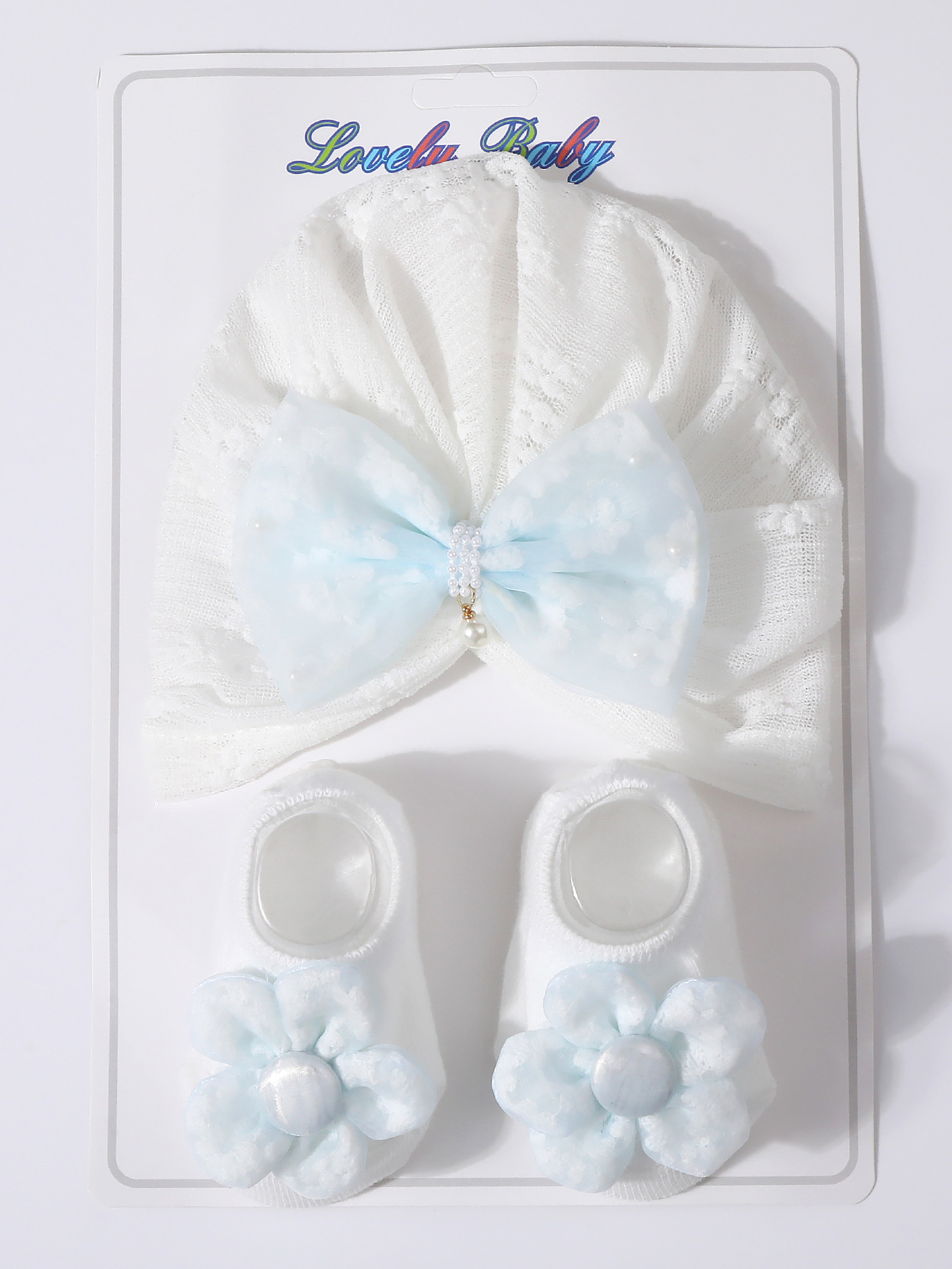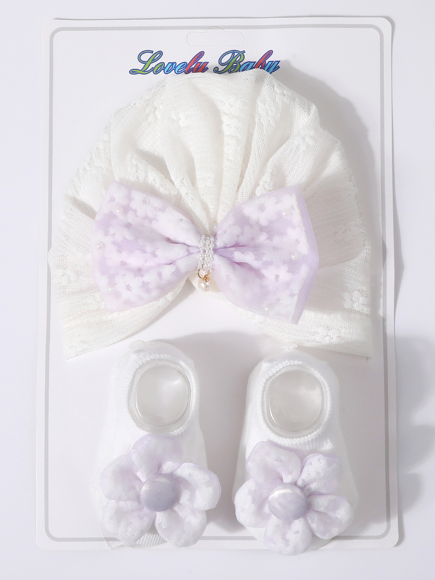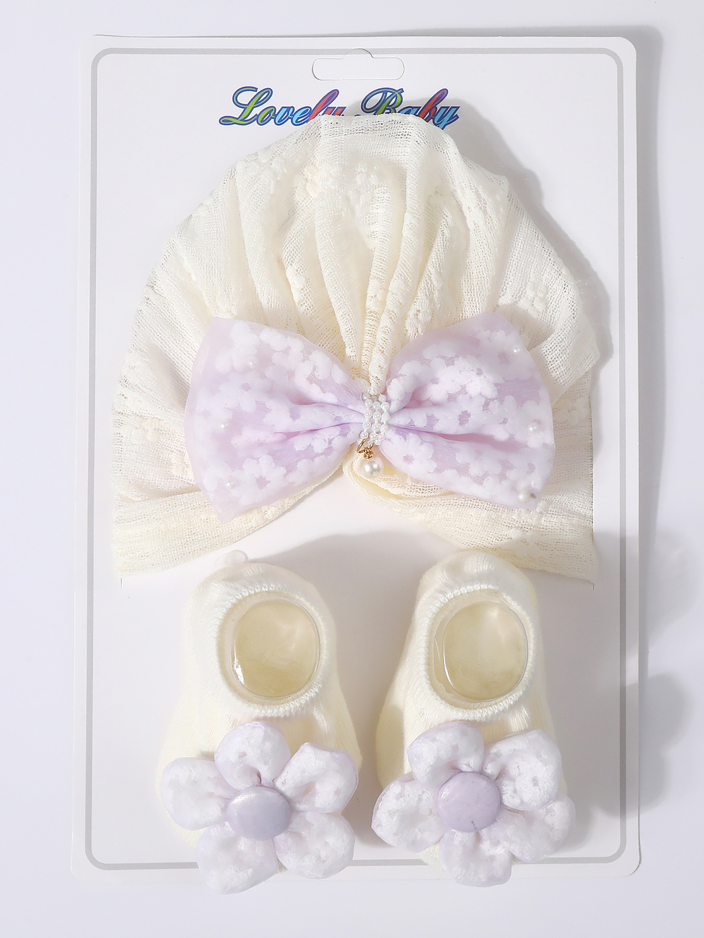국경을 넘는 새로운 아기 레이스 보우 진주 중공 풀오버 모자 + 양말 세트 통기성 아기 터번 모자