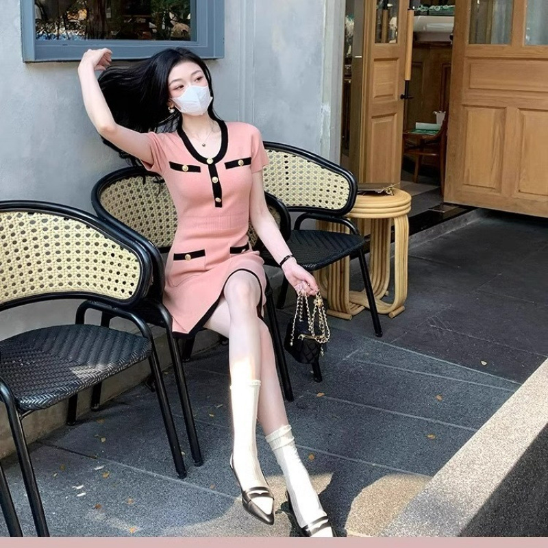 작은 향기로운 스타일 크루 넥 아이스 실크 니트 원피스 센스 사교계 우아한 핑크 짧은 소매 타이트 허리 슬리밍 짧은 치마스토어 가기