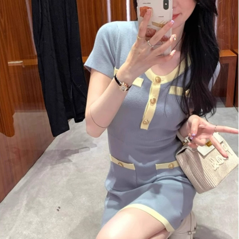 작은 향기로운 스타일 크루 넥 아이스 실크 니트 원피스 센스 사교계 우아한 핑크 짧은 소매 타이트 허리 슬리밍 짧은 치마