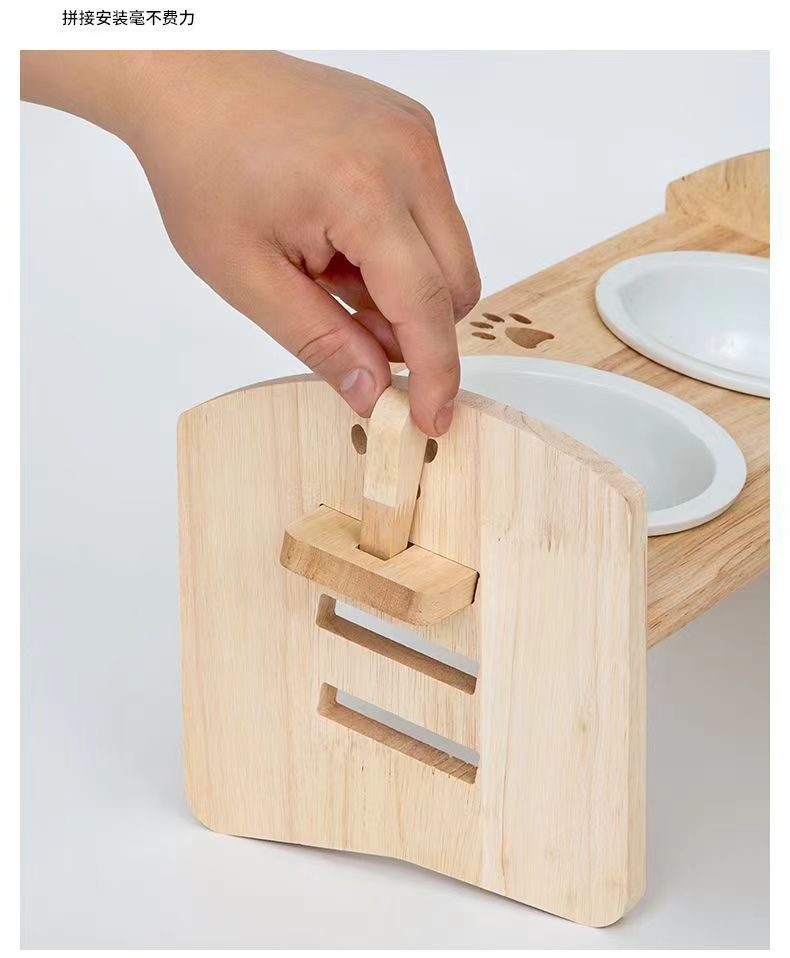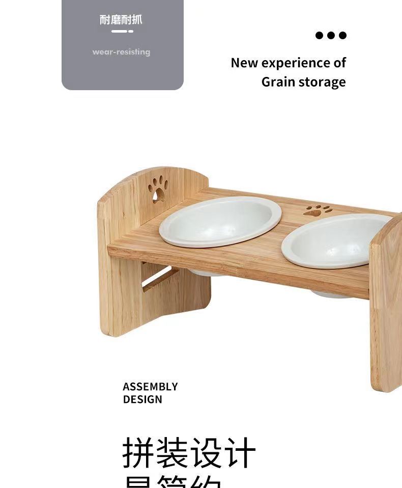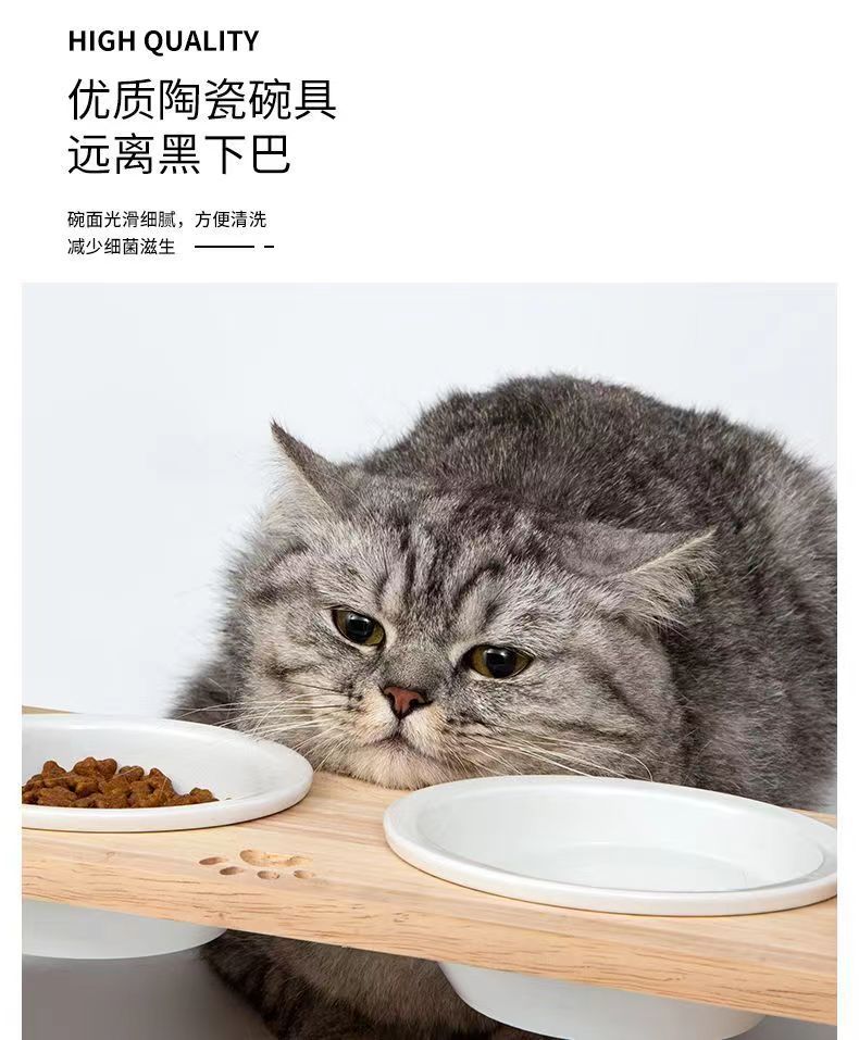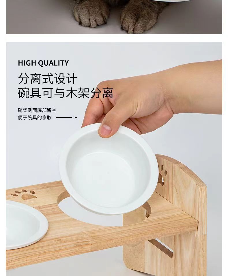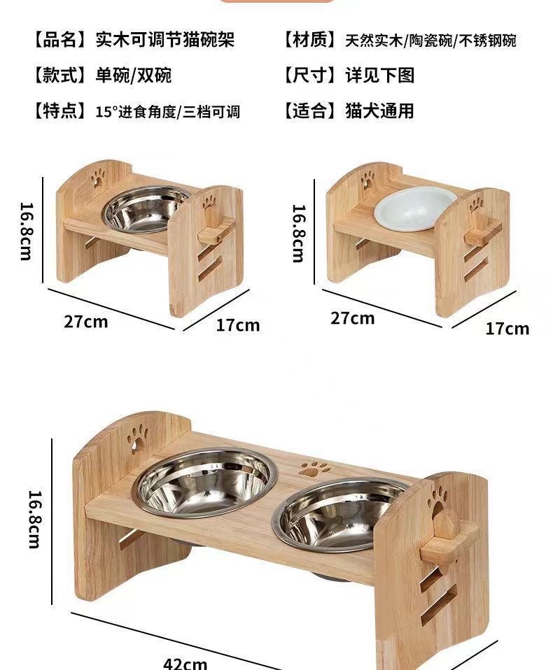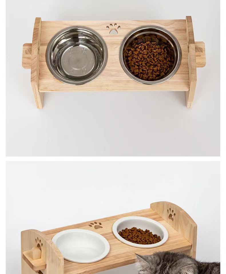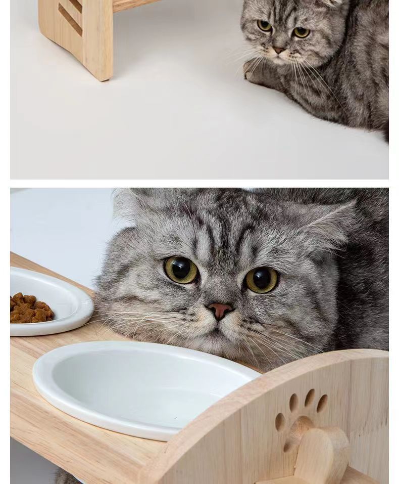 고양이를 위한 단단한 나무 고양이 그릇 랙, 대형 및 중형 개를 위한 경사진 입구 세라믹 가정용 고양이 먹이 받침대, 높이 조절 가능, 넘어짐 방지