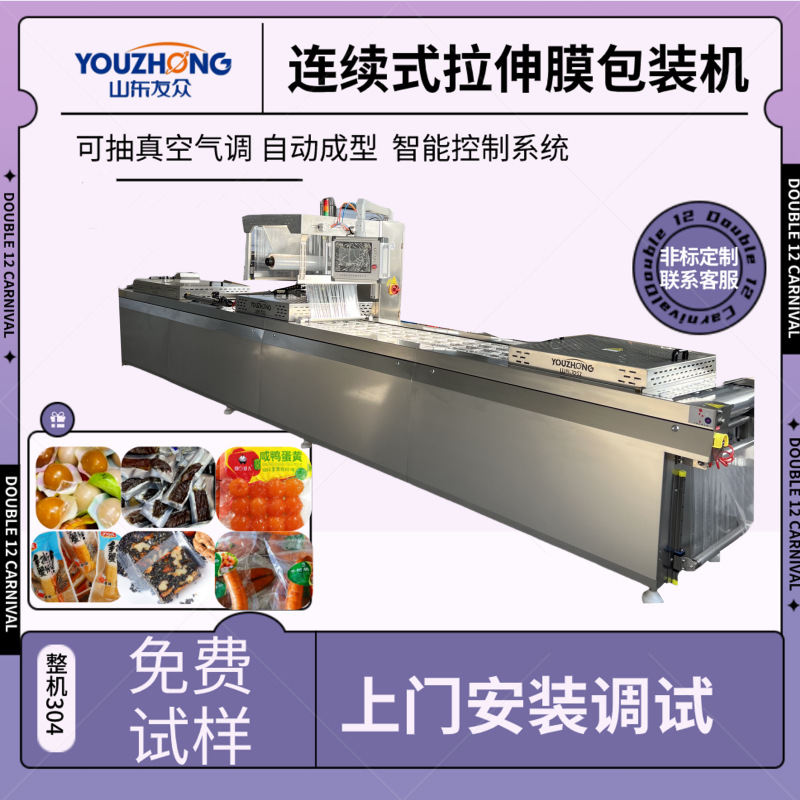 크리스피 소시지, 크리스피 소시지, 화산석 구이 소시지 스트레치 필름 진공 포장기, 소형 연속 포장기