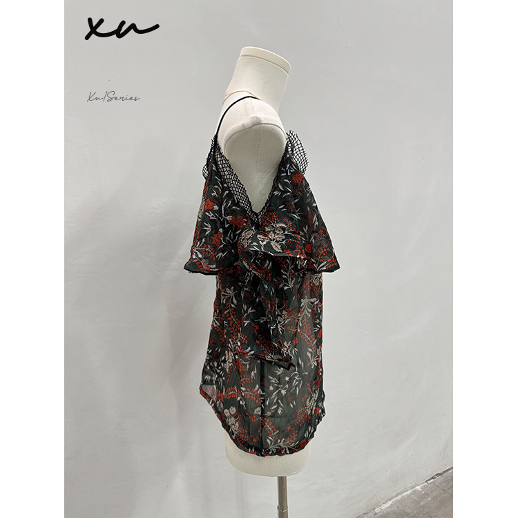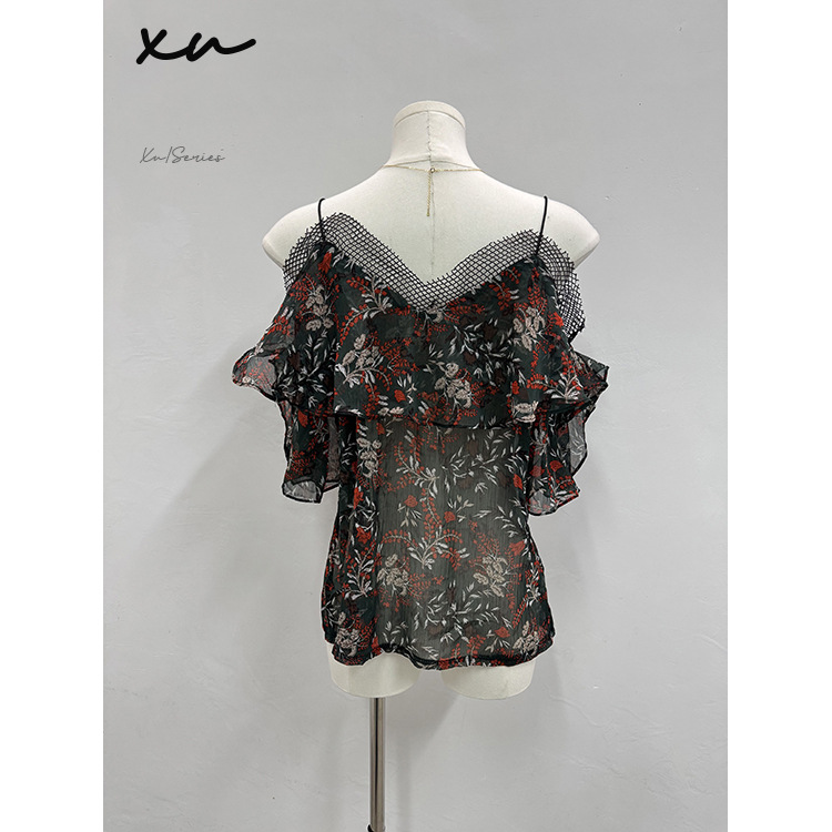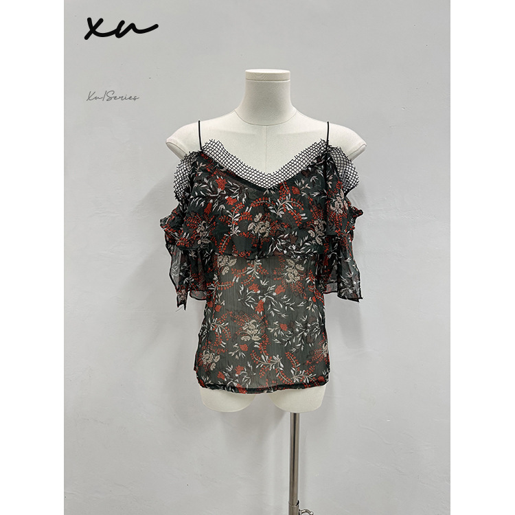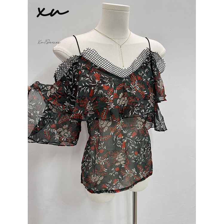 [여성의류 재고정리] XU188 # F 사이즈 여성 패치워크 오프숄더 프린트 쉬폰 셔츠