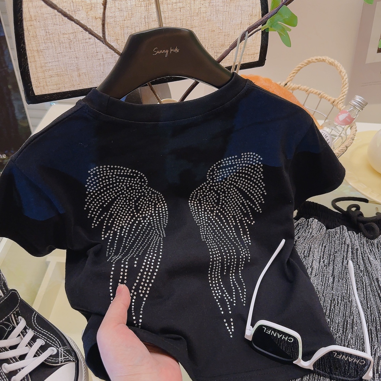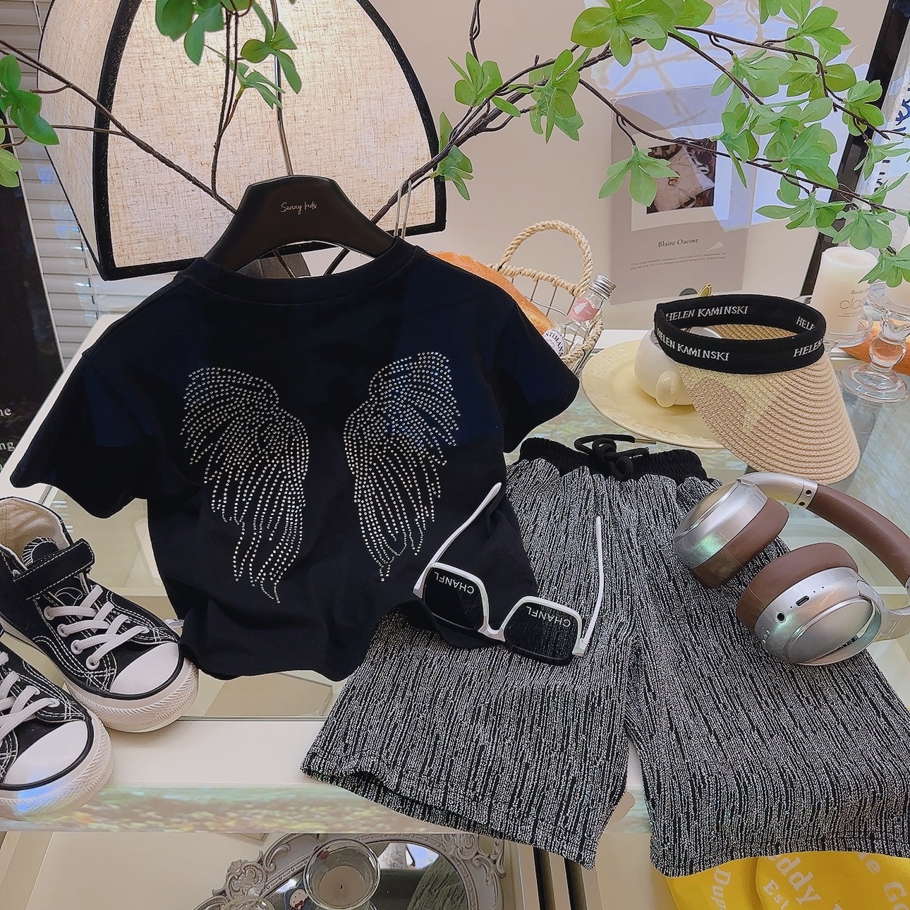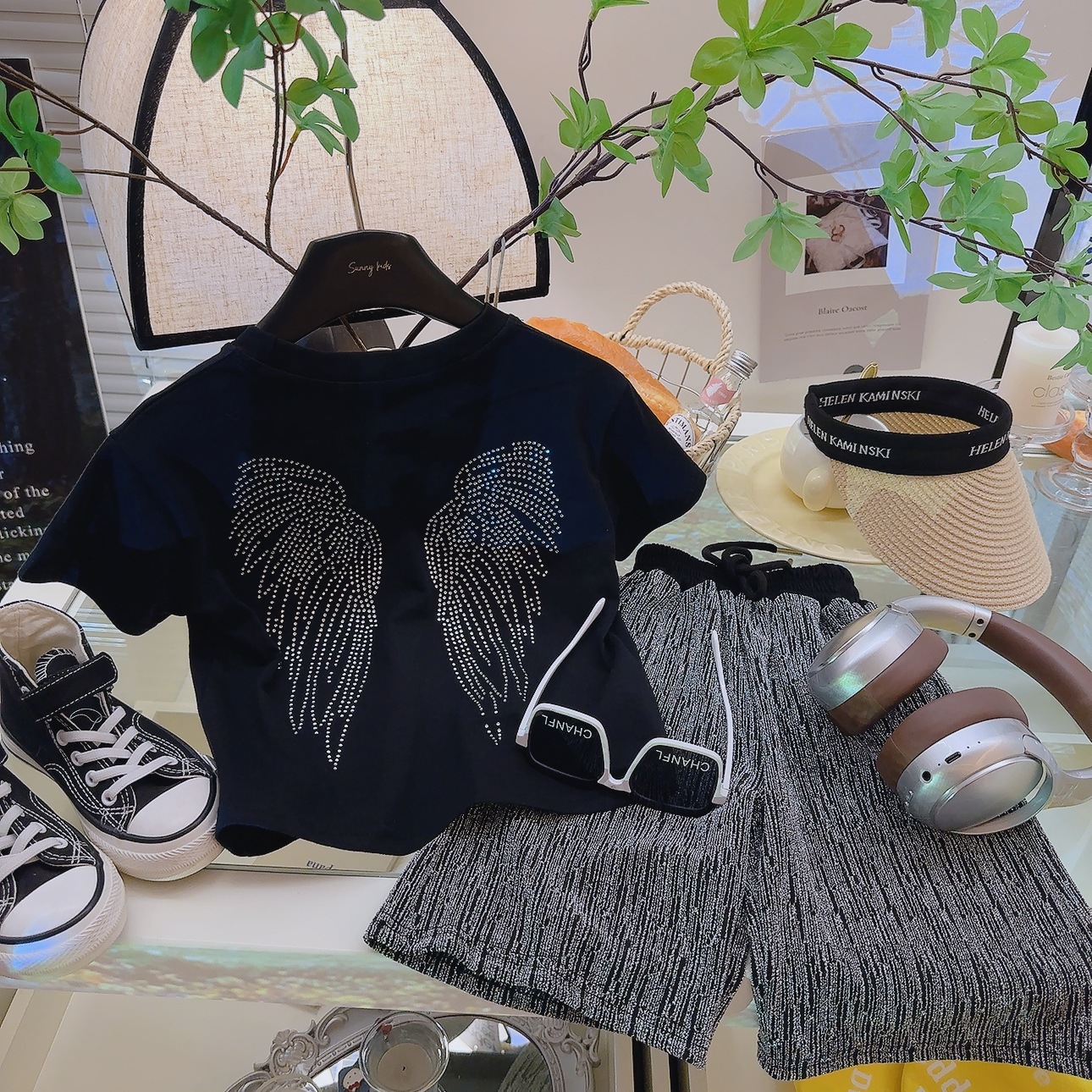 소년 여름 정장 2025 새로운 어린이 여름 정장 반짝이는 다이아몬드 날개 반팔 반바지 투피스 세트 드롭 배송스토어 가기