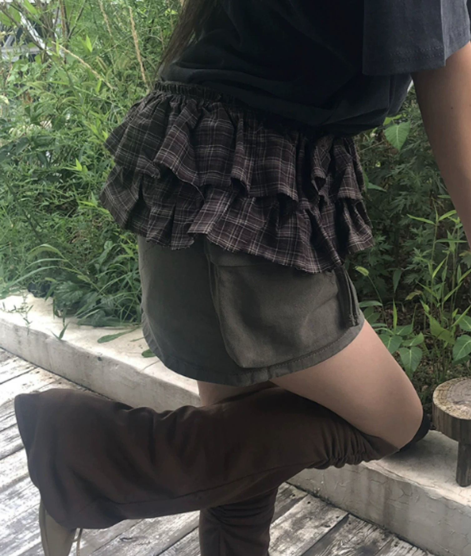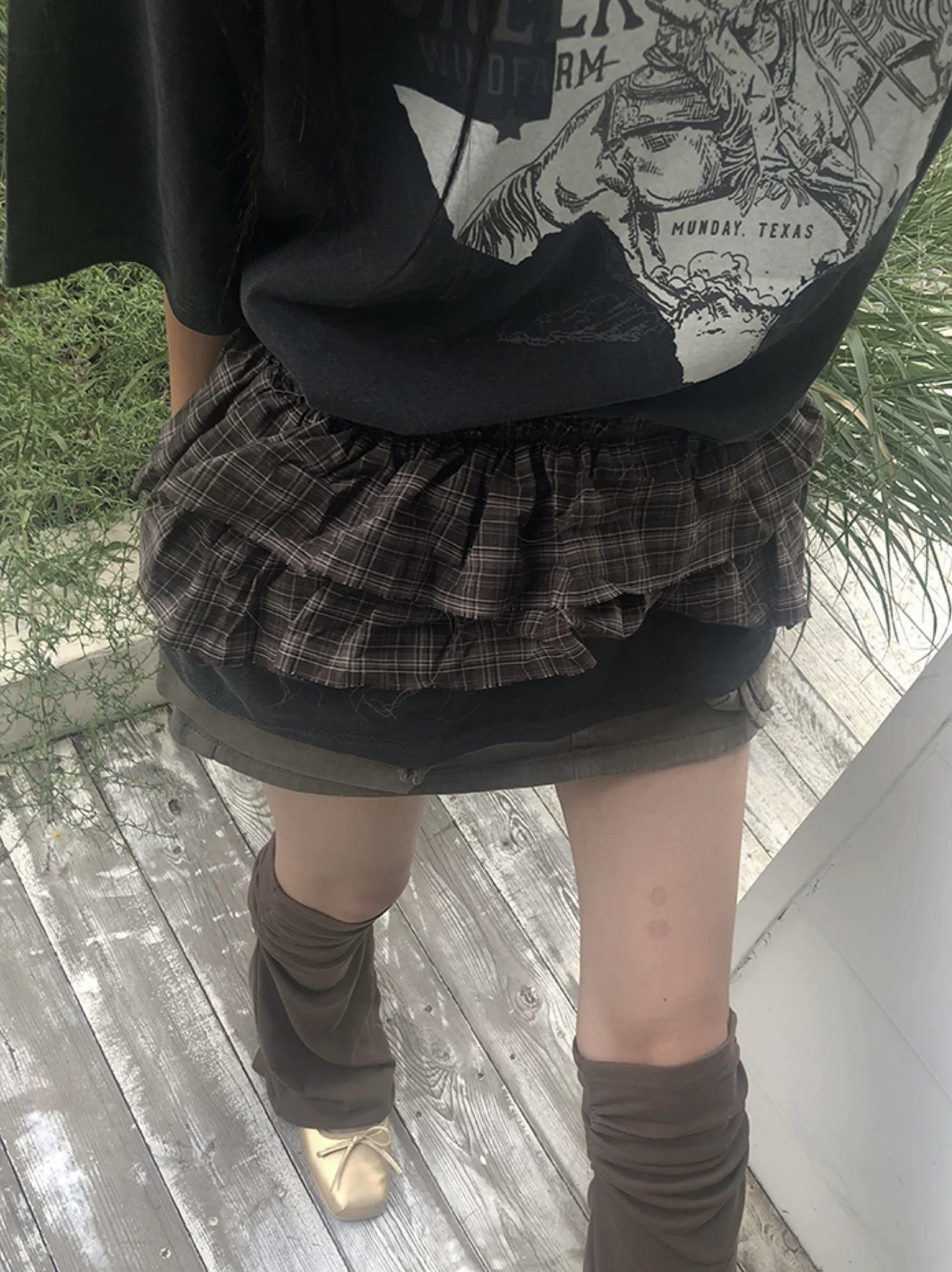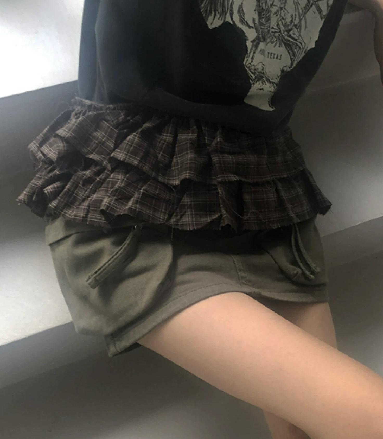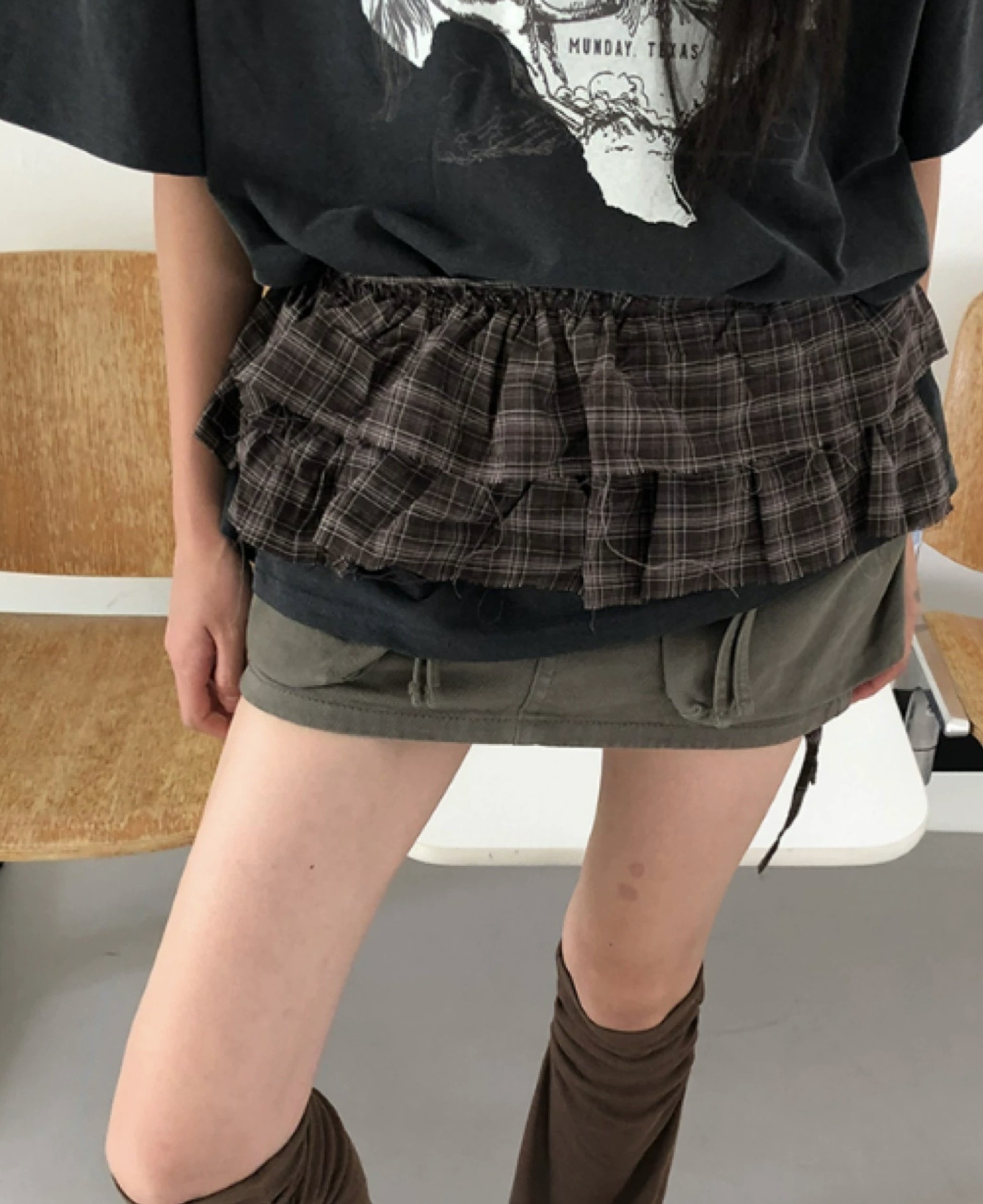투톤 레이어드 아이템 일본식 한국 인스 레트로 체크무늬 주름 레이스 허리끈 스커트 힙 커튼 스커트