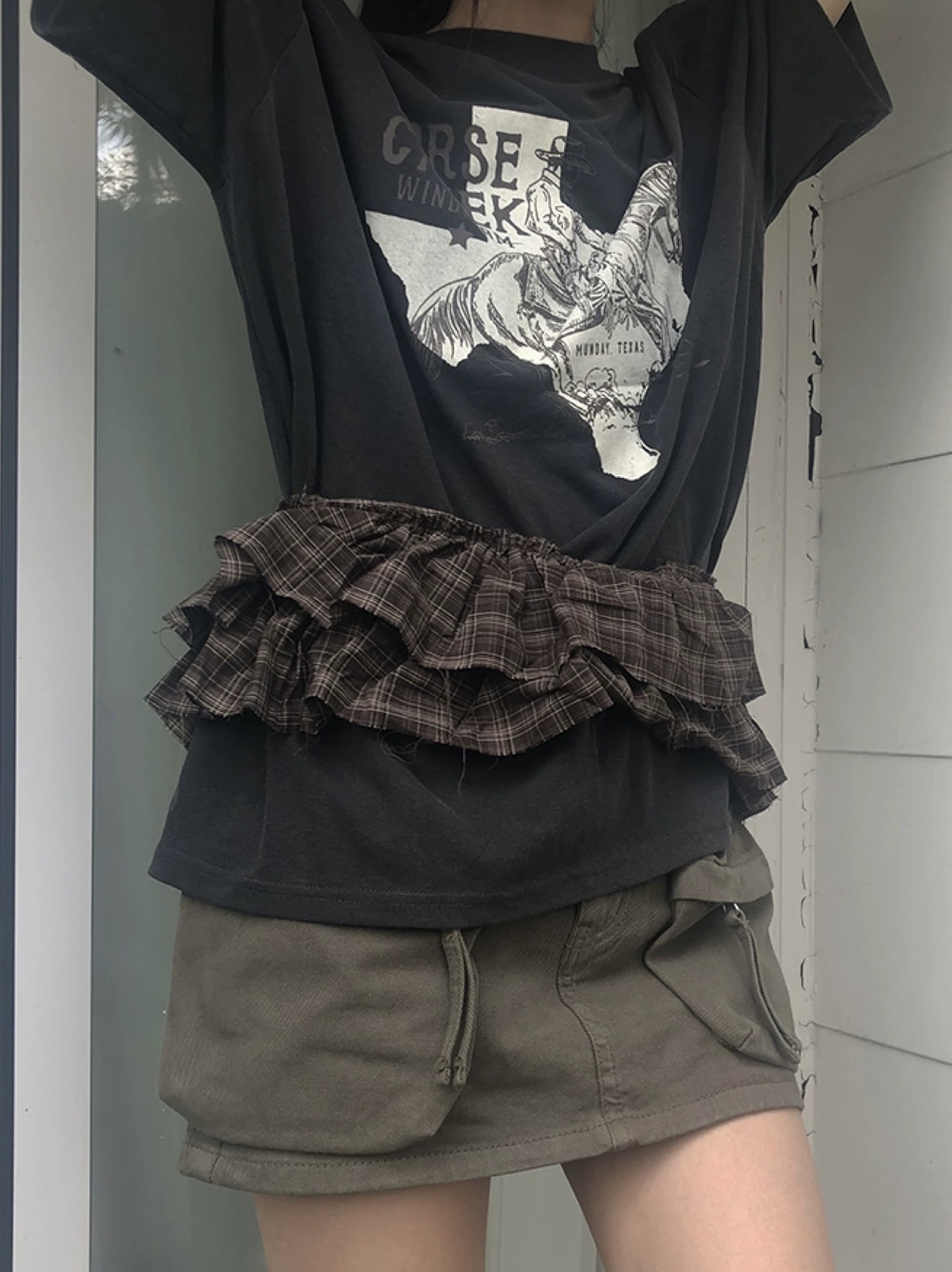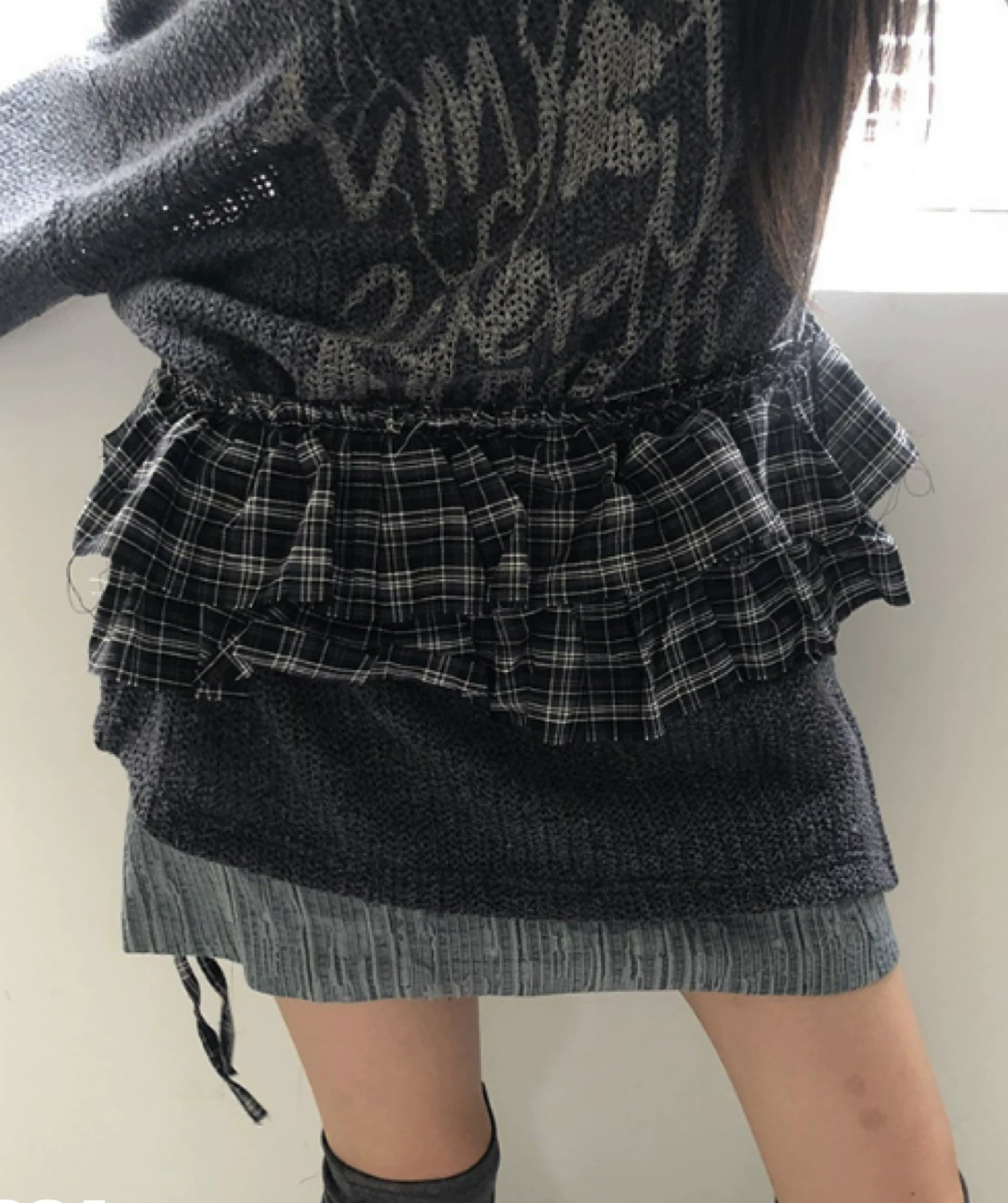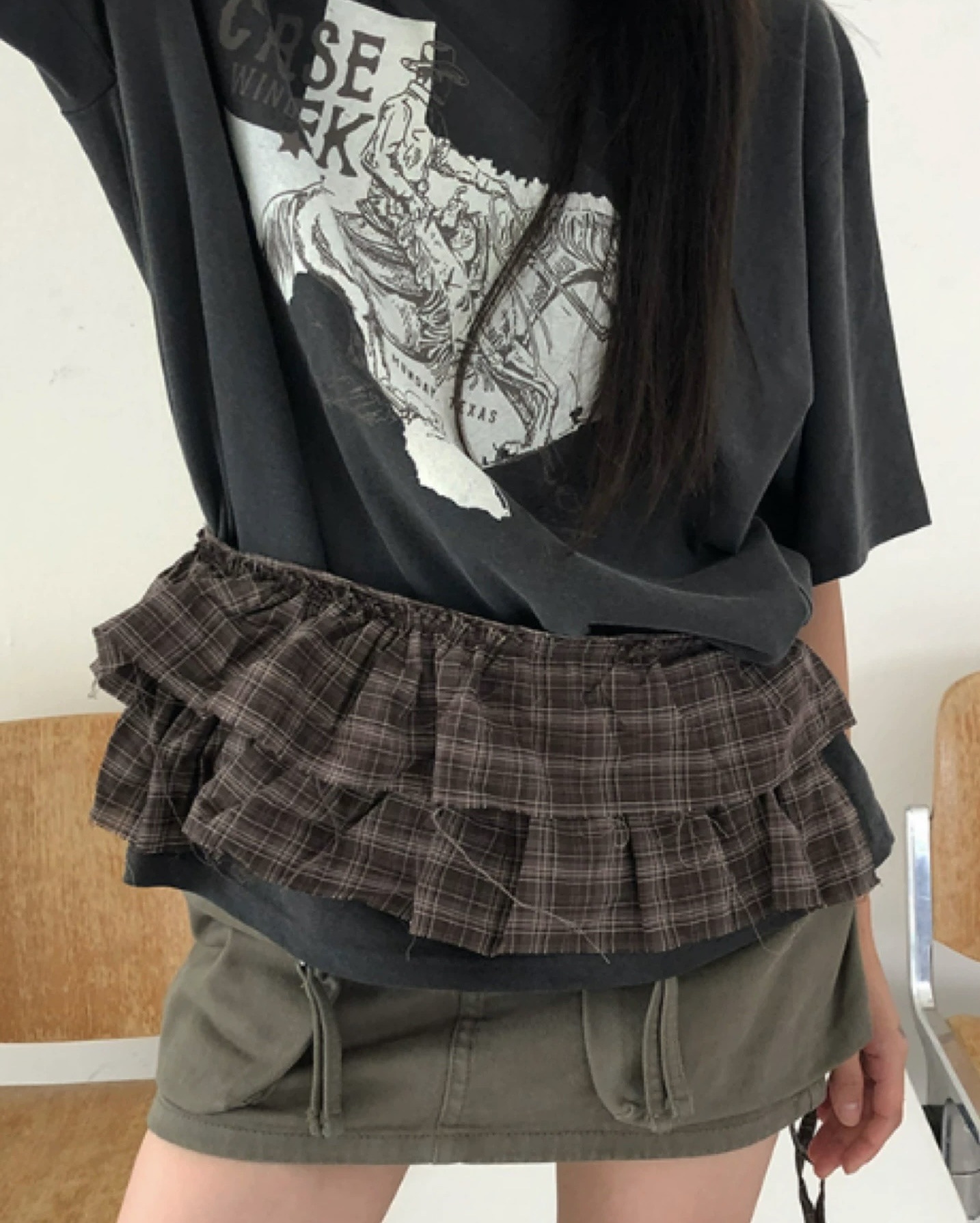 투톤 레이어드 아이템 일본식 한국 인스 레트로 체크무늬 주름 레이스 허리끈 스커트 힙 커튼 스커트