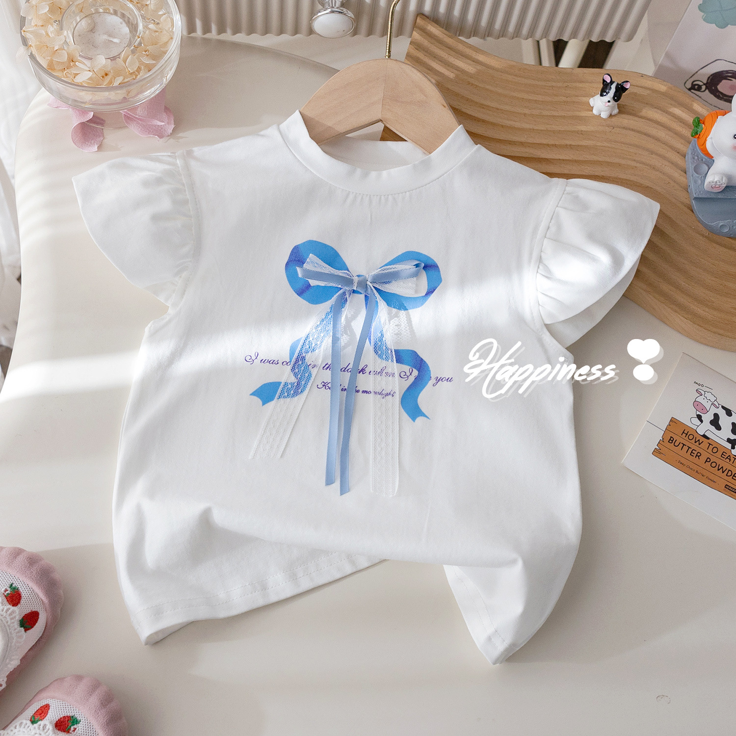 한국 아동복 여아 여름 정장 레이스 보우 플라잉 슬리브 티셔츠 패셔너블 플리츠 스커트 여아 여름 패션 트렌드