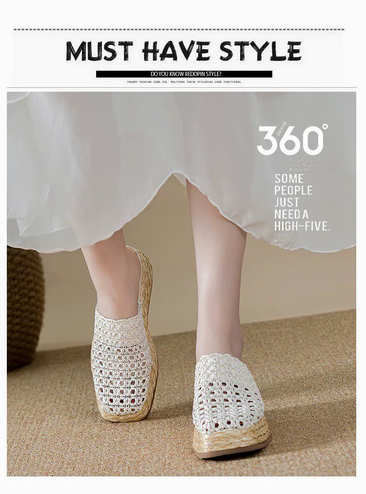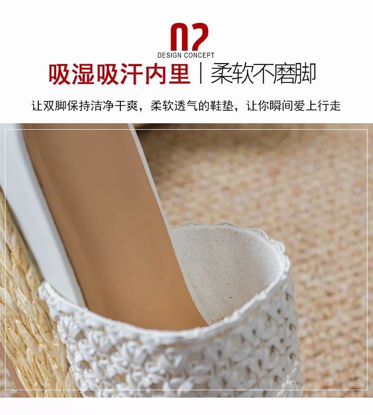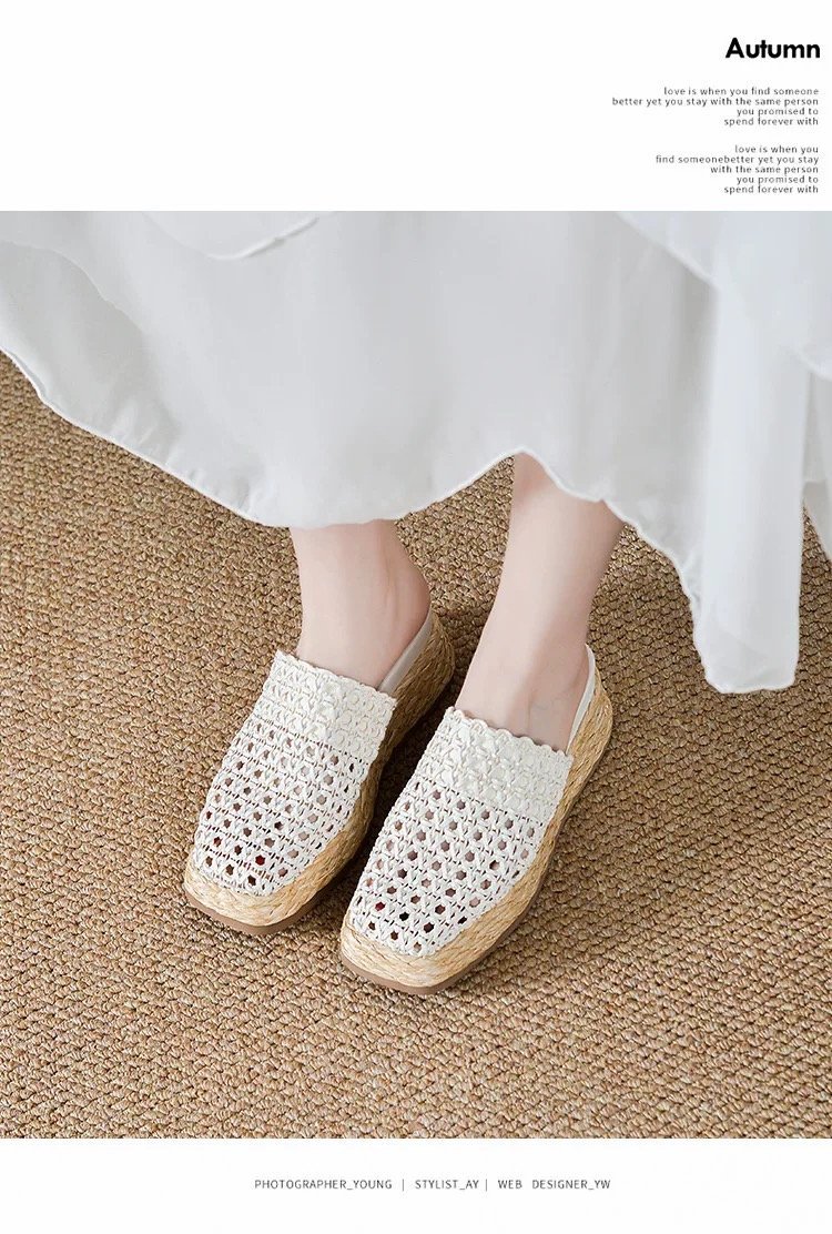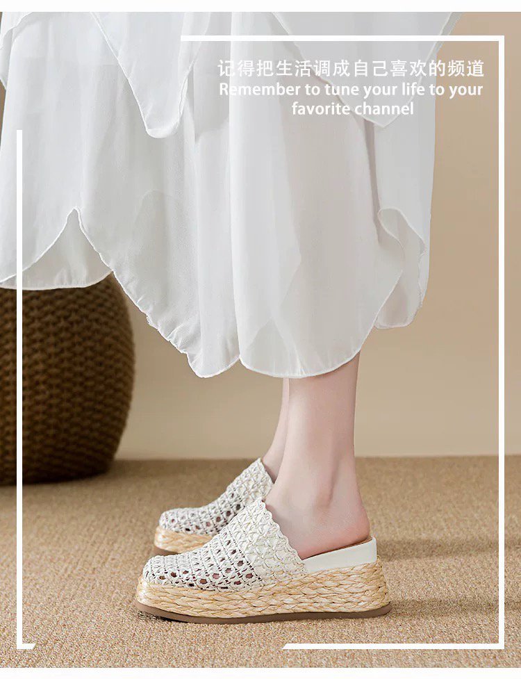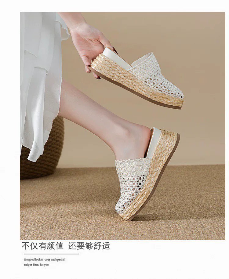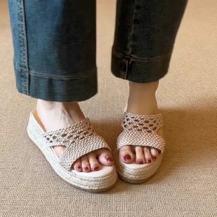 여성을위한 바오 터우 샌들 2025 새로운 여름 겉옷 리넨 두꺼운 밑창 웨지 여성 신발 중공 메쉬 하프 슬리퍼