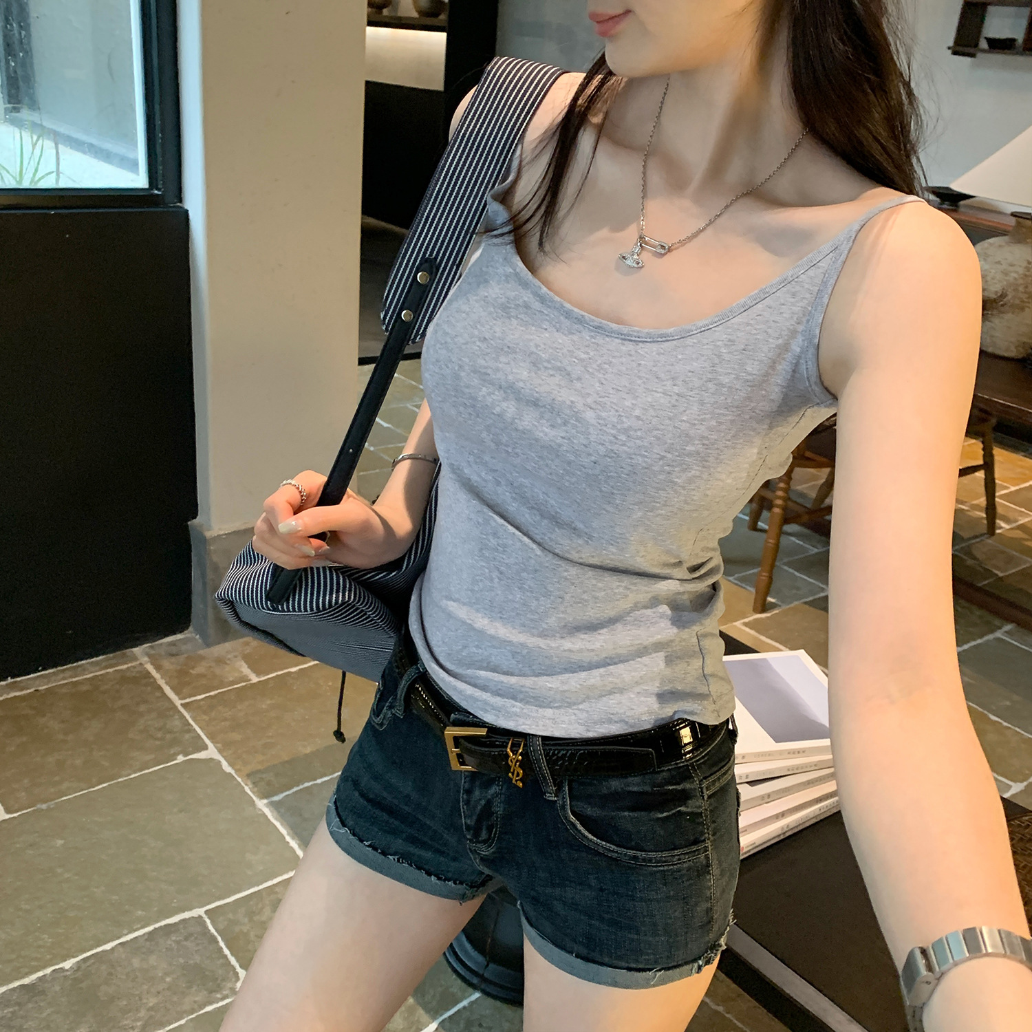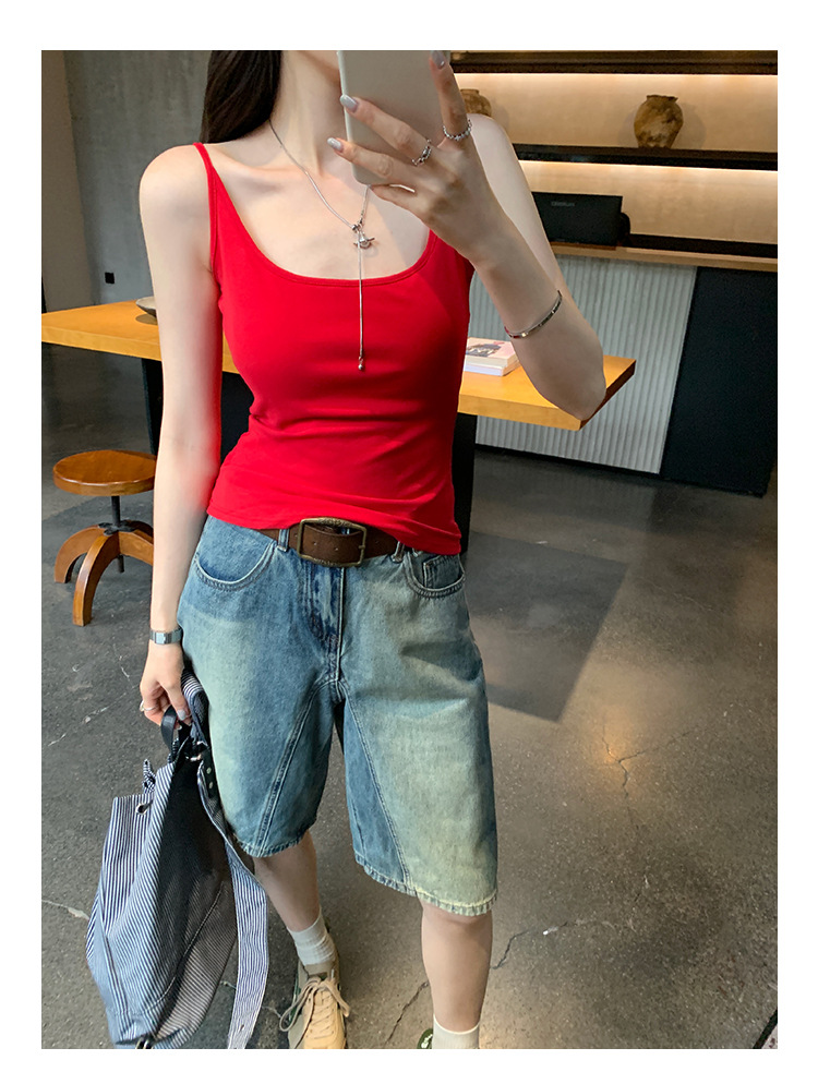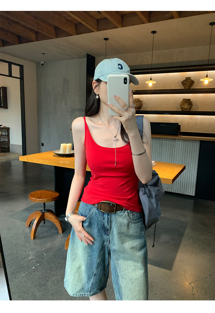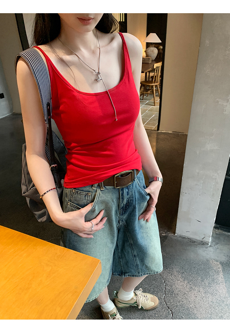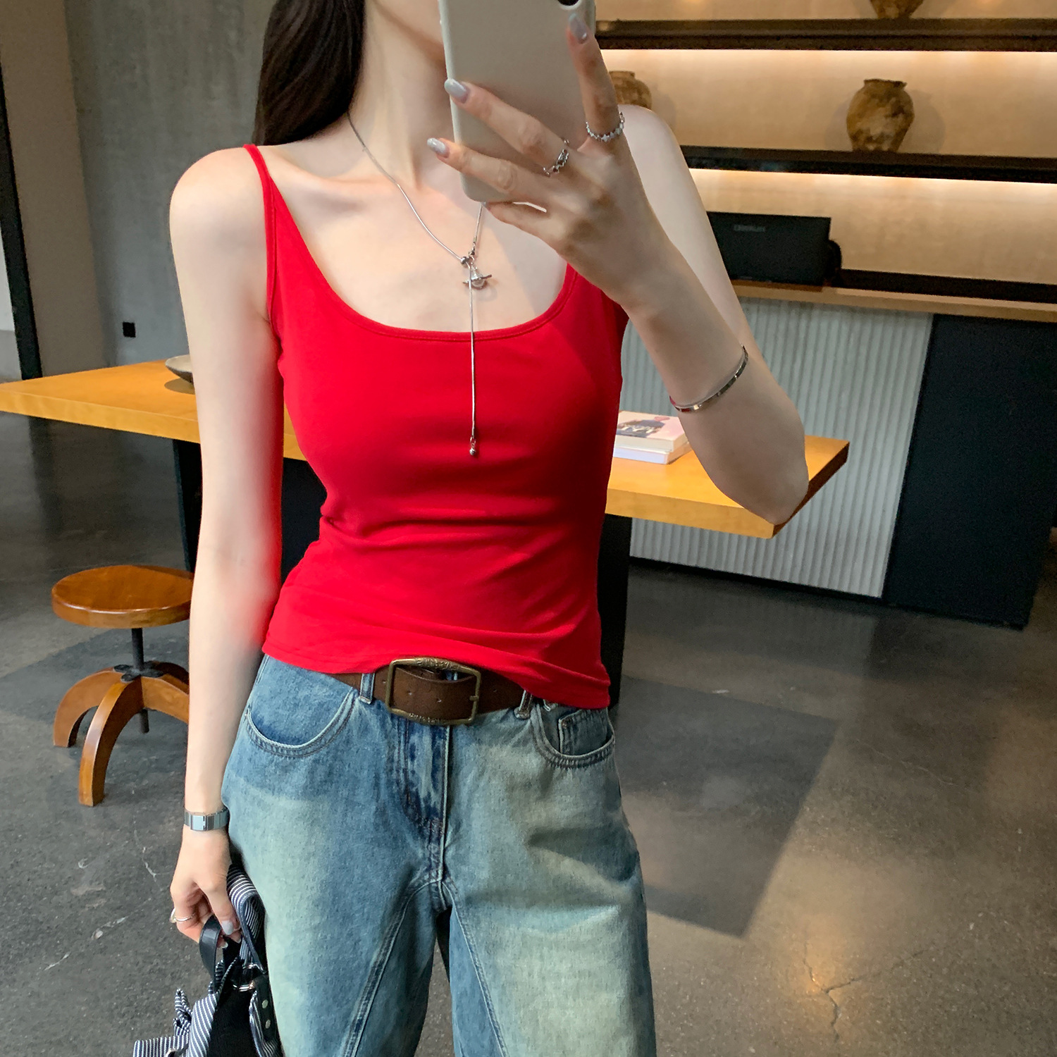 가슴 패드가 있는 태국 스타일의 핫하고 섹시한 빨간색 큰 네크라인 캐미솔 여성 2025 여름 새 스타일 핫 소녀 탑