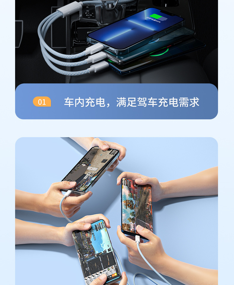 Android Xiaomi Apple Huawei vivo에 적합한 3-in-1 데이터 케이블 66W 고속 충전 1-3 충전 케이블 자동차스토어 가기