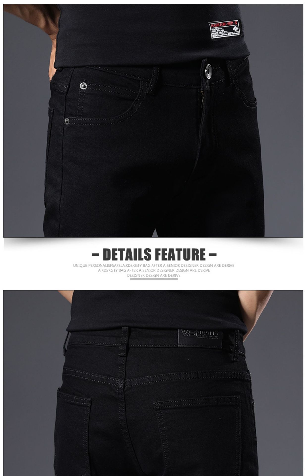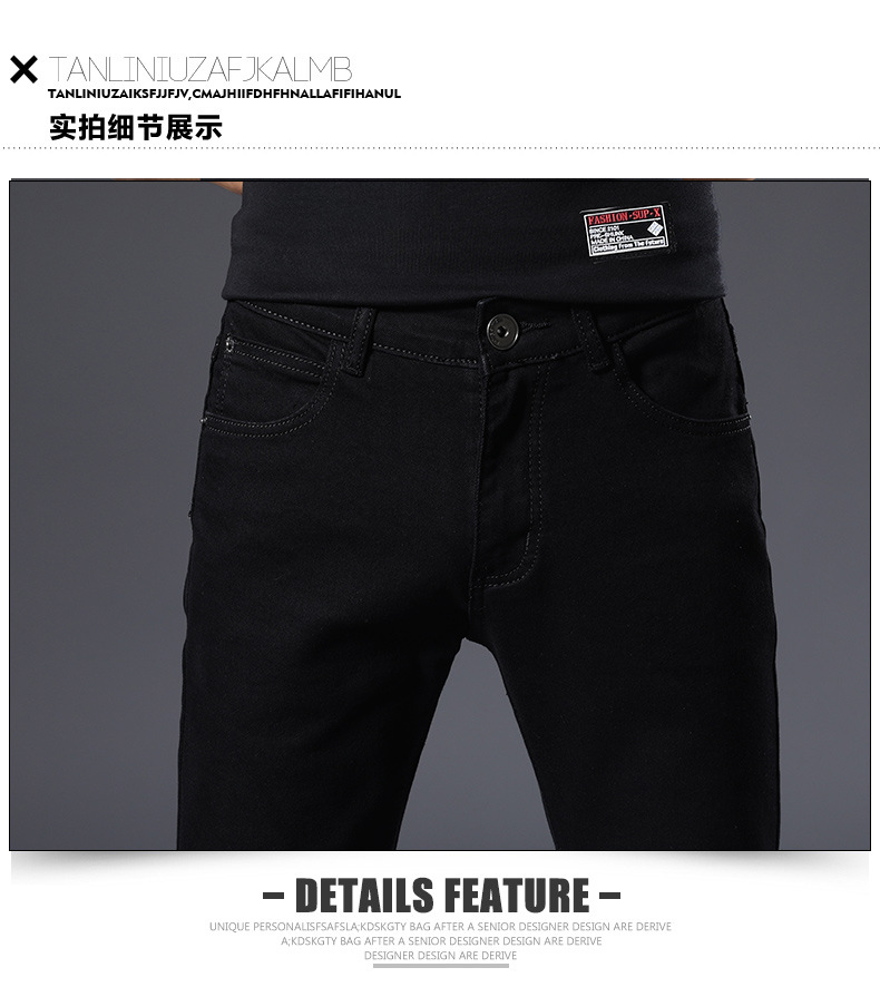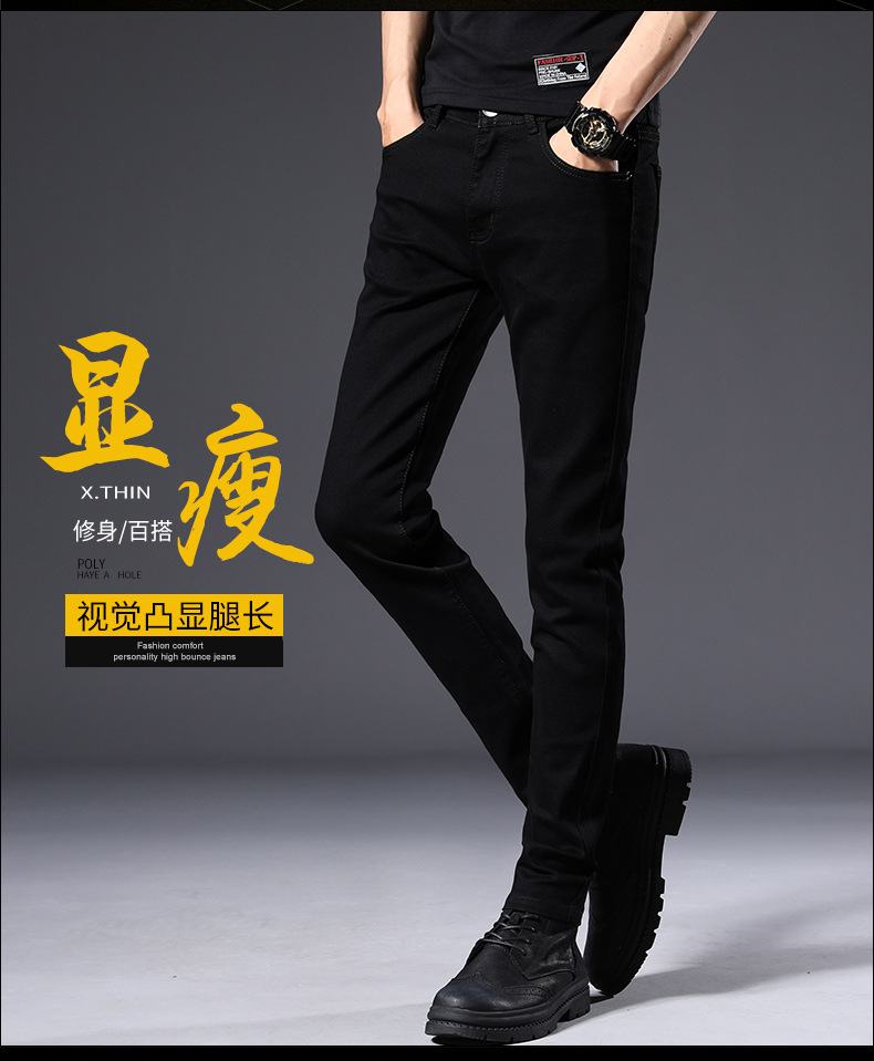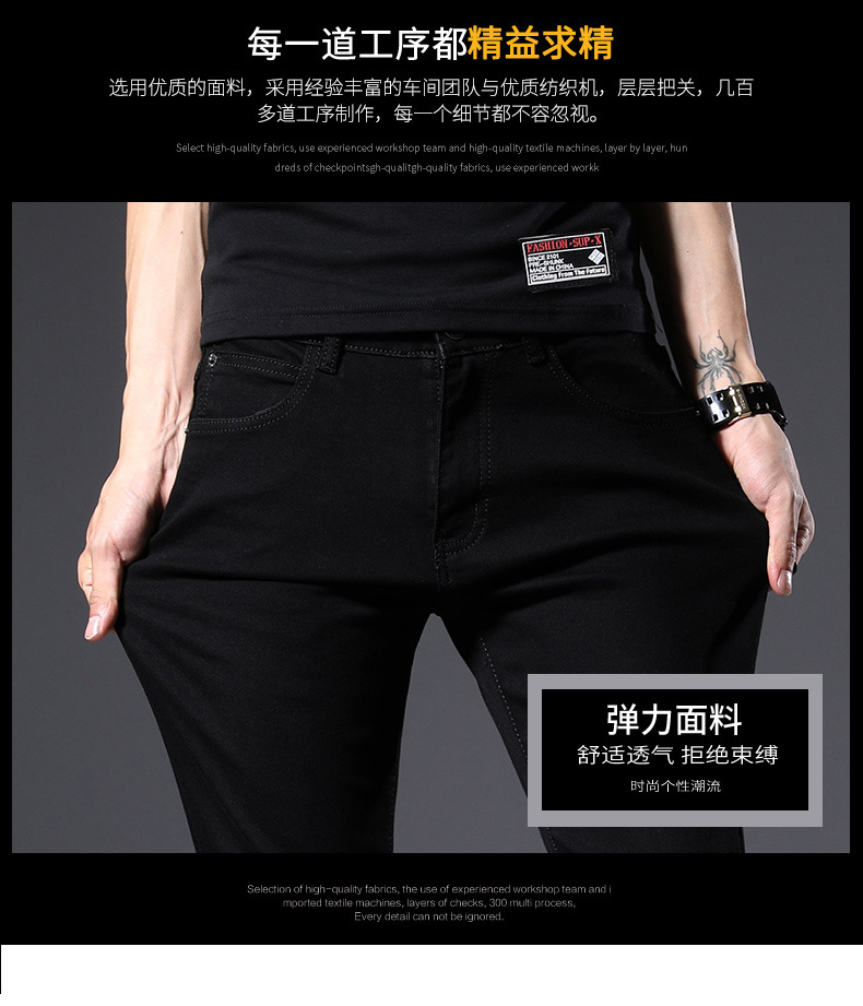 남성용 여름 신상 퓨어 블랙 청바지, 한국 스타일 트렌디 슬림핏, 슬리밍, 신축성 있는 남성용 다용도 캐주얼 팬츠스토어 가기