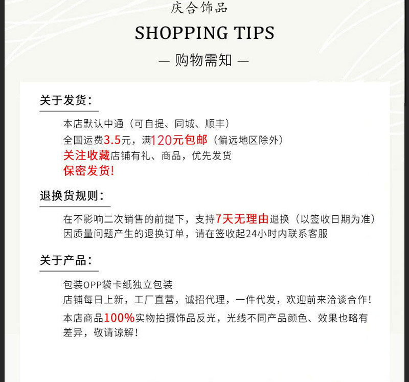 本厂专业饰品批发,产品批量生产,基本上手工加工,不同批次产品可能会有细微差异,微小瑕疵(不影响销售)无法避免,建议先拿样看货,大家都应该明白一分钱一分货的道理,不要凭自己的想像,每个人的想像都是无限大,这个我们满足不了,请见谅!对于质量非常苛刻的客户,请到专柜购买!