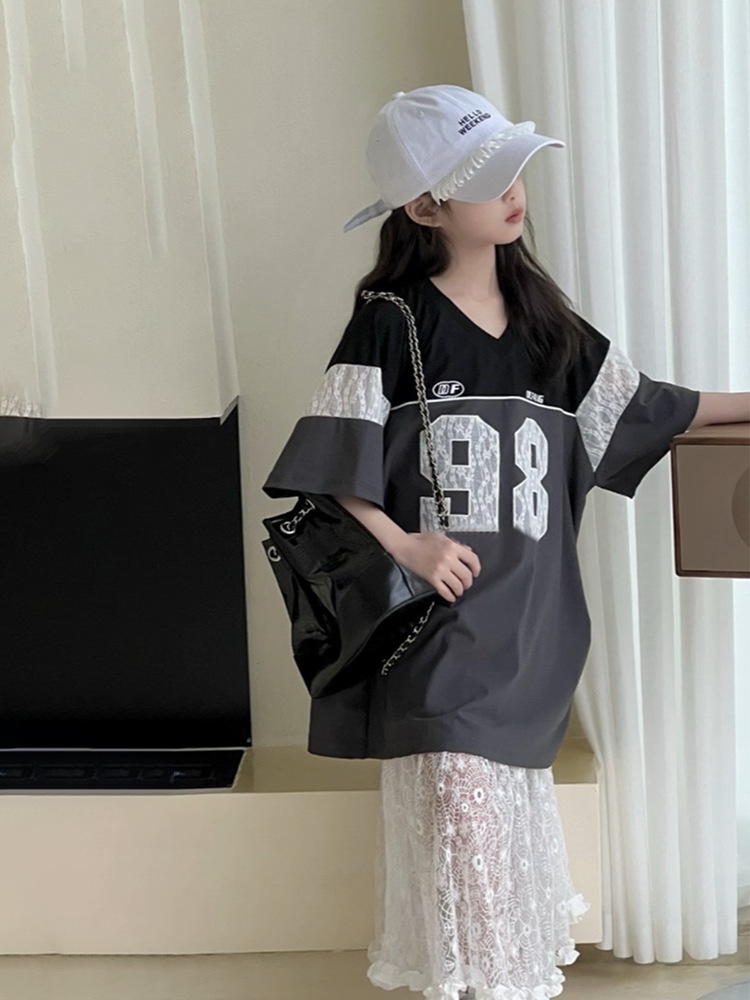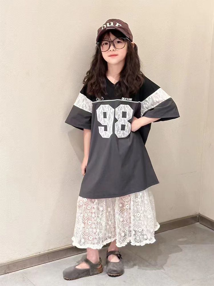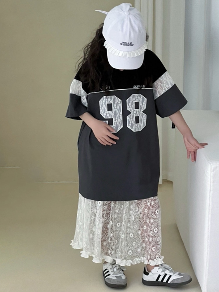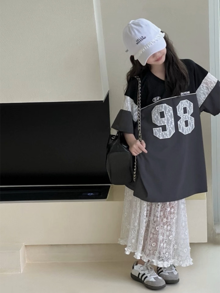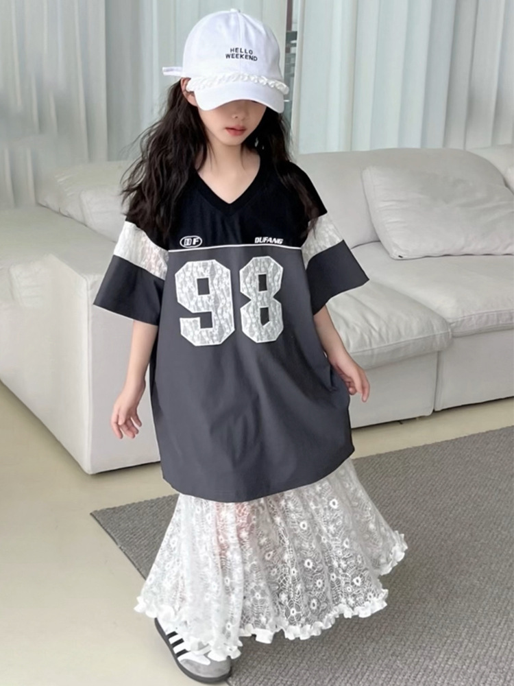 여자 세트 2025 여름 새 한국 아동복 어린이 반팔 티셔츠 반쪽 치마 소녀 투피스 세트