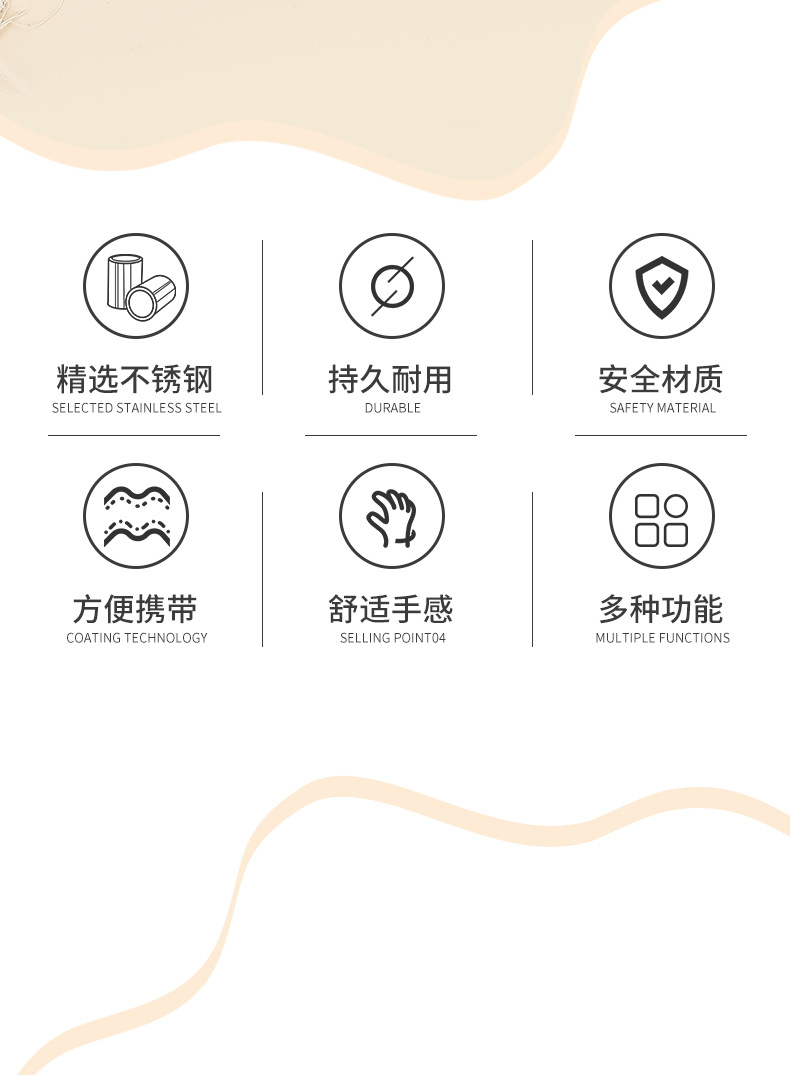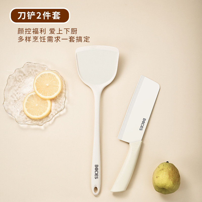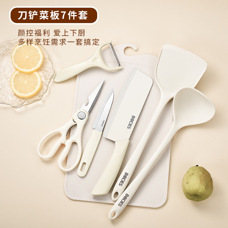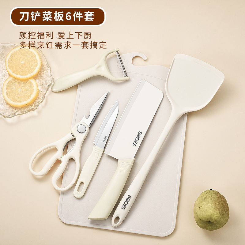 • 작은 양배추칼(칼커버 포함) + 흰색 껍질 벗기기 칼 + 흰색 포도 도마 + 일본식 과일칼 + 황백색 다용도 가위 + 흰색 실리콘 주걱 + 흰색 실리콘 스푼