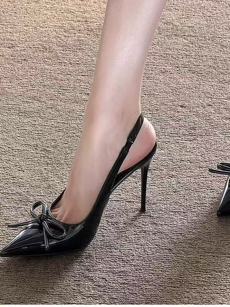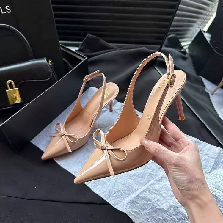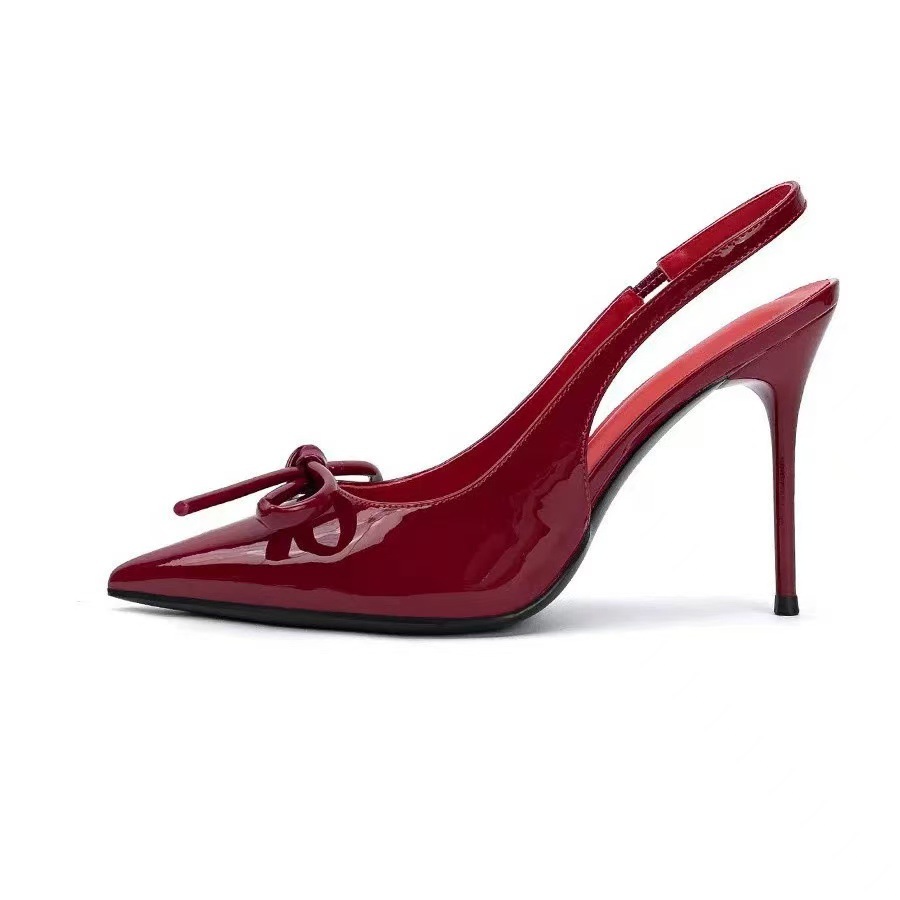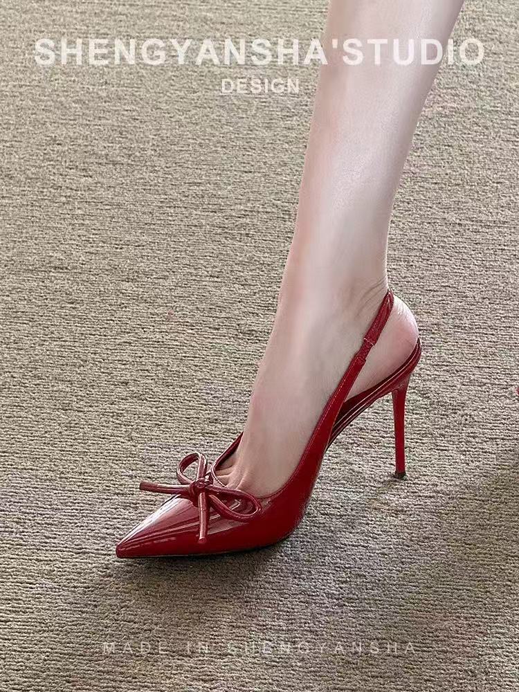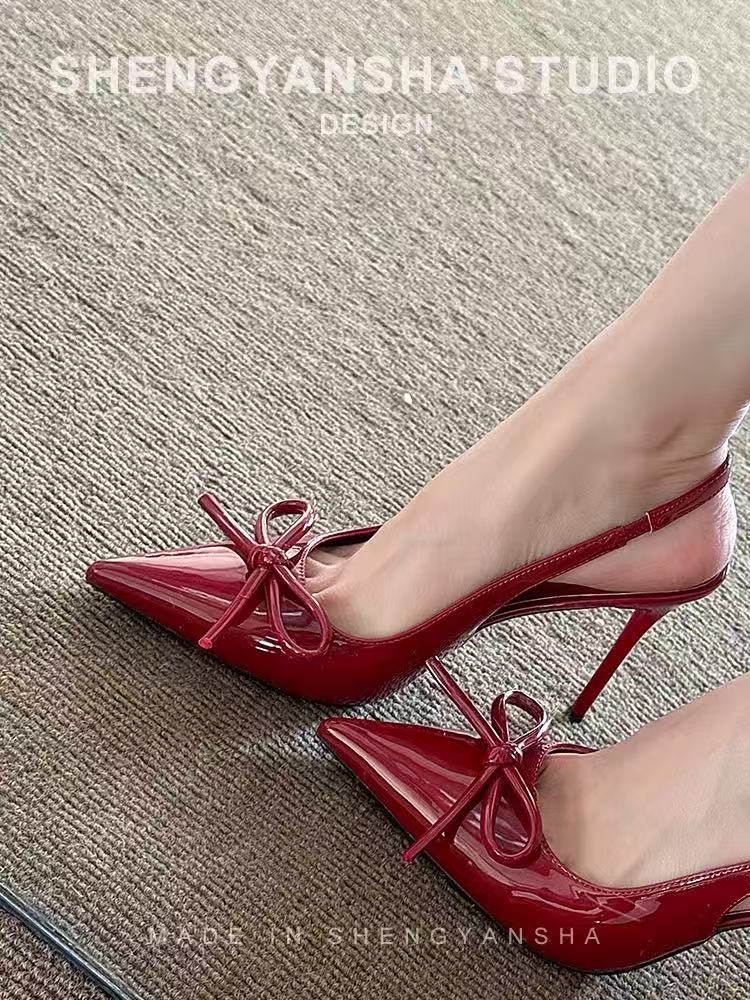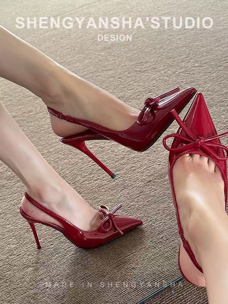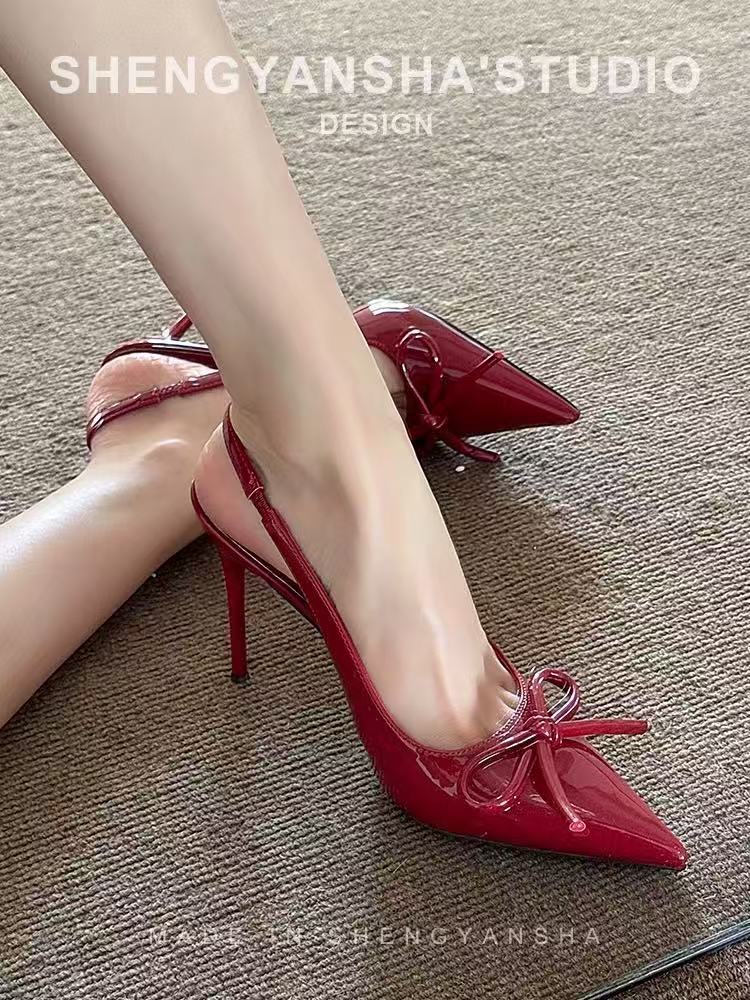 2025 하이힐 샌들 봄 여름 신상 버건디 레이커스 가죽 하이힐 여성용 리본 포인티드 토 얕은 입구 얇은 굽 샌들스토어 가기