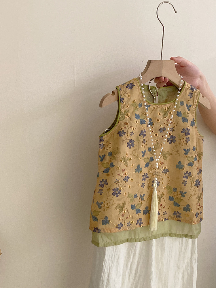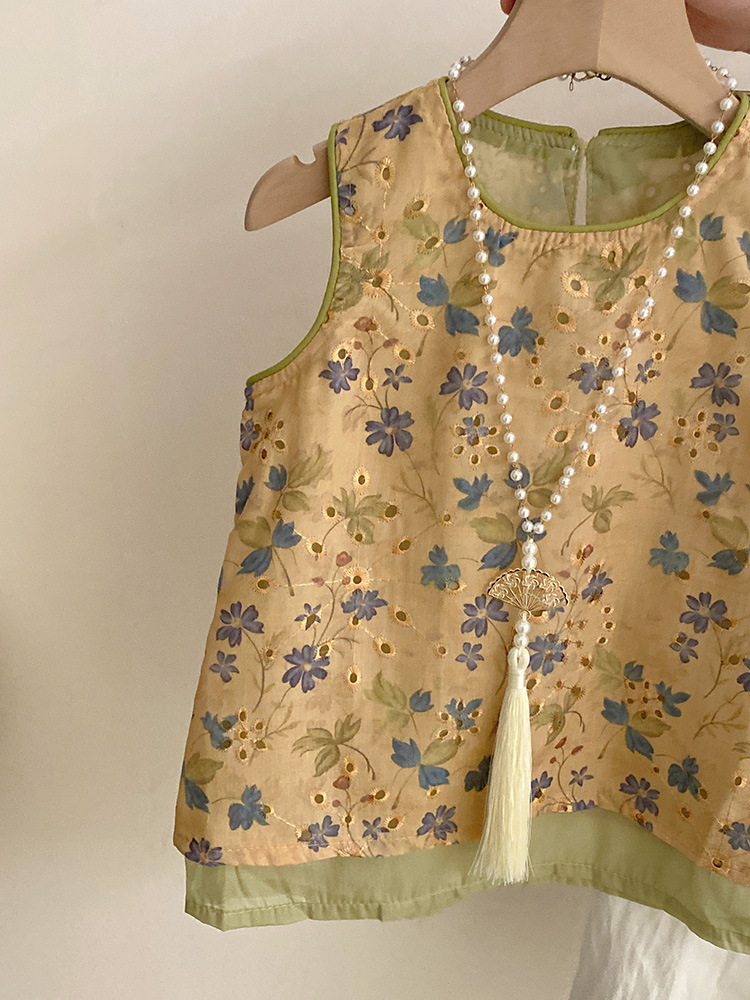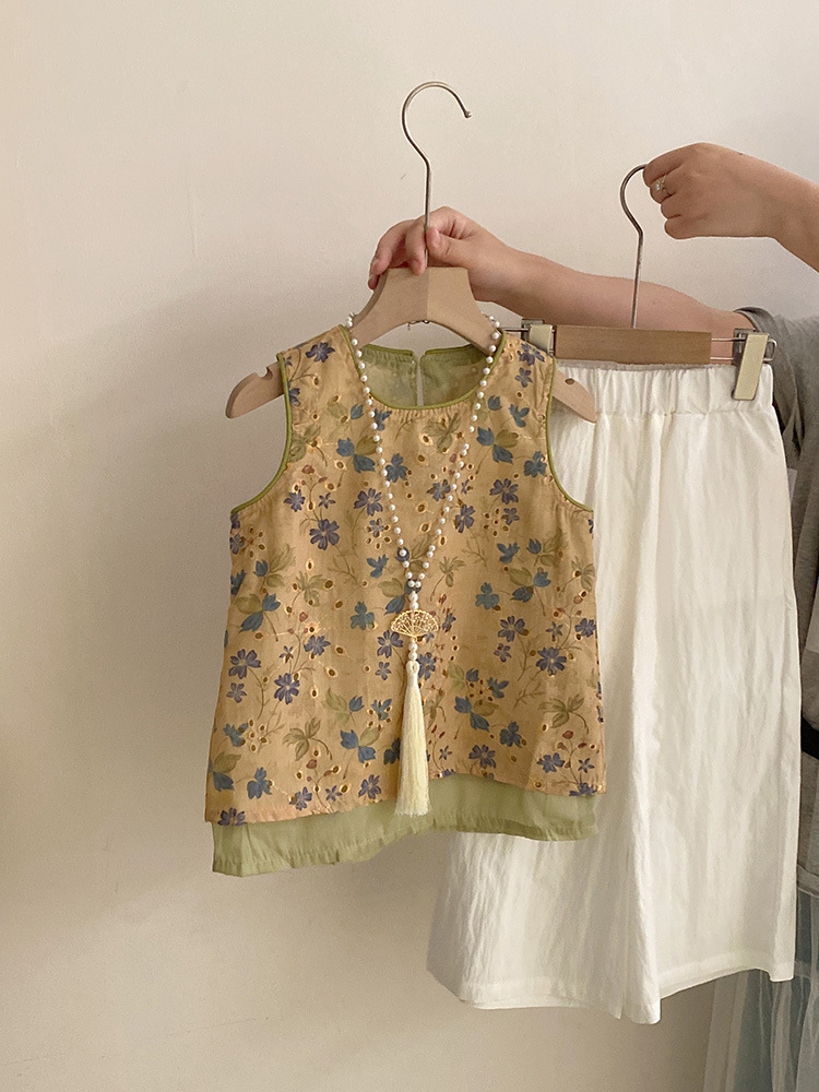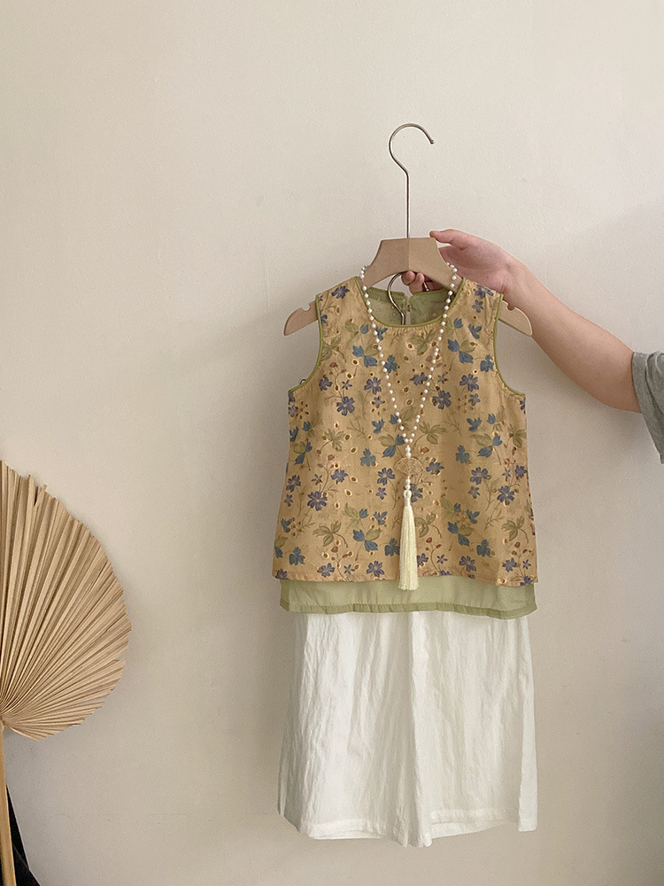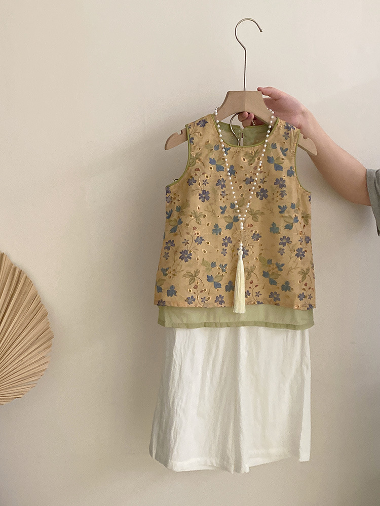 소녀의 새로운 중국 스타일 여름 새로운 꽃 민소매 톱 2025 올 매치 솔리드 컬러 캐주얼 와이드 다리 바지 2 피스 유행 세트